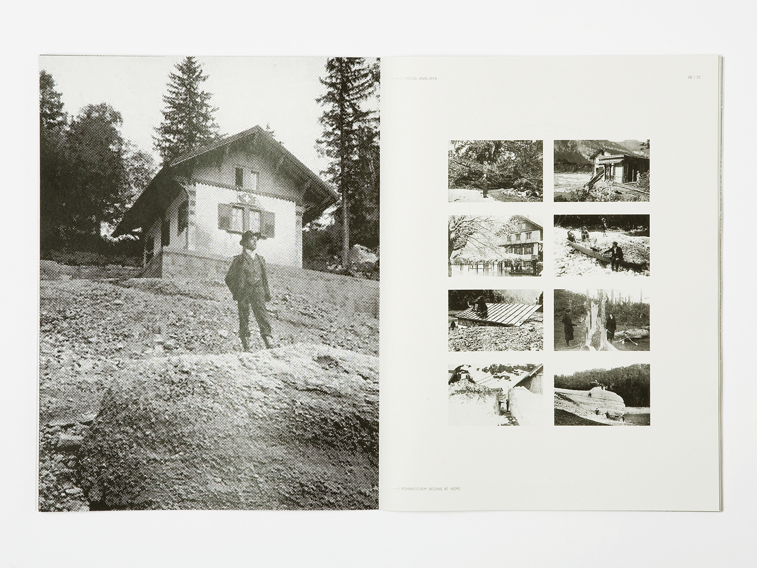 Nous sommes face à un paysage durement éprouvé. Un petit espace naturel est frappé à la fois par une avalanche de neige, un incendie, un glissement de terrain, un éboulement de rochers, une inondation et un tremblement de terre. Bientôt l'une ou l'autre catastrophe naturelle va engloutir sous elle la dernière maison de ce village, l'avaler, la balayer, la consumer. Ce scénario d'horreur est l'image qui sert de point de départ au travail 'One Risk' des trois designers Elena Rendina, Nazareno Crea et Joe Rohrer. Ils se sont colletés à l'histoire et aux conséquences des catastrophes naturelles en Suisse. Ce qui est profondément troublant dans l'image qu'on a décrite ci-dessus, c'est qu'au premier regard elle ressemble à une affiche touristique. C'est l'image d'un monde intact, inondé de soleil, avec des paysages de montagne et des maisons à pignons. Le genre d'image qui fait le charme des cartes postales. Mais si l'on regarde plus longuement, on découvre une catastrophe naturelle après l'autre. Ce paysage ravagé apparaît en diverses variations, comme affiche et comme couverture de livre. Combiné avec l'écriture et des éléments graphiques, un tel travail nous rend attentifs à différentes catastrophes naturelles et nous met en garde contre elles. Il ne s'agit donc pas simplement d'une documentation sur des scénarios d'horreur mais, au travers d'affiches, d'un livre et de courts métrages, le but est de communiquer sur le thème du risque. Le livre est constitué de douze chapitres. Il étudie divers aspects des catastrophes naturelles, par le texte et par l'image. Son écriture a été conçue par les designers eux-mêmes. Ils s'inspirent de la typographie des vieux traités de géologie, qui le plus souvent étaient imprimés par un simple traceur ne permettant que des formes simples et géométriquement construites. Ainsi l'écriture adoptée, linéaire, réduite et fine, doit évoquer ce monde scientifique. Les quatre films ont tous été tournés en intérieur. Ils représentent une manière de nature morte incolore, que vient troubler et déranger une intervention minuscule. Ils nous montrent à quel point, même dans notre environnement le plus proche, les choses peuvent aisément perdre leur équilibre.