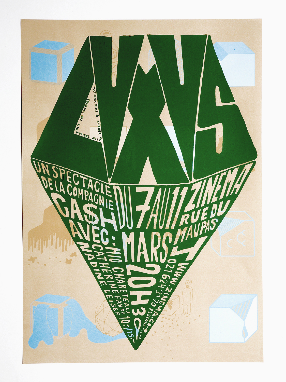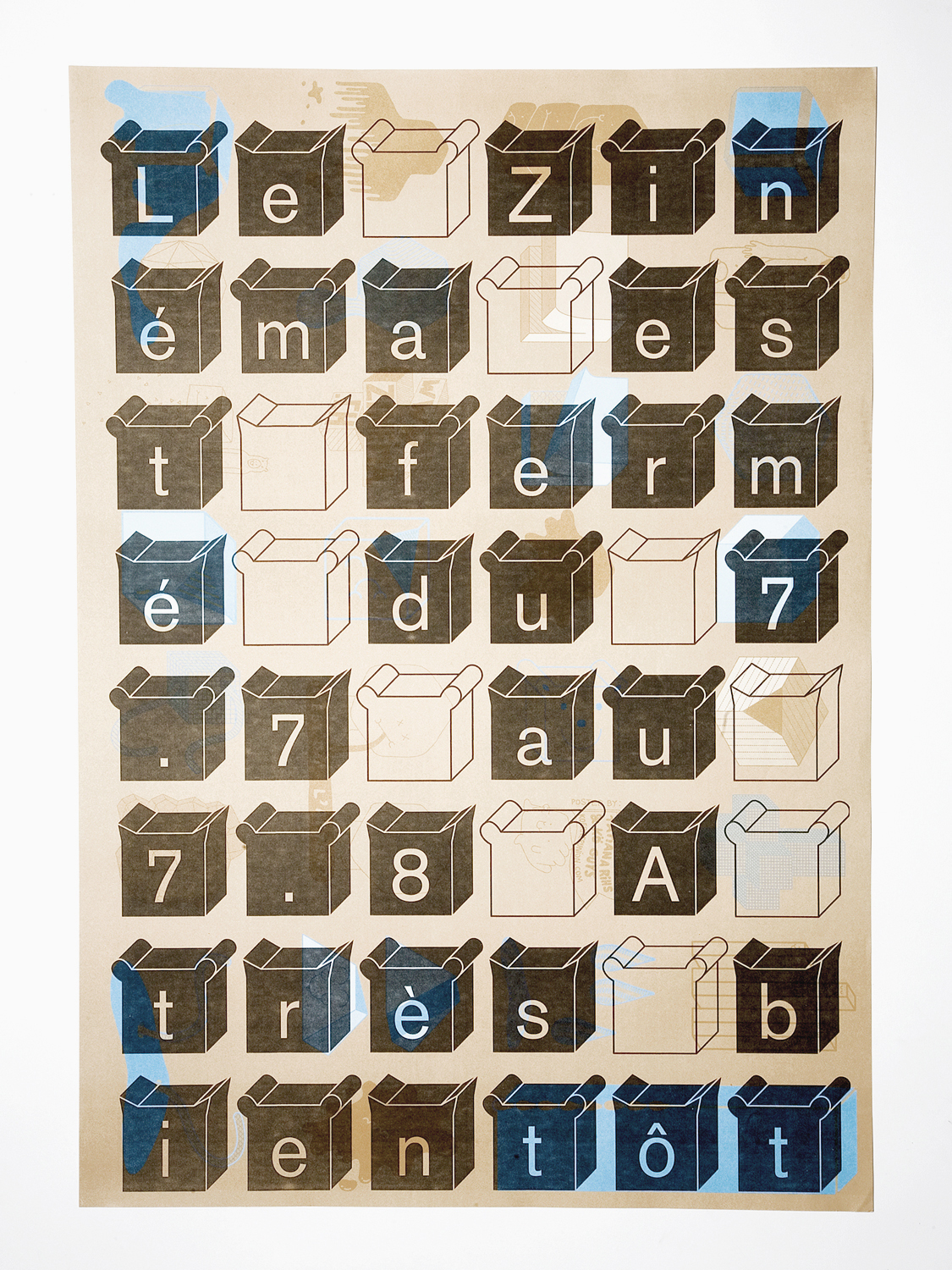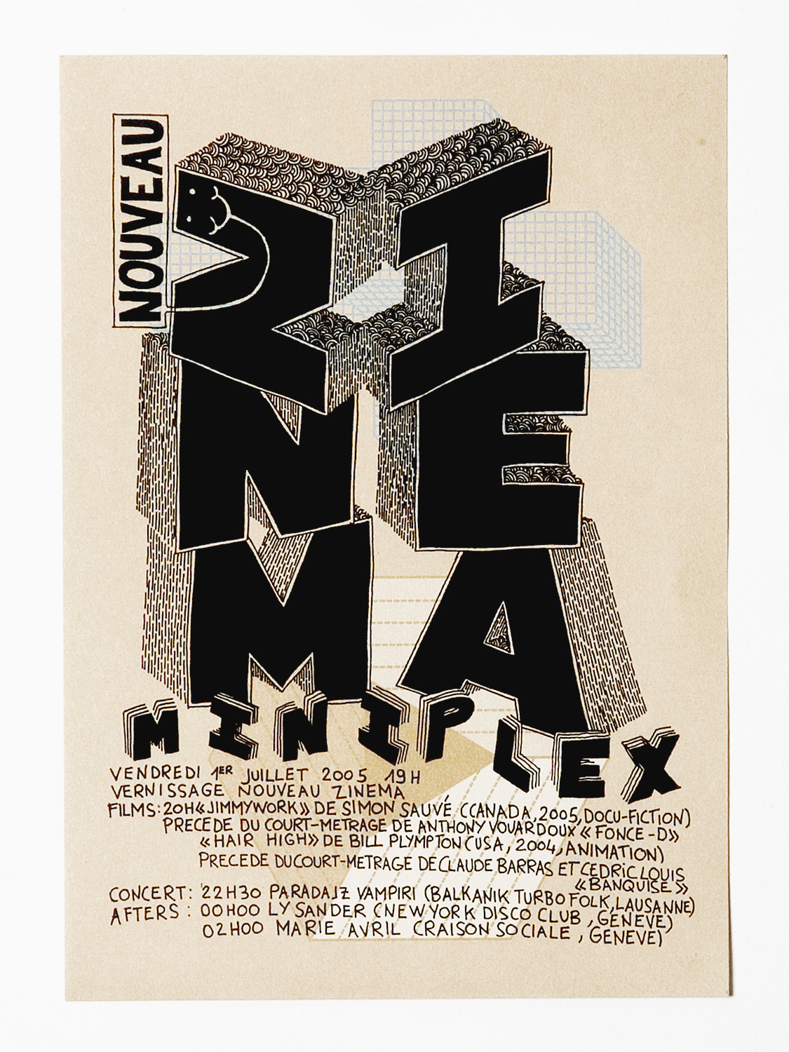 Pour le petit espace culturel alternatif 'Zinéma', à Lausanne, Tatiana Rihs et Guy Meldem ont réalisé la présentation graphique. Leur tâche était de concevoir, pour les imprimés, un système avec lequel on puisse jouer de manière rapide et peu coûteuse. Les deux graphistes, à cette fin, proposent une grande feuille imprimée, que l'organisateur peut utiliser selon la norme DIN A, du format A6 jusqu'au format A1, en la découpant et en l'imprimant dans la dimension souhaitée. La feuille est en papier brun, et dessinée de formes beiges, bleu clair et blanches, qui s'inspirent du logo existant. Il s'agit de cubes qui fondent et se métamorphosent, symbolisant la diversité de cette institution culturelle. Si l'on découpe la feuille dans ses différentes dimensions DIN A, ces illustrations restent toujours centrées. Sur ce fond, les graphistes réalisent des affiches, des flyers et d'autres imprimés. Selon la manifestation, ce peut être 400 flyers ou seulement quelques affiches. Et selon l'importance de l'occasion, le nouveau contenu est copié ou imprimé par procédé laser ou par sérigraphie. Cela permet à l'organisateur d'agir rapidement et à peu de frais, et une fois réalisé un investissement initial de 3000 feuilles DIN A1, ses dépenses restent maîtrisées. Le design peut se rattacher délibérément à l'arrière-plan, et un dialogue naît alors entre celui-ci et l'information de la manifestation. C'est ainsi qu'une bulle imprimée, qui se rapporte à une figure de l'arrière-plan, annonce une manifestation; ou bien un cube qui s'ouvre est imprimé sur un cube du fond, qui est fermé. Mais un design peut aussi être imprimé sur toutes les parties de la feuille, et c'est ainsi que grâce à l'arrière-fond multiple naissent différentes variations du même flyer. Pour le contenu, les graphistes déduisent leur motif soit de la manifestation annoncée, soit du logo, soit des deux. La mise en forme de Tatiana Rihs et de Guy Meldem est illustrative et directe. Cela confère à cette présentation, si variée soit-elle, une écriture à la fois vivante et reconnaissable. Un tel graphisme convient au lieu et à la scène.