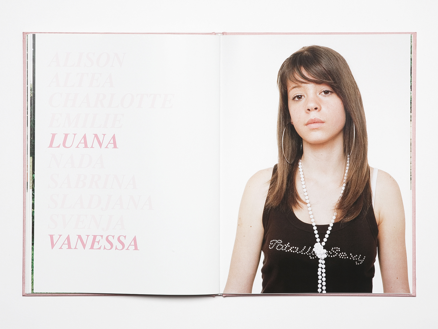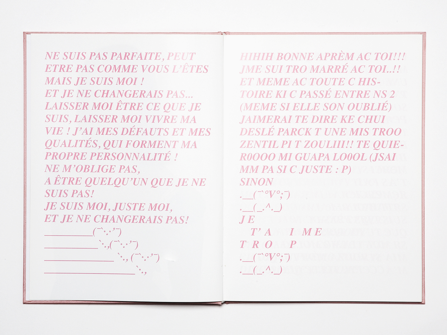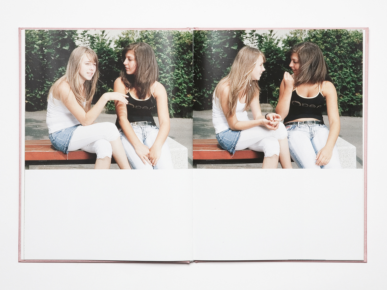 La photographe Jennifer Santschy a commencé par étudier des blogs que les jeunes filles utilisent pour se présenter et s'exprimer. Des espaces à la fois intimes et publics. Les jeunes filles et les jeunes femmes recourent à des photos et à des textes écrits par elles, dans la langue abrégée et codée du blog. Ces autoportraits ont ému la photographe et elle a décidé de faire à son tour le portrait de dix de ces jeunes filles qui toutes s'entraînent dans le même groupe de danse. Le travail intitulé '<LOL*>' réunit dans un livre des images et des textes de jeunes filles âgées de 13 à 16 ans. '<LOL*>' fait allusion à la formule souvent utilisée dans les blogs et qui signifie: 'Laughing Out Loud'. Le livre comporte deux espèces de photographies, qui jettent des regards différents sur les sujets portraiturés: les autoportraits, pris sur fond blanc en studio, et les photos de groupes, réalisées en différents lieux. Les photos de studio montrent des adolescentes, entre la jeune fille et la femme, dont les poses s'inspirent de celles des mannequins. Elles essayent d'apparaître charmantes et sexy – ce qui donne une impression étrange, parce que deux mondes se croisent ici, celui des magazines de mode luxueuse et celui des adolescentes qui se représentent elles-mêmes. Les photos de groupe, au contraire, apparaissent plus naturelles, et montrent les jeunes filles dans une attitude et une atmosphère détendues. Elles parlent avec des amis, échangent des regards, plutôt que de fixer la caméra en face, comme dans les photos de studio. Jennifer Santschy a capté, dans ses photographies, des moments d'intimité et d'amitié. Dans son livre, elle a inséré, parmi les images, des textes écrits en grosses lettres roses. Ces textes sont difficiles à comprendre pour les non-initiés, et l'on s'approche d'eux comme d'une langue étrangère que l'on ne domine pas encore trop bien. '<LOL*>' est un témoignage de notre temps, sur un groupe de jeunes filles pour lesquelles la représentation de soi-même dans les médias publics appartient à la quotidienneté.
