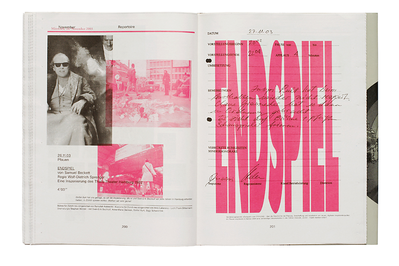 'O. T. Ein Ersatzbuch' résume ses trois années d'activité pour le Schauspielhaus de Zurich. La structure de base de cette rétrospective, c'est la disposition chronologique de photographies de scènes théâtrales caractéristiques. Confrontées à chaque fois avec une image tirée du quotidien gratuit '20 minutes', quatre années de théâtre sous la direction artistique de Christoph Marthaler sont données à voir d'une manière singulière, dans un espace de référence actuel et public. De même, 'Bekanntmachungen' offre une clarté maximale malgré sa grande hétérogénéité. Il s'agit d'un catalogue d'exposition qui archive le riche matériau iconographique et textuel de l'exposition '20 Jahre Studiengang Bildende Kunst SBK der Hochschule für Gestaltung und Kunst Zürich', à la Kunsthalle de Zurich. De même encore, 'Cneai=neuf ans', une documentation qui embrasse les activités et les publications des neuf dernières années du Cneai, l'institution artistique parisienne. C'est précisément avec ce genre de projets mammouth, qui nécessitent une grande quantité de temps, d'engagement et d'énergie, que Trüb parvient de la manière la plus remarquable à insérer dans une structure hautement cohérente une masse énorme de matériaux et d'idées. Sans doute, tout cela peut se découvrir et se lire très vite, mais à chaque fois, d'une manière merveilleusement dérangeante, ce flux est interrompu par des pages blanches ou par de petites dérogations aux règles. Si ce brillant graphiste est confronté à de grands noms comme Peter Saville ou Marc Camille Chaimowicz, son envolée créatrice est à chaque fois garantie. Le jury, impressionné par ses prestations exceptionnelles et par sa créativité débordante, n'a qu'un mot: chapeau !