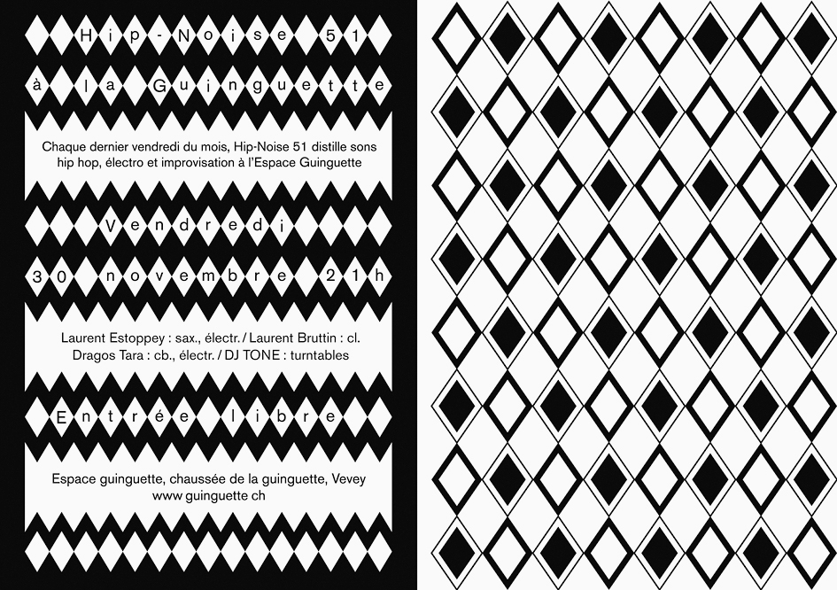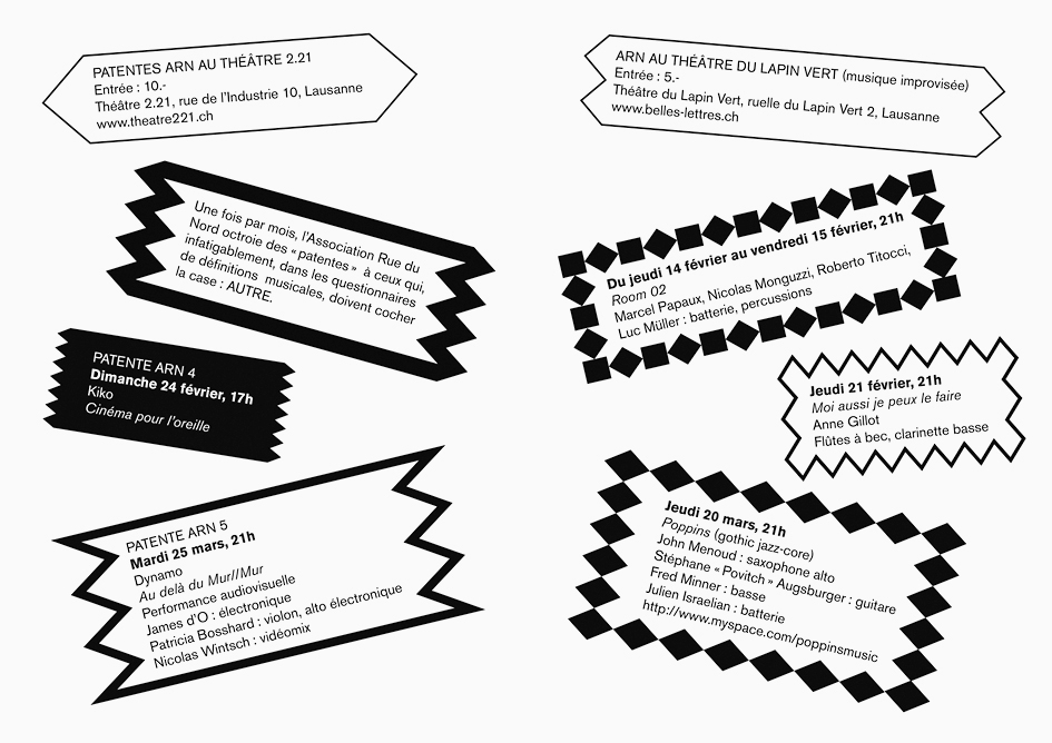 Les affiches, programmes et fascicules paraissant tous les deux mois pour 'Rue de Nord' à Lausanne, un espace où sont organisés des concerts de musique expérimentale, constituent un travail de commande réalisé en collaboration avec Mélodie Mousset. L'ensemble de cette série d'imprimés se caractérise par l'emploi d'éléments graphiques récurrents, pierre angulaire du concept par lequel Tatiana Rihs contribue à l'identification de ce lieu de manifestations. Les formes en losange et en zig-zag sont reprises différemment d'une fois à l'autre, ce qui permet à la graphiste de renouveler à chaque fois les supports d'informations.