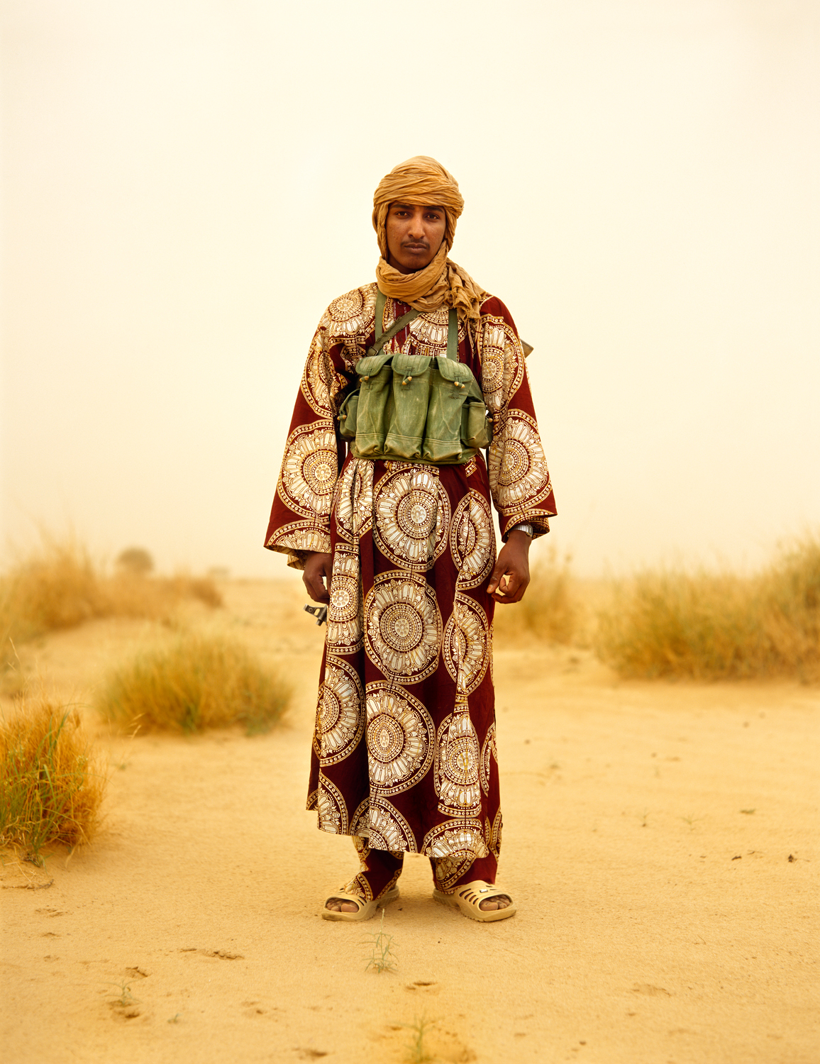 Comment documenter correctement la vie des rebelles du Sahel? Le Lausannois Philippe Dudouit a choisi la classique photographie de reportage pour aller à la rencontre d'une terre qui fait partie des régions les plus pauvres et les plus inhospitalières du monde, nommant son projet 'Sahel – The Dynamics of Dust'. En 2008, il a passé trois mois avec les rebelles touaregs, au nord du Mali et du Niger, et depuis, il y retourne de temps à autre – le projet est un 'work in progress'. Dudouit ramène des images saisissantes de cette zone de conflits oubliée. Lorsque les anciens nomades du Sahel se sont sédentarisés, le trafic d'armes et de drogue a pris le dessus. Le tourisme a fini par s'effondrer totalement; des groupes d'islamistes fondamentalistes viennent recruter leurs jeunes troupes dans ces régions, des groupes de rebelles combattent contre les gouvernements centraux du Mali et du Niger. Philippe Dudouit évite de céder à la fascination de l'exotisme et crée des photos sereines, dénuées de sensationnel. Une épave d'avion dans le désert, une tour renversée et déjà à moitié engloutie par le sable, un tank échoué dans la cour d'un bâtiment avec, à côté, des soldats en arme. Ses portraits, d'enfants et de jeunes souvent, sont pleins de tact. Un jeune homme pose fièrement, portant un vêtement de batik rouge brun, un turban beige et des sandales de plastique blanches. La photo n'a rien de spectaculaire. Ce n'est qu'au deuxième regard que l'on remarque le sac militaire sur sa poitrine, probablement rempli de munition. Une autre photo montre Mohammed, jeune homme au turban vert, tongs bleues et T-shirt rouge orange avec l'inscription 'King's County'. Lui – et cela non plus, on ne le voit pas d'emblée – tient en mains une Kalachnikov. Il se dit 'indépendant' et vit dans le nord du Niger, dans une zone où sévissent les rebelles et une guerre civile largement ignorée de l'Occident. Les photos de cet artiste, formé à l'Ecole de photographie de Vevey, sont tranquilles, mais impressionnantes. Elles demeurent gravées dans notre mémoire.