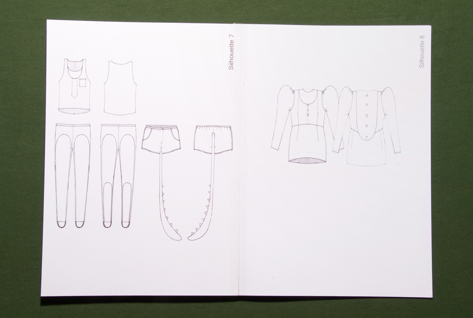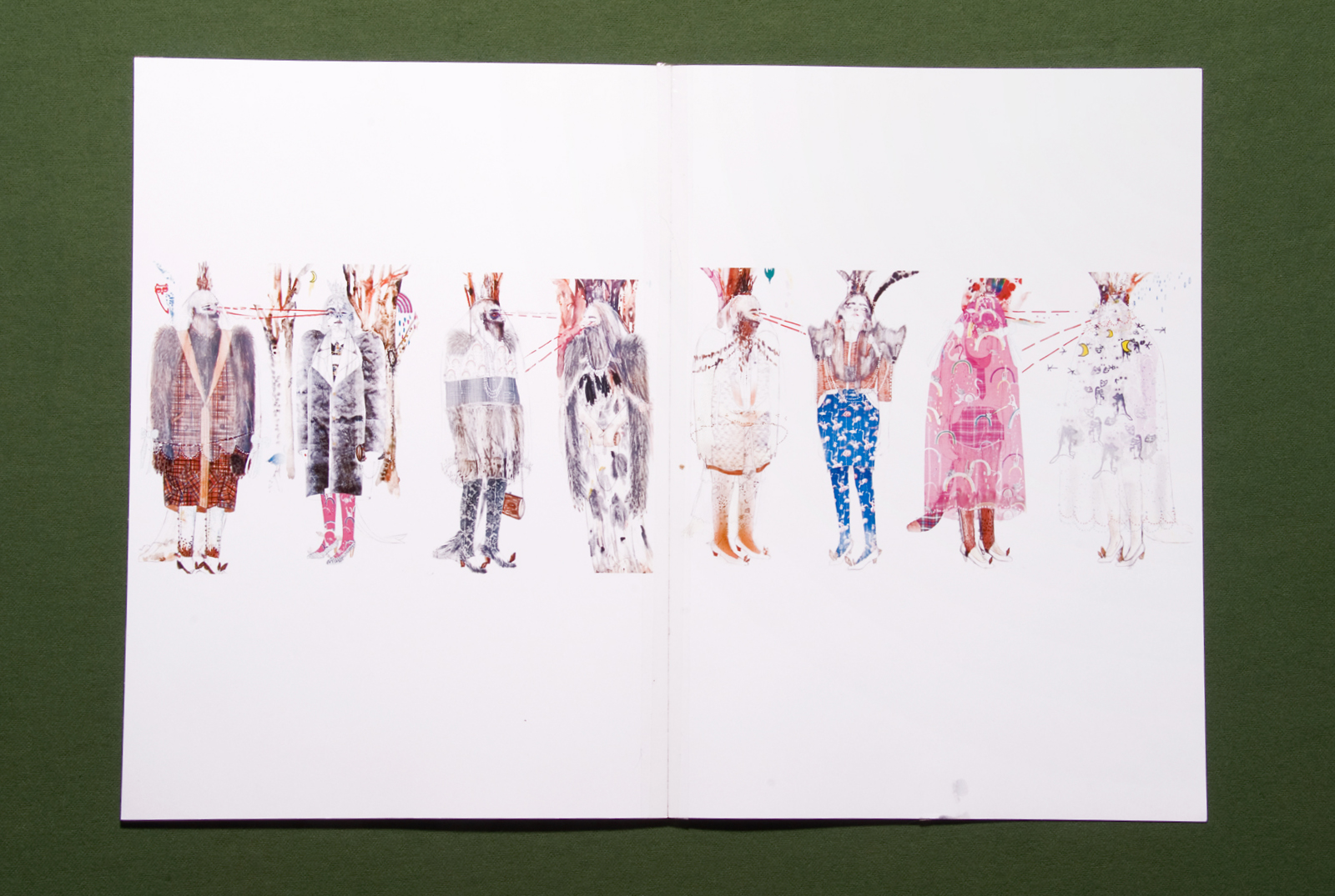 Afin d'ordonner toutes les impressions provoquées par ces boîtes magiques, il vaut de consulter le carnet de travail de la jeune styliste de mode. Dans ses pages et les somptueuses illustrations débordant d'imagination, on découvre l'origine et l'histoire de cette collection. Elle parle de couples d'amoureux qui s'enfuient de Las Vegas et se réfugient au plus profond de la forêt. Là, dans la forêt enchantée, règnent les animaux: 'Les griffes sortent, la fourrure émerge de sous une blouse de soie légère, la terre et les prismes dévorent les ourlets des pantalons, une épine dorsale naît...'. Portant de longs voiles, les femmes et les hommes (les tenues sont conçues par paire) errent dans la forêt et collectent des objets qu'ils piquent dans leurs diadèmes. Leurs yeux lancent des rayons laser et ils échangent des regards intenses, puis ils se disent 'Je t'aime'.