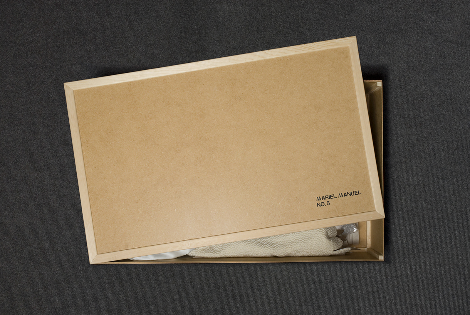 Mariel Manuel présente une collection de 8 éléments dans des boîtes de bois à l'allure de cercueils. Les tenues reposent, bien pliées, dans ces boîtes fermées et, à l'ouverture, un monde magique surgit: des pattes d'ours, des bûches ornées de colliers de perles, des têtes et des queues de renards, de merveilleuses impressions de couleurs sur des tissus et des collants délicats, des voiles de mariée blancs et roses, des diadèmes richement ornés, des chaussures extravagantes et bien d'autres choses encore.