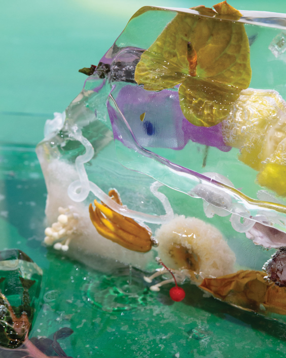 Le travail de Johanna Hullár semble magique. L’artiste crée un environnement immersif aux couleurs acidulées avec des mini-organismes figés dans l’image ou dans des blocs de glace. Ces natures « mortes » prennent vie (moving still-life) lorsque la glace fond. Travaillant entre photographie, vidéo, installation et sculpture, Hullár explore les métamorphoses et transformations des organismes, jusqu’à leur décrépitude et mort.