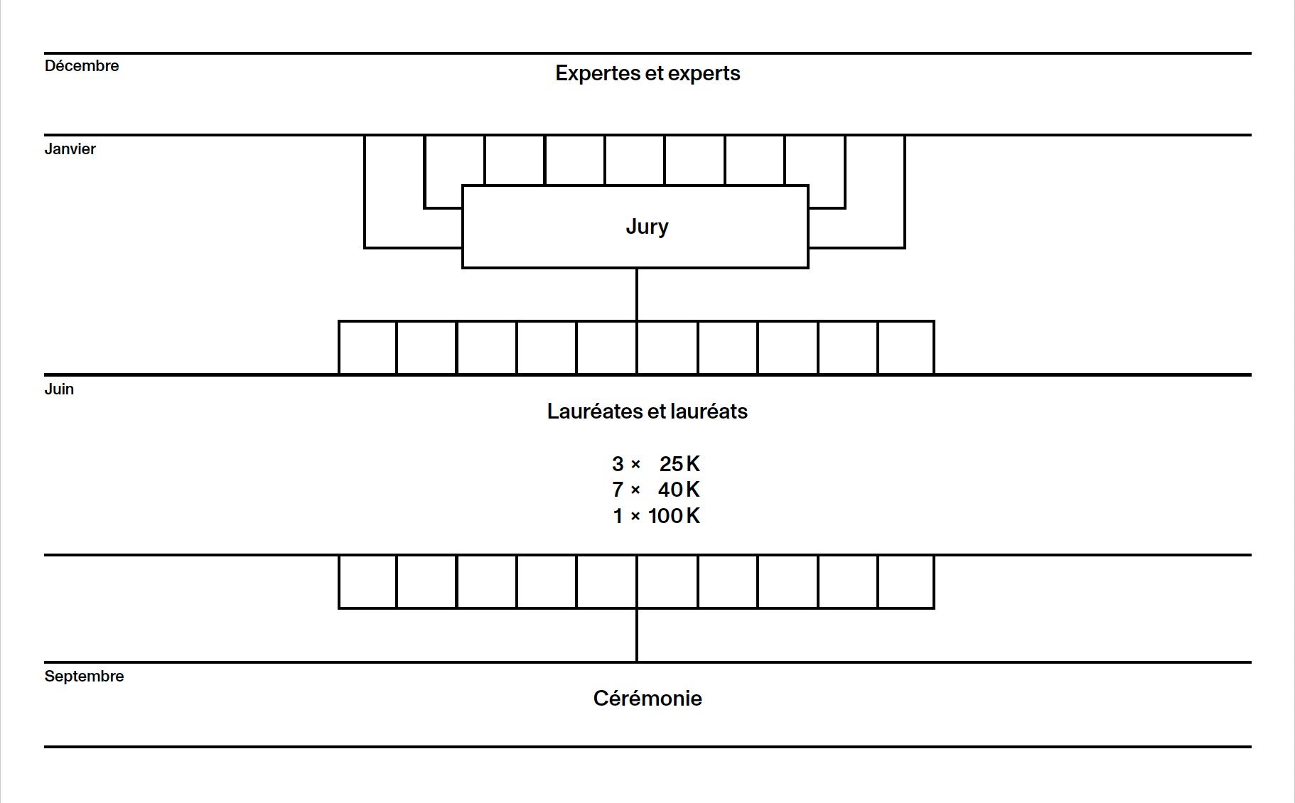 Au début de l’année, les sept membres du Jury fédéral de musique sélectionnent 11 lauréates et lauréats parmi les personnes proposées. Le choix du jury se fonde sur la haute qualité de la création musicale des artistes, leur capacité d’innover, de se remettre en question et de se réinventer constamment ainsi que sur leur rayonnement national et international. Le Grand Prix suisse de musique est doté d’un montant de 100 000 francs, les Prix suisses de musique de 40 000 francs chacun et les Prix spéciaux musique de 25 000 francs chacun.