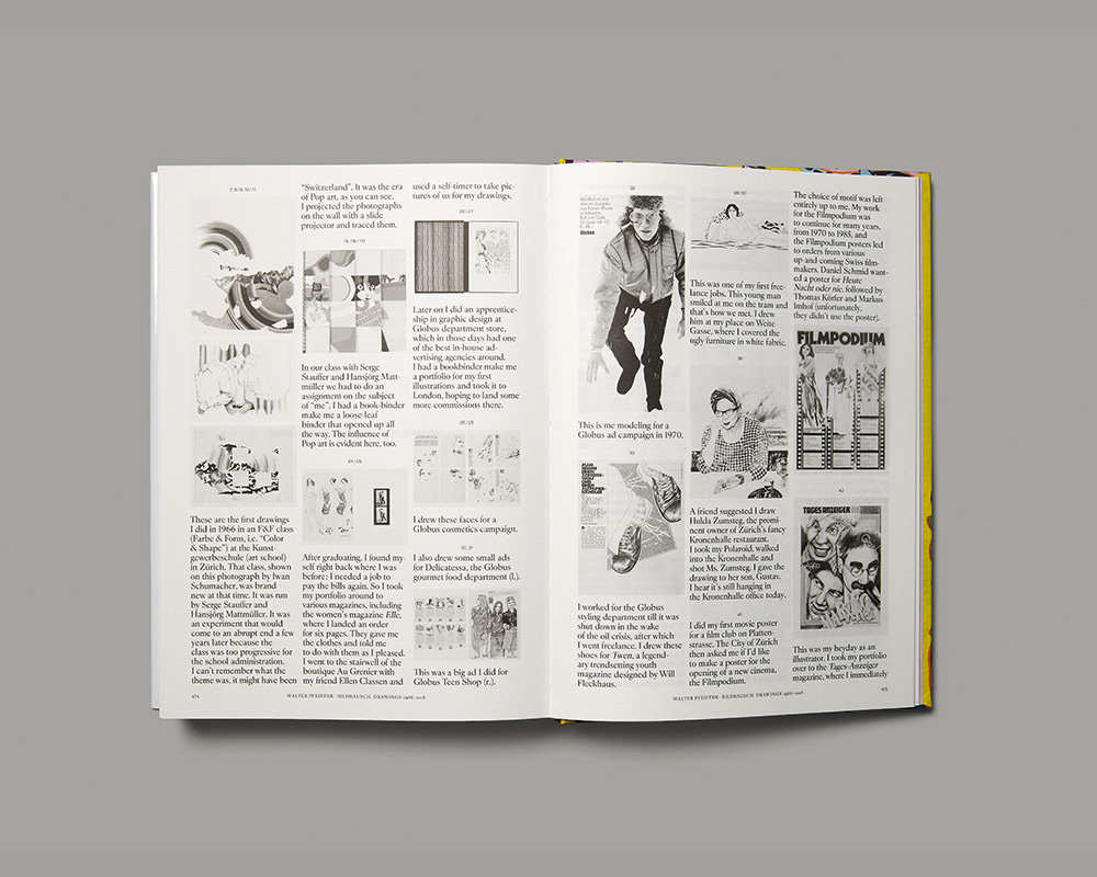 L’œuvre dessiné, inconnu jusqu’à présent, du photographe zurichois Walter Pfeiffer, âgé de 72 ans, se trouve présenté dans un ouvrage illustré de grand format, dont la couverture est un vrai foisonnement de couleurs, et qui se distingue par un traitement conceptuel virtuose de l’image. Les grandes reproductions des dessins dont l’ensemble couvre plus de 50 années, dans des techniques variées, sont le plus souvent isolées, ou deux par double page, selon leurs formats, si bien qu’il en résulte une séquence linéaire. Cette séquence est principalement chronologique, mais elle introduit parfois des sauts temporels et des répétitions. En outre, on assiste à des moments de mise en abyme, quand des photos de dessins, sur une ou deux pages, se trouvent insérées dans les contextes spatiaux, montrant par exemple Walter Pfeiffer en train de dessiner. Ces mises en contexte, dans les livres d’art, apparaissent souvent conventionnelles, mais ici, elles contribuent à une relation narrative saisissante entre la personne et l’œuvre, relation soulignée à la fin par de brefs commentaires du photographe à propos de quelques œuvres. La typographie, complètement absente des pages illustrées, opère avec une combinaison inhabituelle de trois polices de caractères, parmi lesquelles une Eurostile. Le travail graphique n’est pas plaqué sur l’œuvre, mais fait corps avec elle. La lithographie, l’impression et surtout le rendu des couleurs sont exceptionnels.