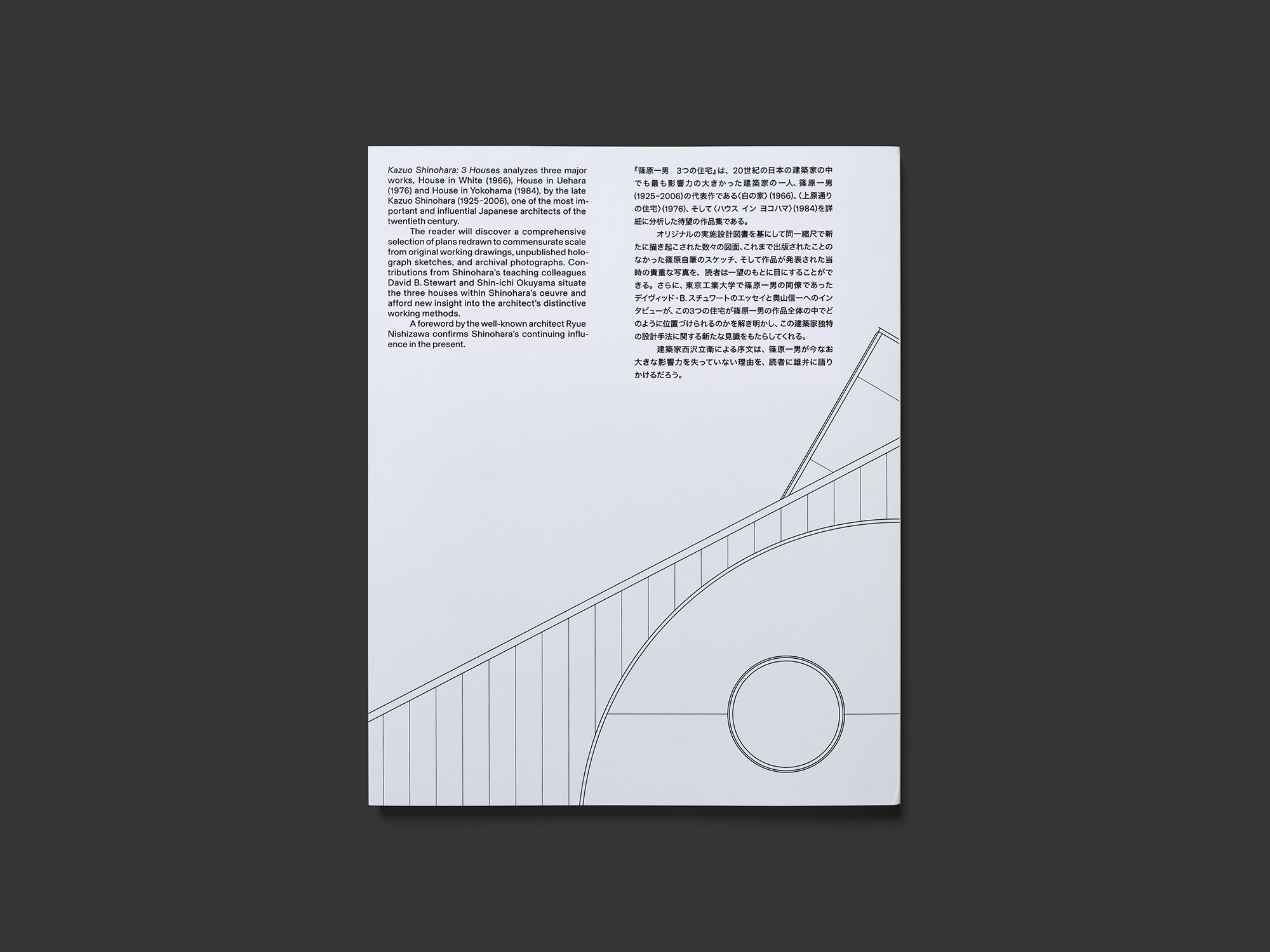 Cet ouvrage broché, essentiellement en noir et blanc et de très grand format, présente trois œuvres issues de différentes phases créatrices de l’architecte japonais Kazuo Shinohara (1925–2006), dans un design somptueux, très élégant. La jaquette d’aspect graphique; des plans extrêmement détaillés, redessinés; des photographies en noir et blanc magnifiquement reproduites; ici et là, des croquis de couleurs pâles; des feuillets colorés pour séparer les parties du livre; des textes courts en grands caractères, en allemand et en japonais: toutes les parties sont traitées indépendamment; mais additionnées, elles forment un ensemble harmonieux. Une section finale plus longue, avec des textes sur deux colonnes justifiées, est animée grâce à une disposition inhabituelle, mais très belle, des illustrations de référence. Quelle que soit l’approche, cette architecture est présentée avec générosité et sympathie, si bien qu’elle apparaît attrayante et parfois même sensuelle. Le livre s’adresse donc à un lectorat qui va bien au-delà du public spécialisé. Cinq designers, pas moins, ont contribué à cet ouvrage. Voilà qui montre l’ampleur du travail accompli, dans un extrême souci du détail.