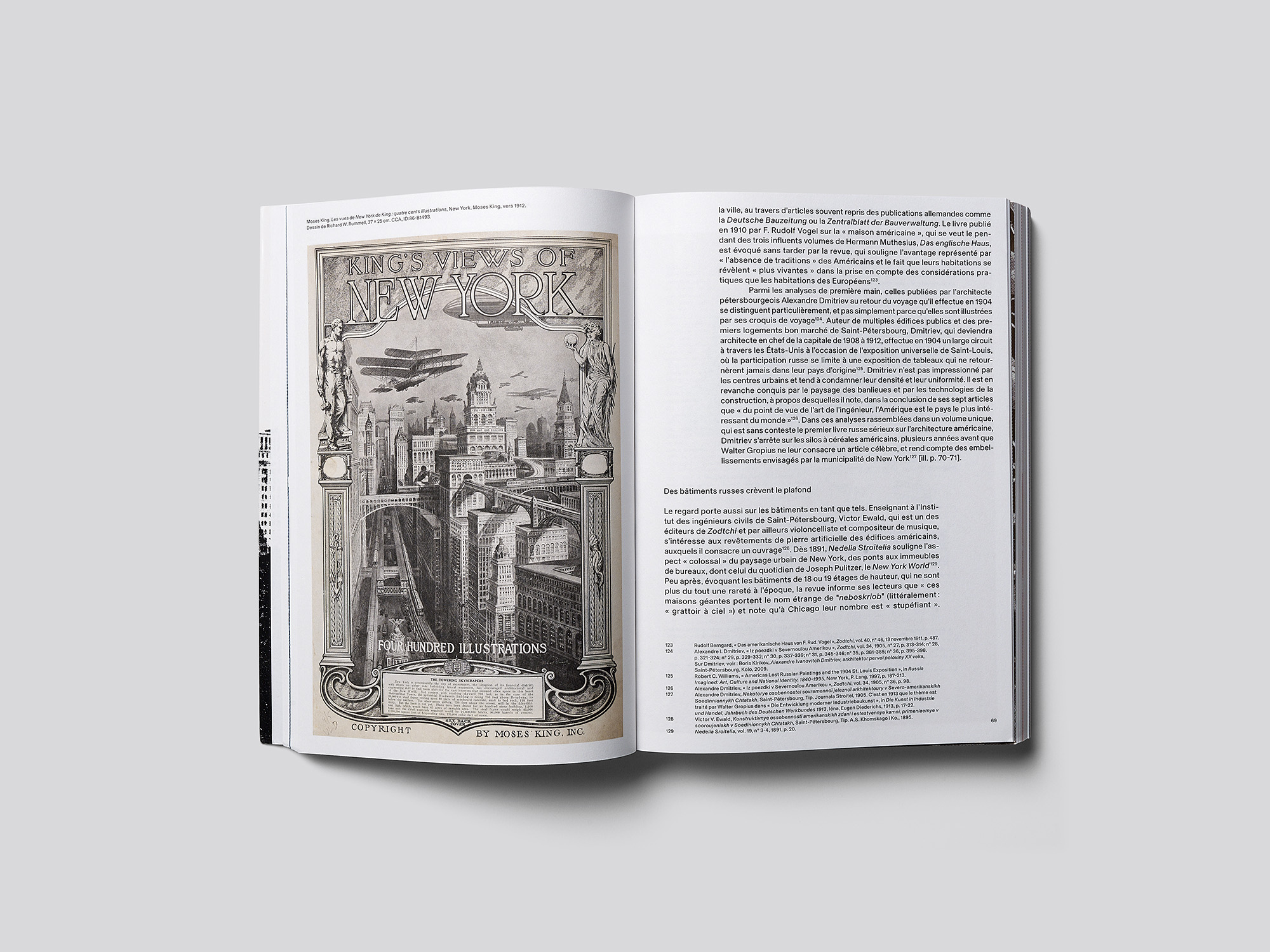 Dans une étude de l’historien de l’architecture français Jean-Louis Cohen, qui retrace comment les différentes images de l’Amérique ont influencé l’architecture russe entre 1861 à 1991, la vaste matière est rendue particulièrement accessible grâce à une structuration et une organisation optimales. L’ouvrage, maniable et à la couverture souple en noir et blanc, suit une trame chronologique organisée en six chapitres qui vont du tsarisme à la fin de la Guerre froide en passant par la révolution et les différentes phases du stalinisme. Les parties textuelles sont illustrées d’exemples éclectiques empruntés à l’art, à l’architecture, aux médias, etc. Des séquences purement visuelles de huit pages, présentées chacune dans une couleur différente, introduisent chaque chapitre. Les images, qui sont à fond perdu et possèdent souvent une trame grossière, sont reproduites sans aucune légende et composent des narrations associatives et formellement fascinantes. Ces séquences permettent aux lecteurs et lectrices de souffler tout en les plongeant dans l’ambiance de la période étudiée. Tous les choix graphiques sont justes et certains détails, comme les photographies dissimulées sous les rabats de la couverture, contribuent à l’attrait de l’objet. L’ensemble des éléments constitutifs est traité avec intelligence et empathie – on sent que ces graphistes aiment lire. Ce véritable ouvrage de référence possède d’ores et déjà quelque chose d’intemporel.
