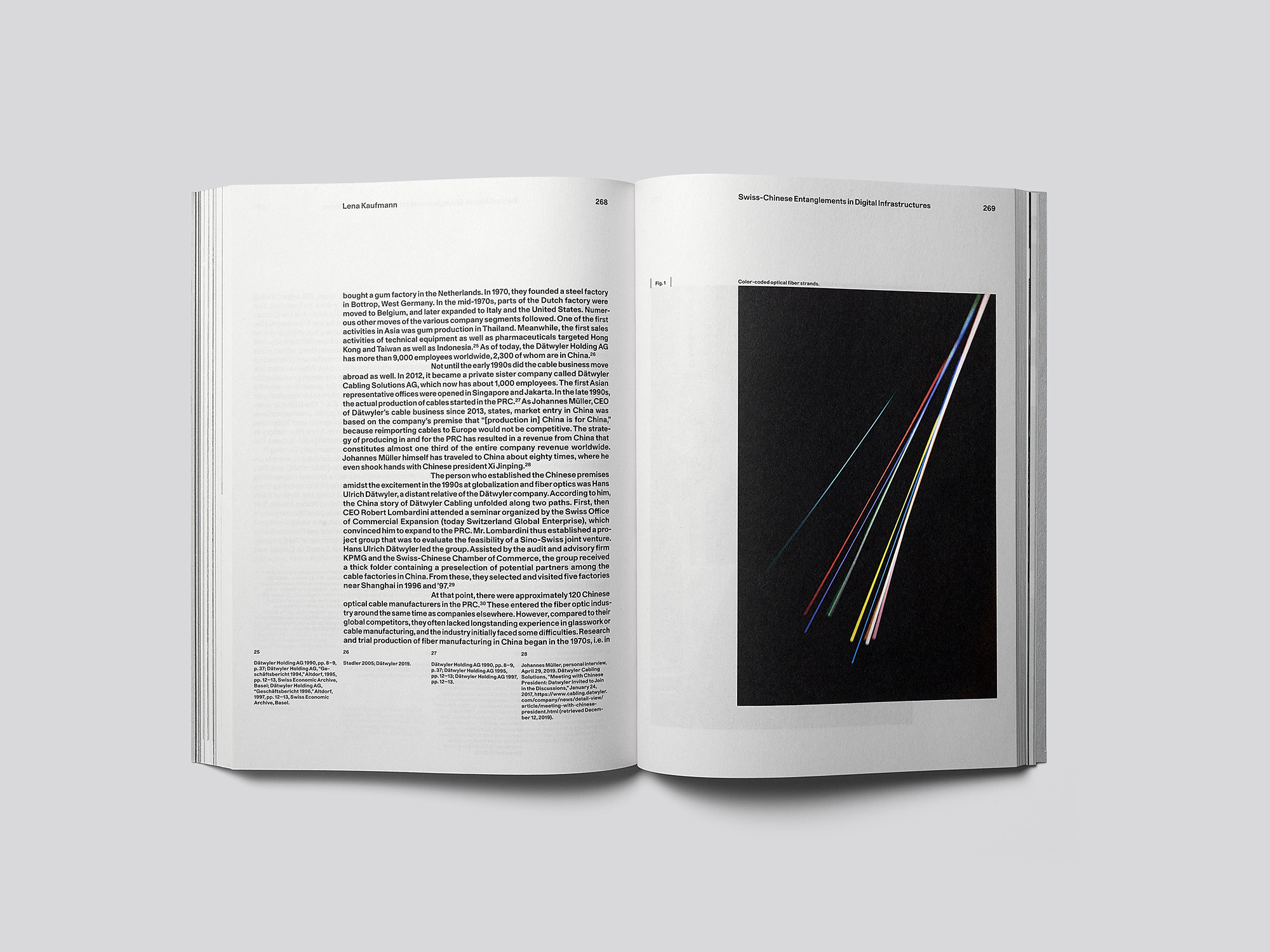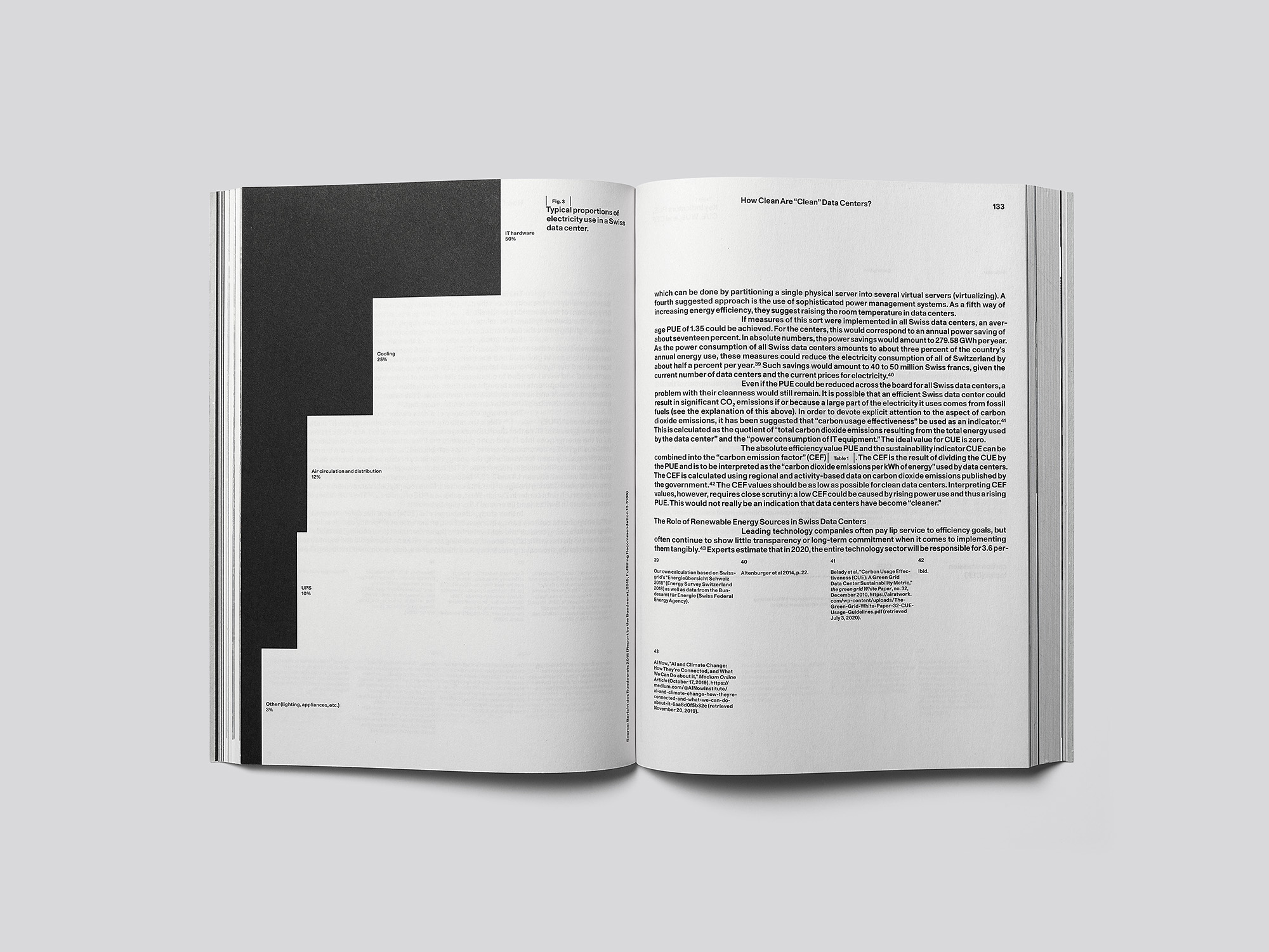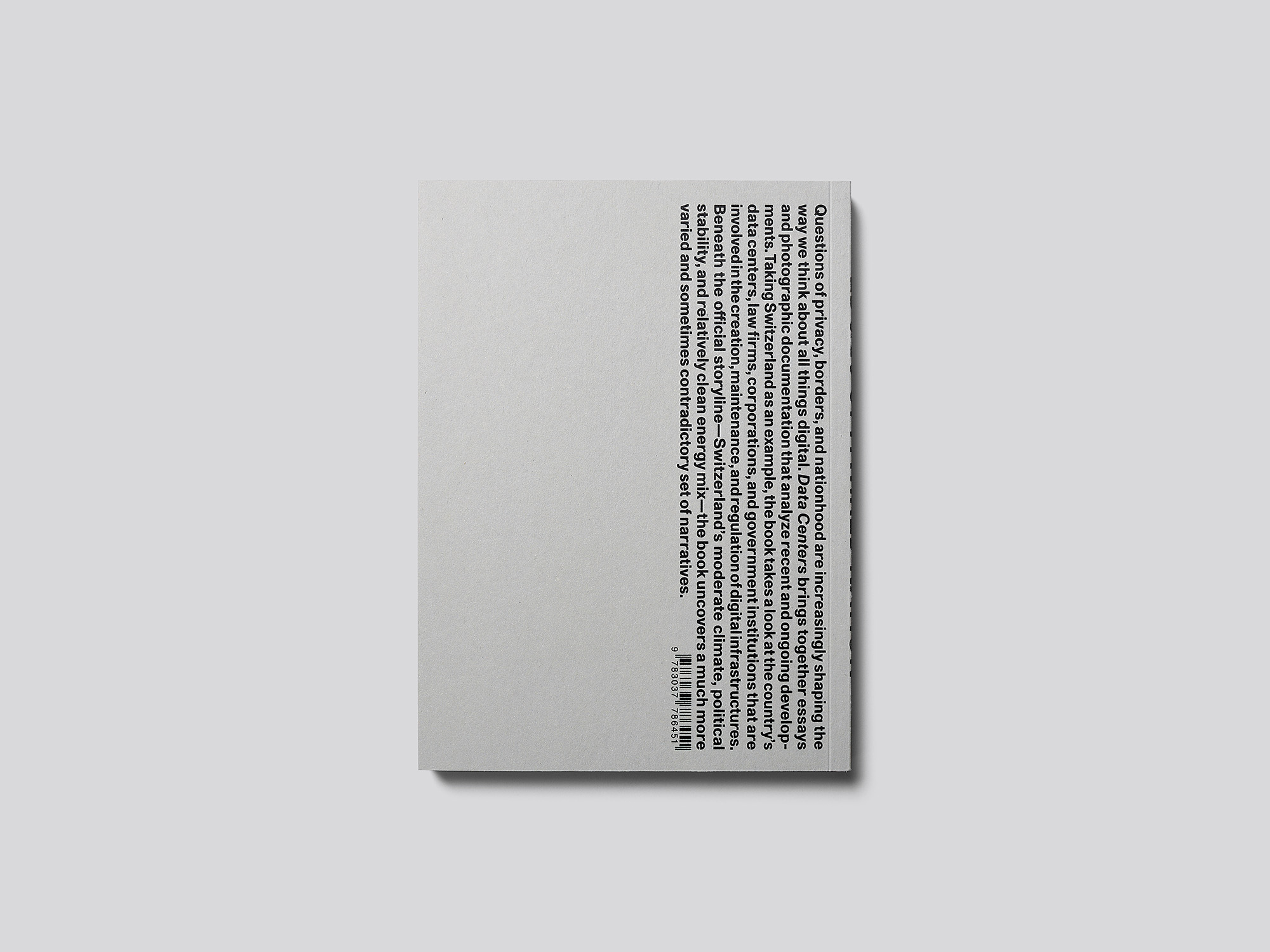Consacré aux aspects juridiques, politiques, économiques et énergétiques des centres de données suisses, cet ouvrage collectif scientifique parvient à rendre étonnamment léger un sujet dense grâce à une mise en page astucieuse, le rendant ainsi accessible à un public plus large. Les contributions écrites, principalement illustrées par des images noir et blanc, sont imprimées sur un papier gris et possèdent une mise en page identique, ce qui produit la sensation très à propos d’une communication informative austère. Elles sont entrecoupées d’essais photographiques en quadrichromie dont la perfection formelle transpose sur papier l’esthétique stérile des centres de données. La grille asymétrique, qui surprend par l’alignement horizontal des notes de bas de page qui courent de gauche à droite sur toute la largeur, est remarquablement dynamique. Les notes ne sont pas toujours exactement alignées avec le texte principal et créent l’impression d’un flux de données constitué de plusieurs couches informationnelles qui s’écoulent à cadence régulière. La couverture souple en carton gris non couché donne de la douceur au livre et une sensation de simplicité encore renforcée par son graphisme typographique. Les subtiles transitions graphiques qui conduisent de la couverture au dos puis à la quatrième de couverture soulignent la cohérence tridimensionnelle de l’objet livre.