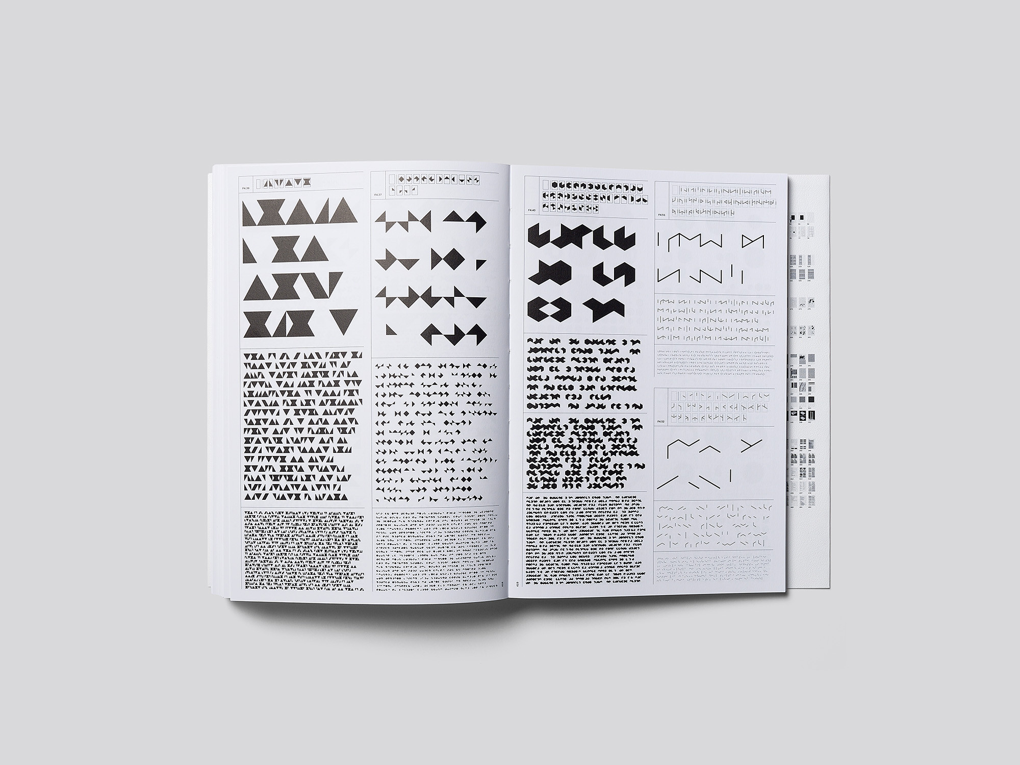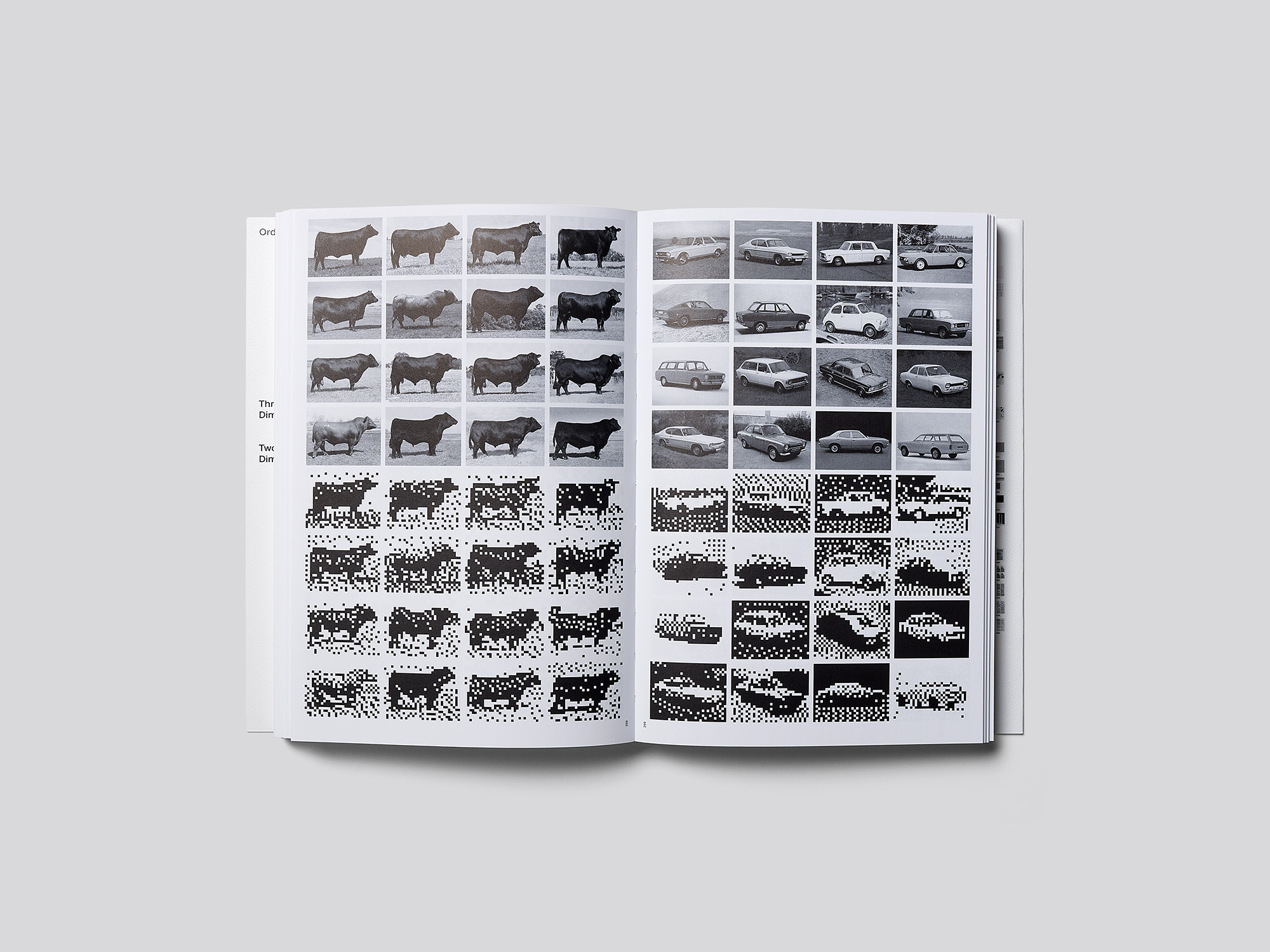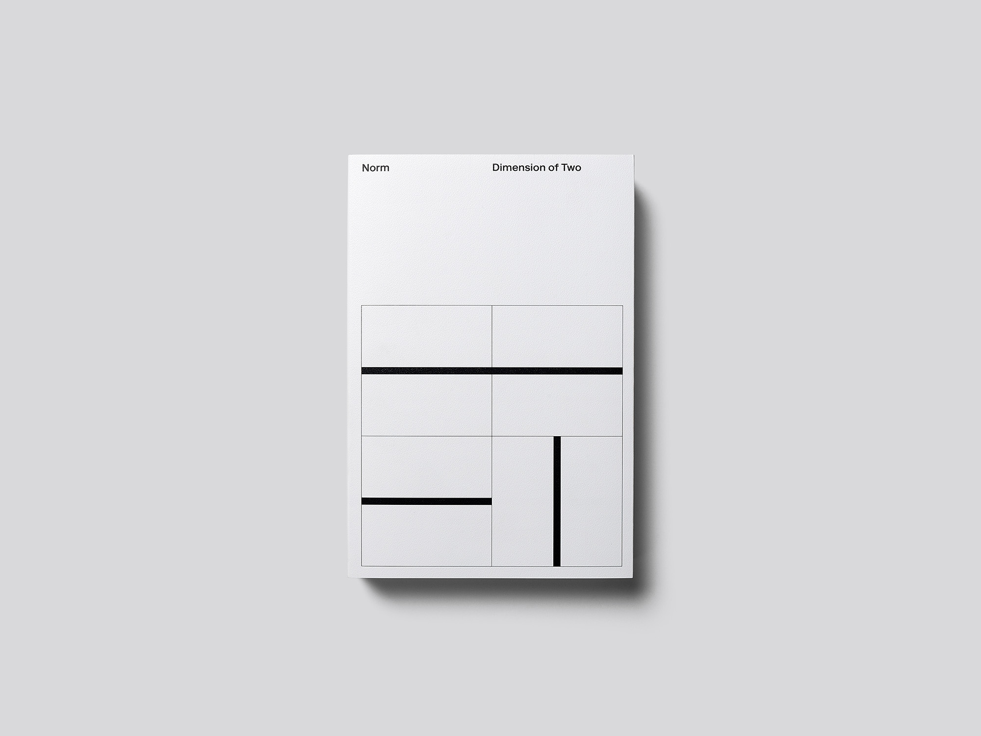 Sous une couverture souple blanche, les trois designers de Norm proposent dans une monographie autoéditée, imposante mais néanmoins maniable, la somme de leurs recherches pratiques aussi singulières qu’anciennes sur les principes fondamentaux du design graphique. Les neuf chapitres, où le noir et blanc prédomine largement, traitent notamment des rapports de taille, de l’organisation de la page, des objets graphiques et des caractères. Leurs pages sont abondamment remplies de dessins et schémas variés, explicités par des légendes minimalistes. La profusion des exemples et les moyens de représentations volontairement restreints témoignent d’une discipline rigoureuse, qui semble par moments poussée à l’excès. Mais les développements extrêmement pointus et systématiques en côtoient d’autres plutôt cryptiques et drôles, ce qui donne un mélange fascinant. Les préférences de Norm sont clairement exprimées sans que jamais cela ne paraisse didactique, ce qui place l’ouvrage dans une lointaine filiation avec les traités et manuels de l’époque du « style suisse ». Mais il peut aussi s’envisager comme un atlas du monde de Norm, une représentation qui irait de la vue générale au plan rapproché – ce n’est pas un hasard si le Dimension of Two du titre résonne comme un écho au Powers of Ten de Charles et Ray Eames.