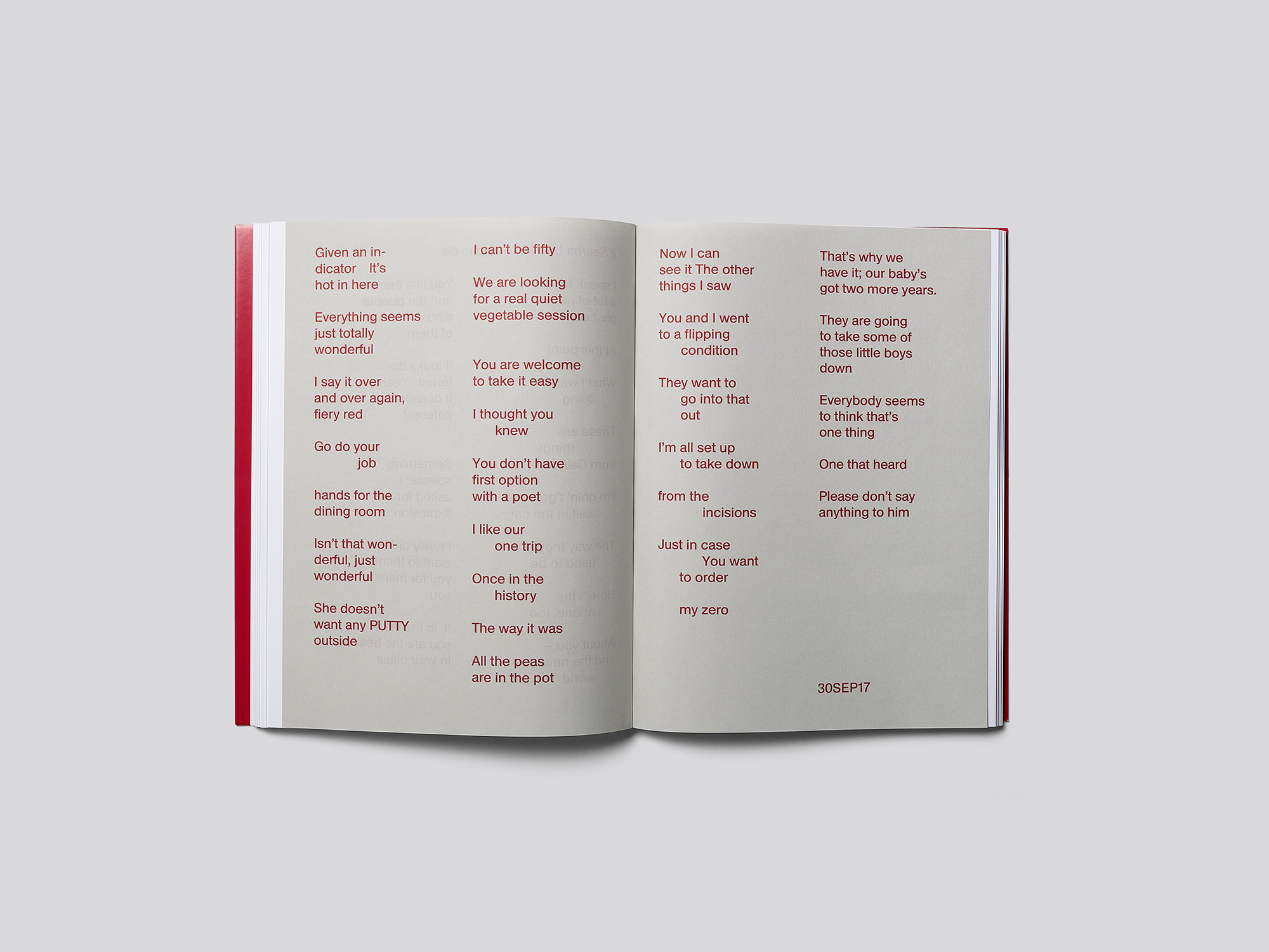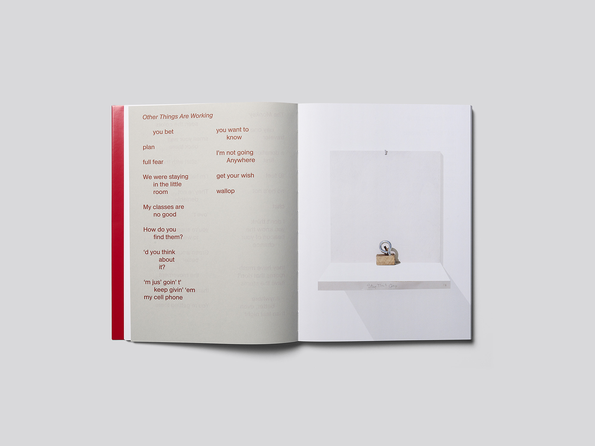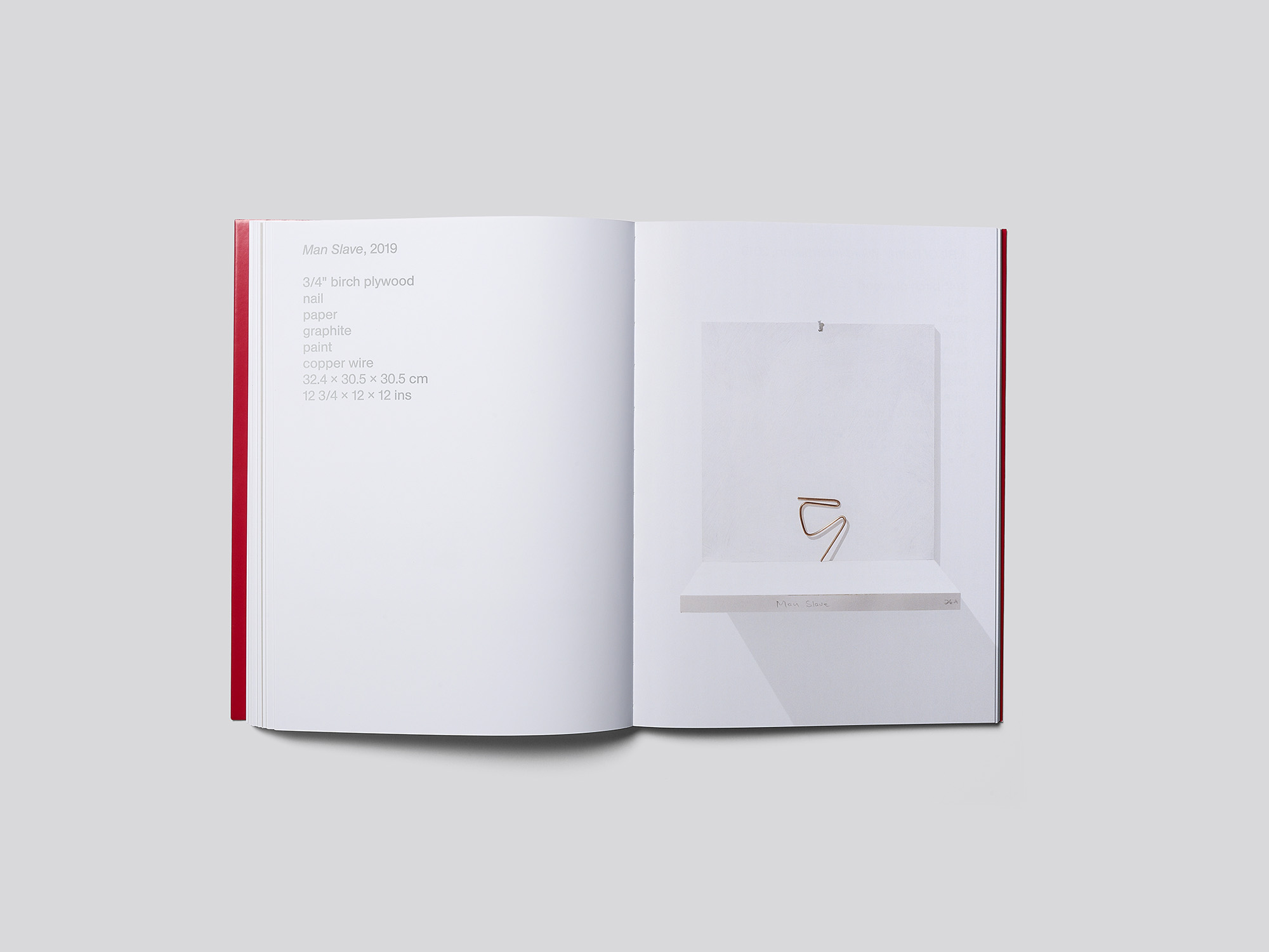 C’est un livre d’artiste de petit format pourvu d’une couverture souple à jaquette rouge, qui, par ses partis pris graphiques minimalistes, reflète une sensibilité aiguë à l’œuvre. Il a été réalisé à l’occasion d’une exposition de Richard Tuttle à la galerie londonienne Modern Art. L’artiste présentait une centaine de petites sculptures réalisées à partir de matériaux du quotidien et de rebuts tels que du fil de fer, du papier, des bouts de bois, etc. Chaque sculpture était exposée seule sur une petite tablette en bois fixée au mur et peinte en blanc. Toutes ont été photographiées sous le même angle frontal et figurent à fond perdu sur les pages de droite. Les coins supérieurs gauches des pages de gauche portent les légendes correspondantes, imprimées en caractères grotesques argentés et relativement grands. À intervalles réguliers, deux feuillets d’un papier plus fin, gris et semi-transparent, viennent s’intercaler entre les pages. Ils présentent des poèmes de l’artiste, composés dans la même police et la même taille de caractères, mais en rouge. Sur le dos blanc du livre dissimulé sous la jaquette, l’artiste a écrit le titre à la main. Le geste est une référence à l’exposition, où les titres des œuvres étaient inscrits à la main sur les tranches des tablettes en bois blanches, et souligne la collaboration étroite avec le designer. Tout, ici, apparaît subtil et précieux.