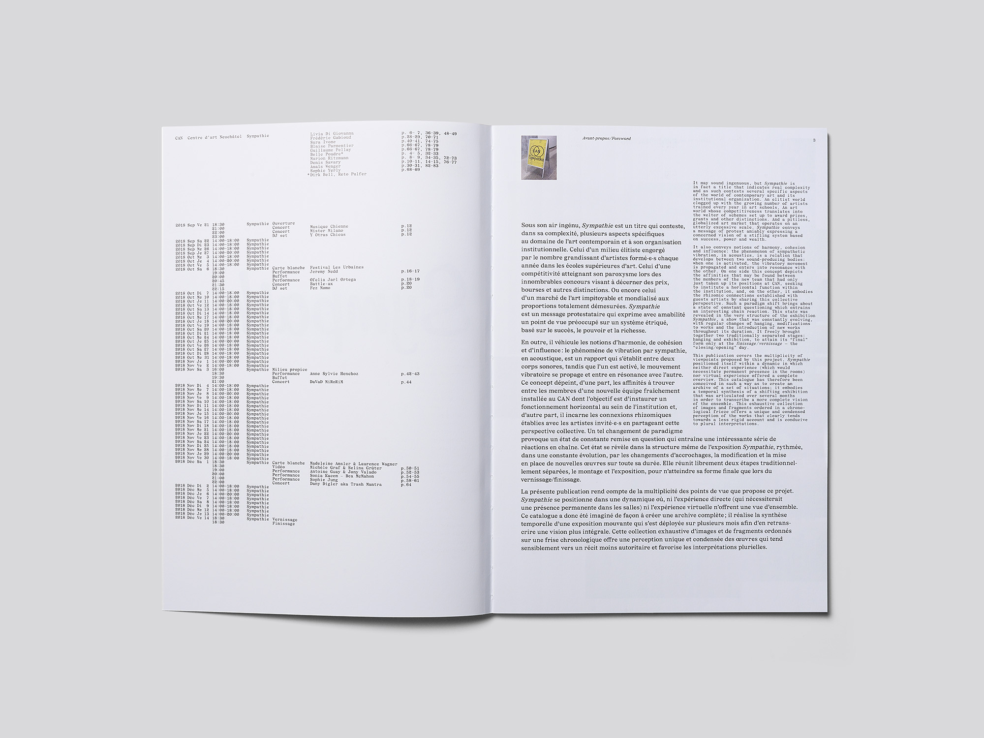 Le premier catalogue d’exposition de la nouvelle équipe dirigeante du Centre d’Art Neuchâtel (CAN) brille par sa manière insolite d’organiser le contenu. L’exposition de groupe, articulée autour de la critique institutionnelle, formait un work in progress qui fonctionnait comme une réaction en chaine de propositions très diverses jalonnée d’événements ponctuels. Vu la qualité hétérogène du matériau photographique – instantanés anecdotiques, images Instagram, etc. –, le design a choisi de faire ressortir la succession des événements et la diversité plutôt que les images individuelles : toutes sont datées, classées chronologiquement et disposées de haut en bas dans une grille verticale. Leur nombre et leur taille varient fortement selon les pages, certaines sont coupées, d’autres se recouvrent partiellement, ce qui donne une documentation linéaire mais rythmée et très animée. Un joli détail est à relever : le placement des dates des photos, composées dans une nouvelle police monospace et placées en bordure gauche des pages. Elles apparaissent au-dessus de l’image quand celle-ci est petite et dans l’image lorsque celle-ci est plus grande. Cela fait penser à un système automatisé d’enregistrement des données. La couverture et la table des matières sont réalisées dans le même esprit (et la même police monospace). Avec son titre engageant, sa couverture souple jaune-noir et ses 90 pages à peine, l’objet dégage une forme de bienveillance et une sobriété adaptée au sujet.