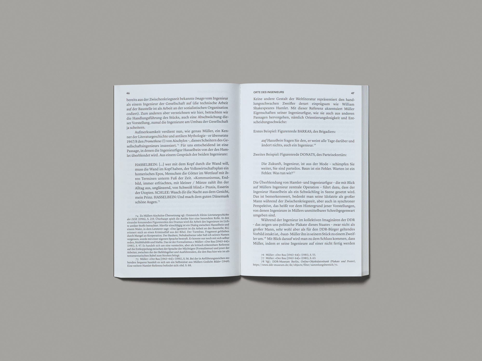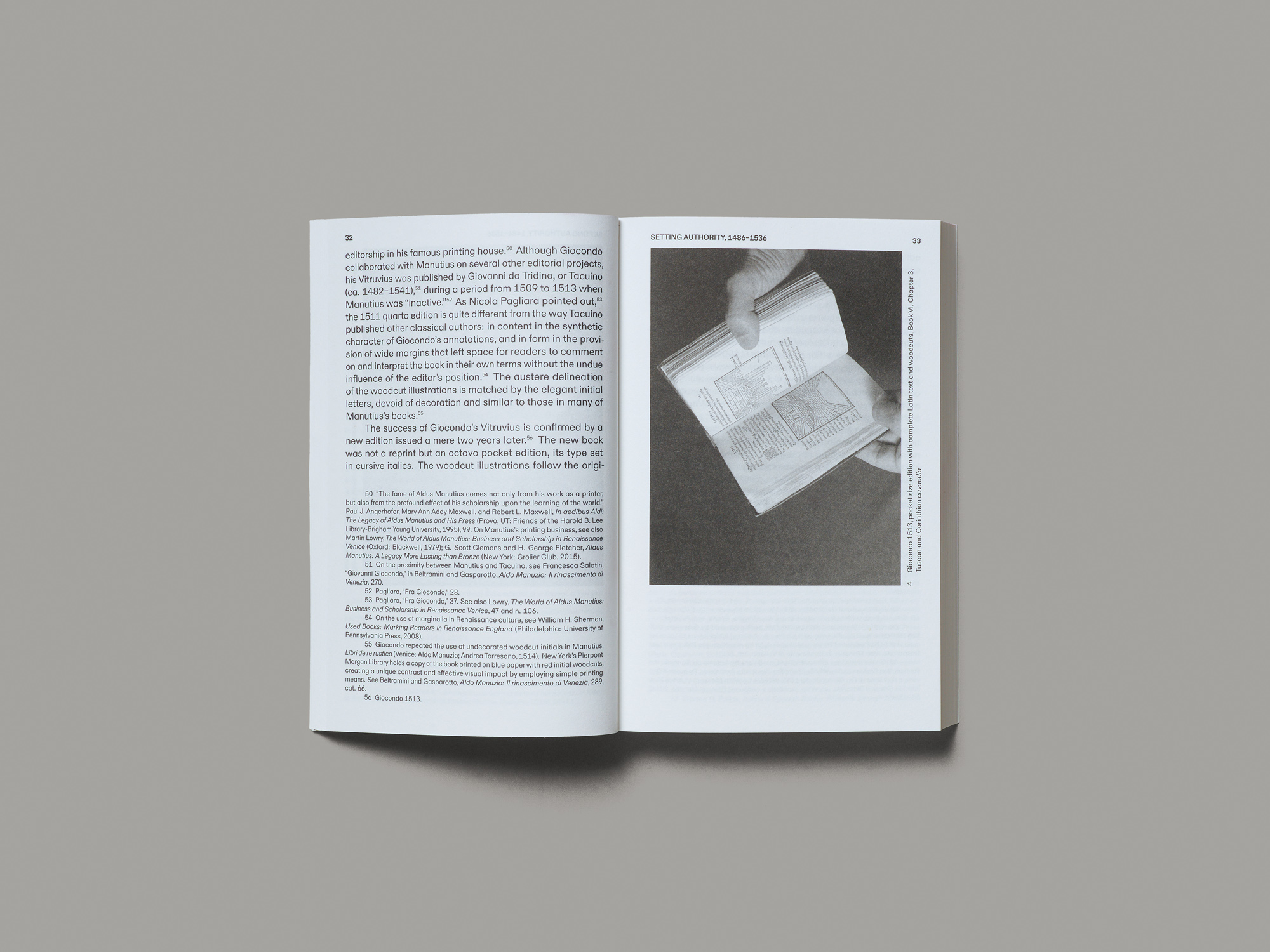 Ces deux collections d’ouvrages universitaires, disponibles gratuitement en ligne mais également édités en format poche, ont en commun de recourir à des solutions graphiques automatisées. Le logiciel développé par un programmeur et une équipe de deux graphistes génère des mises en page web et print agréables à lire, qui n’apparaissent ni confuses ni complexes, ni trop génériques ni formatées. En comparant les premiers volumes de chaque collection – qui sont de taille identique –, on constate qu’il est par exemple possible de varier la typographie du texte courant, mais seule la taille des titrages est ajustable. Le formatage des paragraphes, citations, notes de bas de page et autres reste constant. La première de couverture est uniquement typographique tandis que la quatrième peut accueillir une image de titre de taille et de format variables. Les implications de ce projet sont considérables : pour des raisons financières, la publication scientifique en ligne en accès libre devra probablement à plus ou moins court terme se passer d’une mise en page entièrement réalisée par des humains. La collaboration réussie entre le programmeur, les graphistes et les deux éditeurs mérite d’autant plus d’être soulignée, tout comme le fait que les livres sont également proposés en version papier. La mise en page très fonctionnelle associée au soin méticuleux porté à la typographie fait notamment penser au travail de Jan Tschichold pour Penguin.