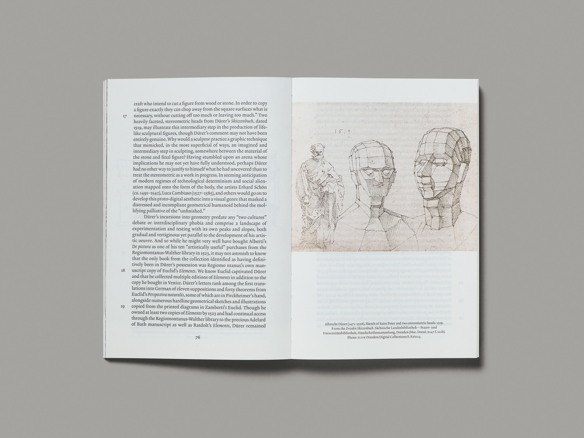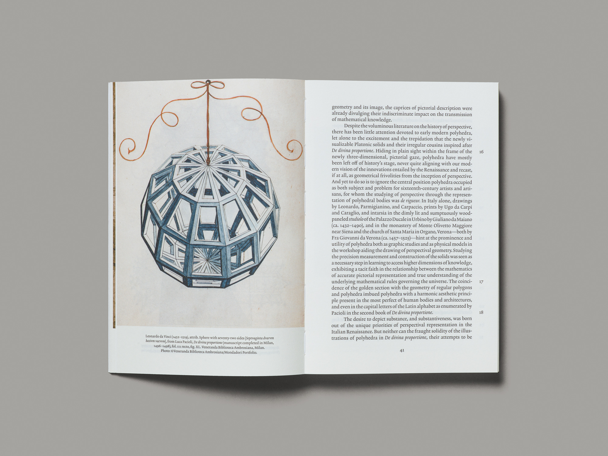 Cette étude universitaire sur la fascination du XVIe siècle pour les polyèdres expose sa matière historique de manière pertinente et sous une forme étonnamment contemporaine. La mise en page très « néoclassique » s’écarte d’un certain nombre de conventions qui régissent habituellement l’édition universitaire et interagit à merveille avec la riche matière iconographique. L’ouvrage est relativement grand pour un format de poche, ce qui permet d’observer dans le détail les illustrations, toujours reproduites à raison d’une par page et souvent à fond perdu. La couverture donne le ton en affichant en première et en quatrième le détail d’un tableau. Le titrage des chapitres s’étend sur une double page et est composé en grandes capitales qui semblent gravées dans la pierre, comme des incrustations qui permettraient à l’oeil de se reposer pendant la lecture. La reliure à dos brisée assure une bonne ouverture du livre à plat et selon les cas, les légendes passent du côté de la page de texte en regard pour laisser toute la place à l’illustration. Une grande feuille à plusieurs plis reproduisant un dessin particulièrement riche en détails est collée sur l’une des pages et peut être dépliée. La mise en page se saisit, elle aussi, du thème de la géométrie et propose sur de nombreuses pages un jeu ludique (et parfois ironique) autour des blancs, des proportions et des harmonies. Le livre reste par ailleurs très accessible et agréable à lire.