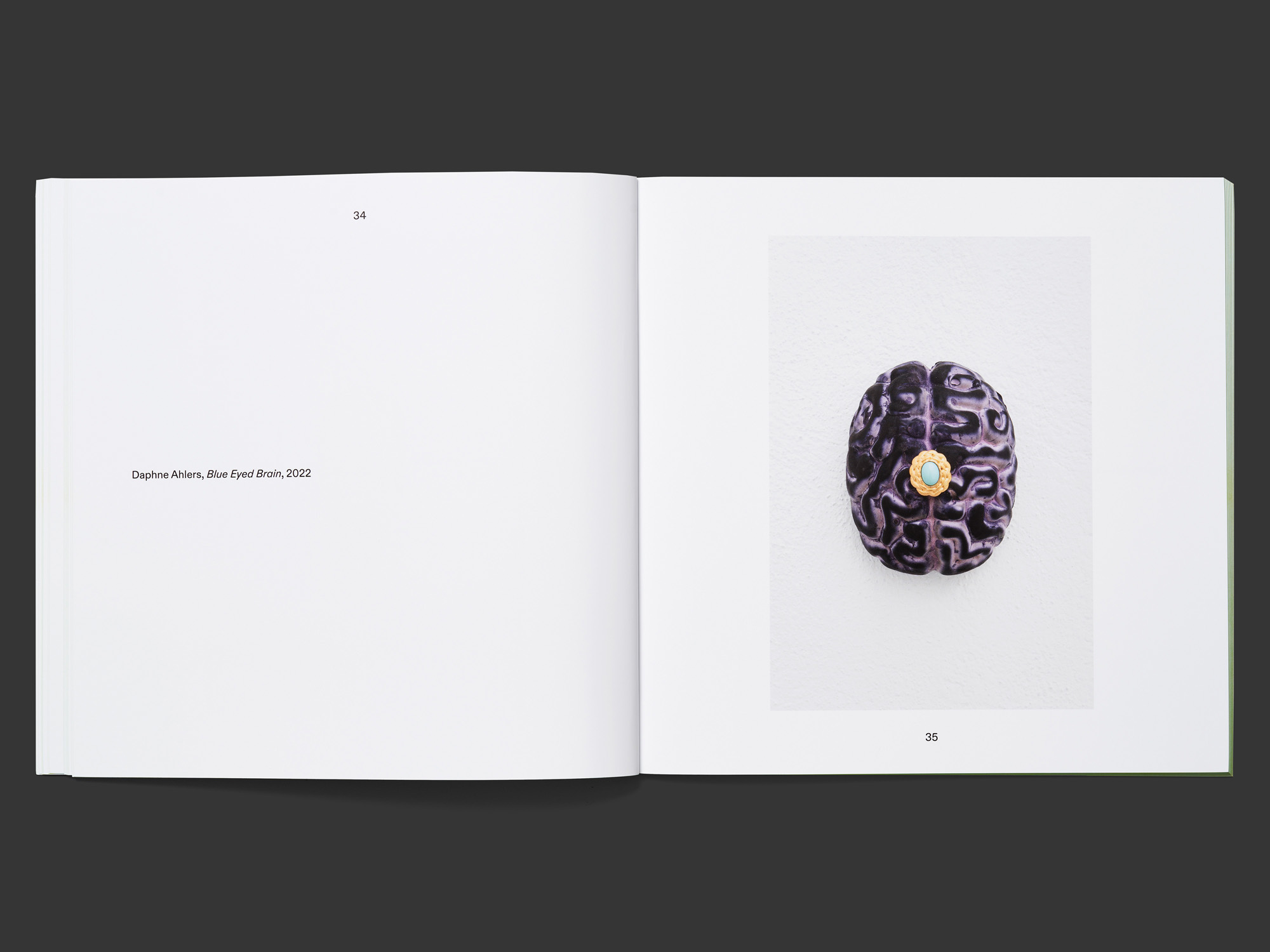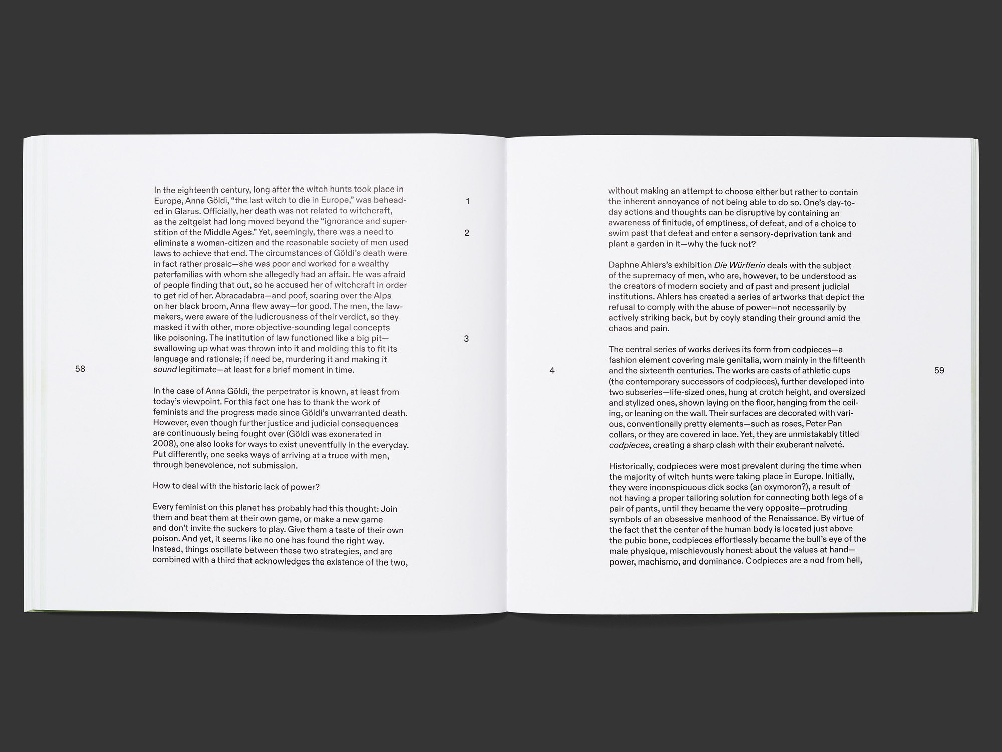 Le catalogue carré, très fin, de l’artiste hambourgeoise Daphne Ahlers montre différentes formes de sculptures qui, grâce à un agencement raffiné, interrogent les modes de présentation des oeuvres d’art et les mécanismes de valorisation des objets. Une impression de mystère se dégage au premier abord : le corps d’ouvrage blanc, avec l’image d’un noeud de ruban blanc sur fond vert reproduite quatre fois en couverture et ses deux tranches vertes, fait penser à un emballage cadeau. Quelques vues d’exposition, reproduites sur des doubles pages et encadrées d’un large bord blanc, montrent les sculptures textiles délicates d’Ahlers. Un essai composé sur une colonne relativement large avec une police sans empattement est suivi d’une série de petits objets muraux photographiés seuls et toujours sous le même angle frontal, comme s’il s’agissait de bijoux. Les images sont disposées selon deux grilles simples qui se succèdent en alternance régulière, tandis que se détache un élément typographique, la pagination, qui change continuellement de place. La mise en scène luxueuse contraste avec le papier relativement rigide et la couverture en carton évoque plutôt un produit bon marché. Le catalogue rappelle de loin les livres d’art des années 1970 mais sous une forme renouvelée, contemporaine.