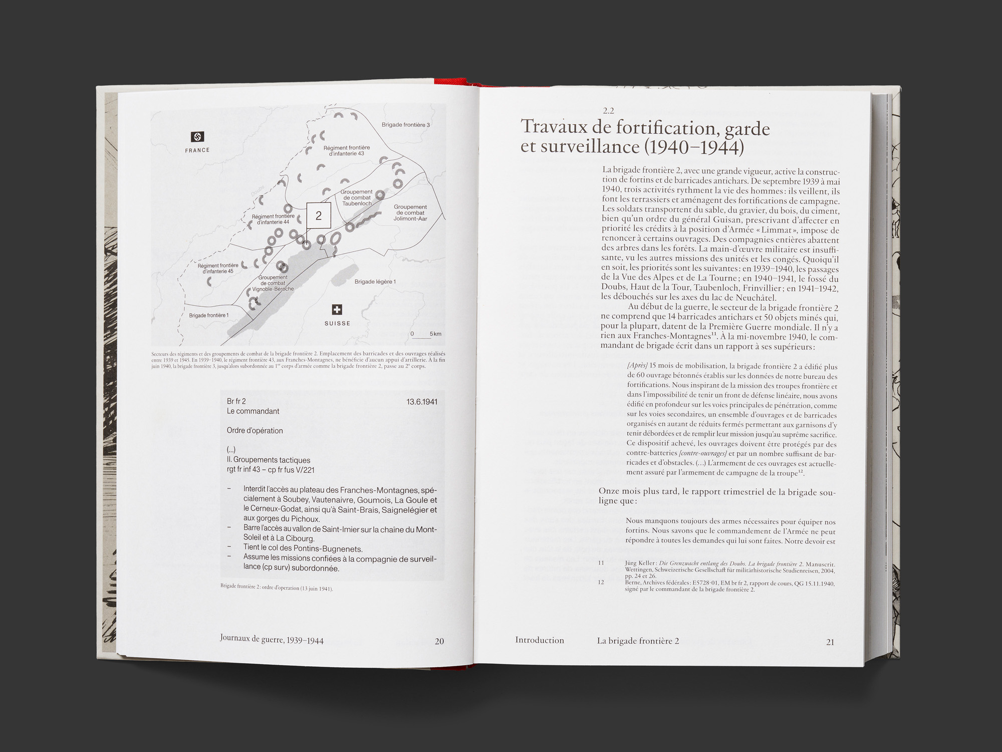 Les carnets de guerre d’un capitaine de l’armée suisse ont été rassemblés dans un livre d’allure très classique, avec reliure grise et demi-toile rouge, dont l’intérieur est agencé avec beaucoup de minutie et d’intelligence. Les plus de 600 pages de carnets, imprimées sur un papier gris très fin, sont précédées d’une introduction critique et suivies de commentaires, ces deux parties étant quant à elles imprimées sur du papier blanc. La mise en page d’une grande régularité, qui utilise une police à empattement de taille constante, deux graisses et différentes tabulations, souligne la nature bureaucratique de ces écrits relatant pour une grande partie les activités répétitives qui rythment les journées des militaires. De nombreux dessins, souvent humoristiques et réalisés par un soldat qui servait dans la même compagnie, émaillent l’ensemble et l’allègent dans tous les sens du terme. Sur le dos et la couverture, le titre est marqué à chaud, en doré. Une partie du titrage vient empiéter, de manière intempestive dirait-on, sur l’image de couverture. On peut y voir une annonce du programme graphique qui se déploie à l’intérieur de l’ouvrage : même si la mise en page ne réinterprète pas le matériau historique, elle se montre subtilement non conventionnelle.