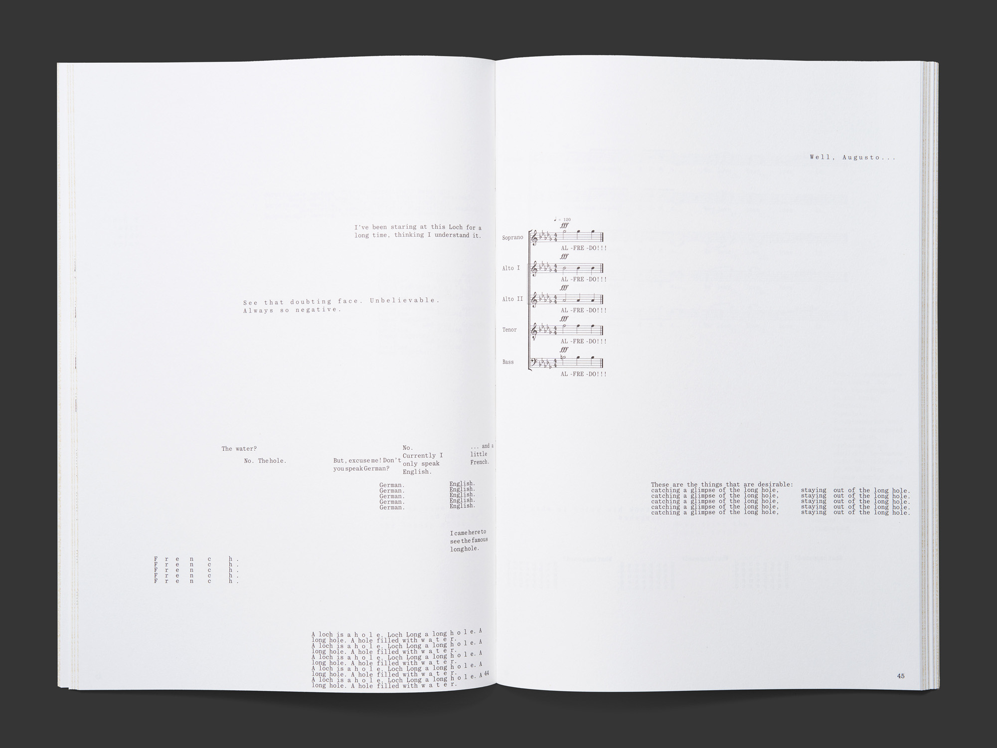 Dans un livre fin de grand format et à la couverture souple, la jeune artiste vidéo suisse Rhona Mühlebach montre huit de ses oeuvres en proposant une méthode étonnante de retranscription de films par le biais du texte et de la musique. L’objet rappelle un cahier de partitions, chacune des huit pièces vidéo est présentée dans un chapitre de plusieurs pages d’assemblages typographiques qui mêlent dialogues et notes de musique. Le graphisme audacieux de la couverture s’appuie sur un motif beige, qui fait penser à une imitation cuir, et un tirage bleu marqué à chaud ; cette association est réutilisée pour les pages de titre des huit chapitres. Ces pages de titre portent par ailleurs un essai en grands caractères noirs disposé en une colonne, aligné à droite ou à gauche des pages. Une petite feuille teintée de vert avec la reproduction d’un photogramme est insérée dans chacun des huit chapitres. Les différents éléments citent avec humour quelques astuces traditionnelles du graphisme d’édition et génèrent un mélange attrayant de contenus et de matières qui invite à l’exploration tout en proposant une expérience sensorielle.