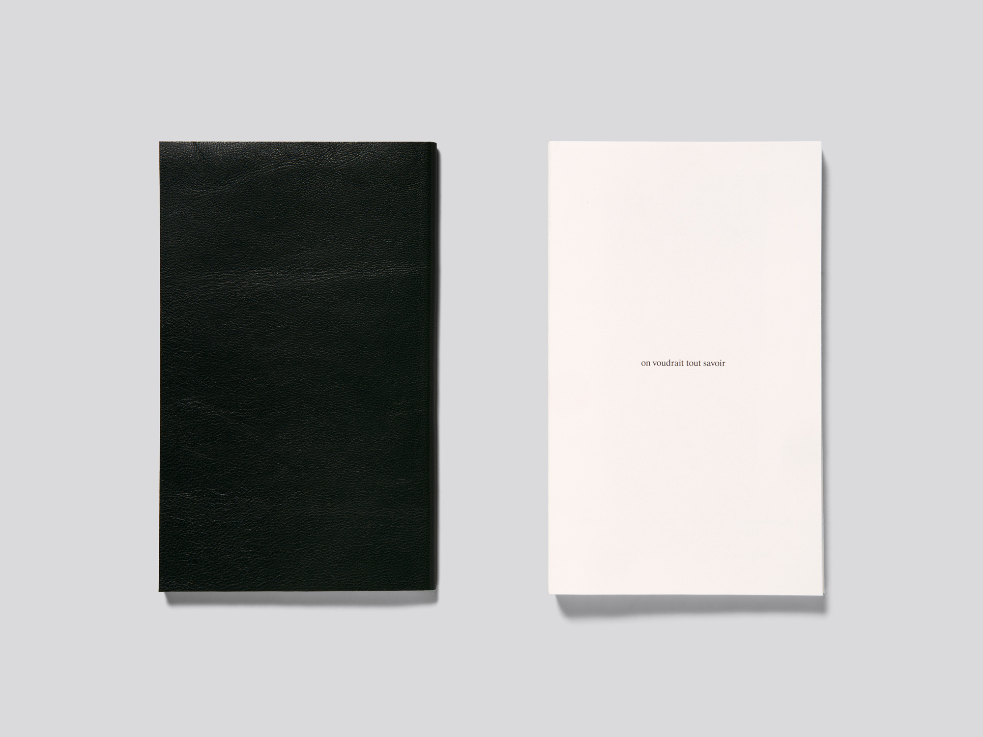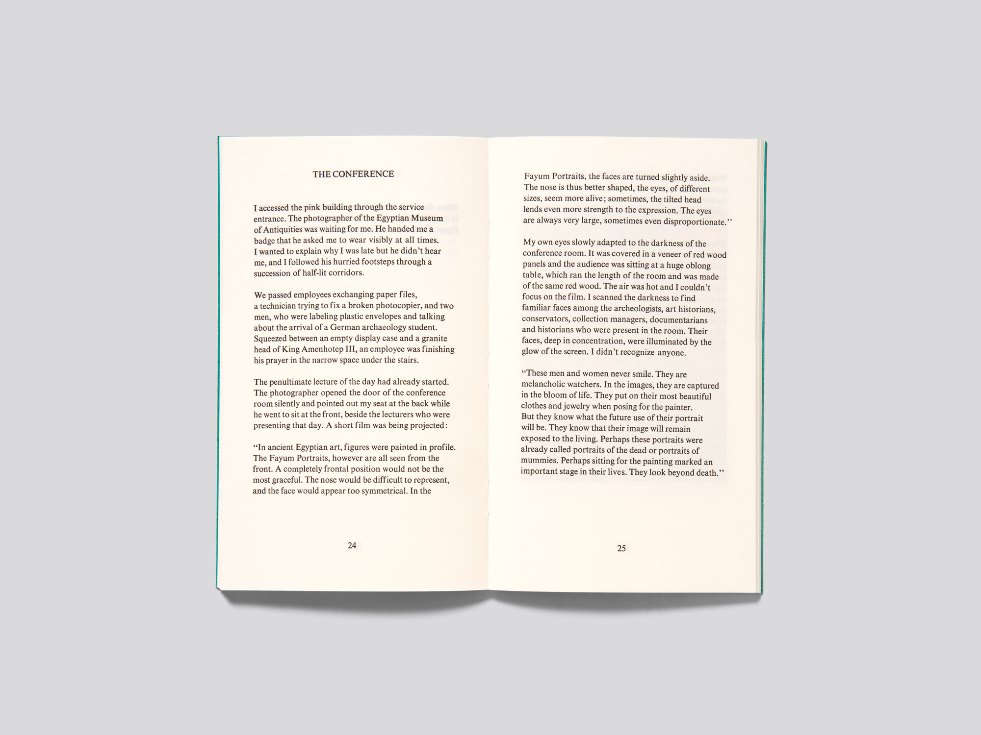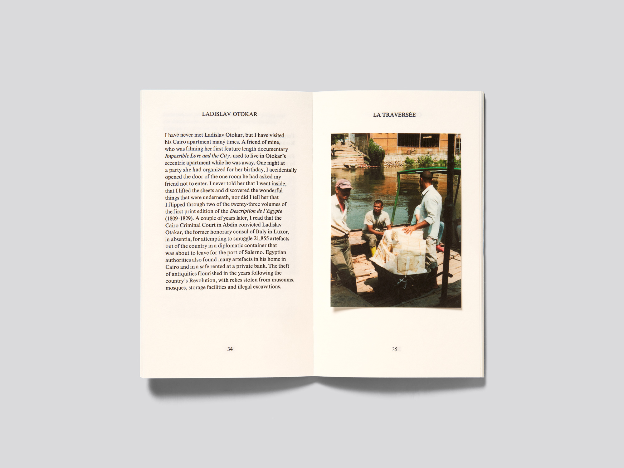 Ce livre d’artiste en deux volumes consacré à une série de petits objets en céramique d’Égypte présente un étonnant mélange de matériaux, de techniques d’impression et de propositions graphiques qui, ensemble, forment une unité aussi charmante que bien conçue. Les deux ouvrages peu épais sont d’un même petit format et sont glissés dans un sachet plastique semi-transparent qui pourrait être un souvenir touristique avec ses mots de bienvenue imprimés en anglais et en arabe. Le premier est un leporello en papier rigide qui présente au recto et au verso de chaque page les faces avant et arrière de 39 céramiques presque identiques dont l’aspect fait penser à des sarcophages. Le second volume, relié en cuir rouge sombre, contient le récit d’un voyage en Égypte et de l’exportation des céramiques, sous la forme de courtes notations rappelant un journal intime et agrémentées d’images collées sur certaines des pages. Le déballage et l’exploration des deux volumes engagent les spectateurs et spectatrices dans une véritable performance en quête du sens mystérieux de ces objets. Même si les Graphismeers ont largement été maîtres de la conception de l’ouvrage, ils ont délégué une partie de l’étape de fabrication puisque le volume de texte a été entièrement réalisé par une imprimerie artisanale égyptienne. Si la nature non spécifiée des matériaux et la qualité inégale des images collées incarnent une forme d’artisanat à l’ancienne, elles sont aussi très actuelles dans leur façon de contrarier les représentations établies du beau. Dans l’ensemble, il s’agit d’une « valise égyptienne » attrayante qui joue avec toute une série d’imaginaires et de clichés associés à l’Égypte.