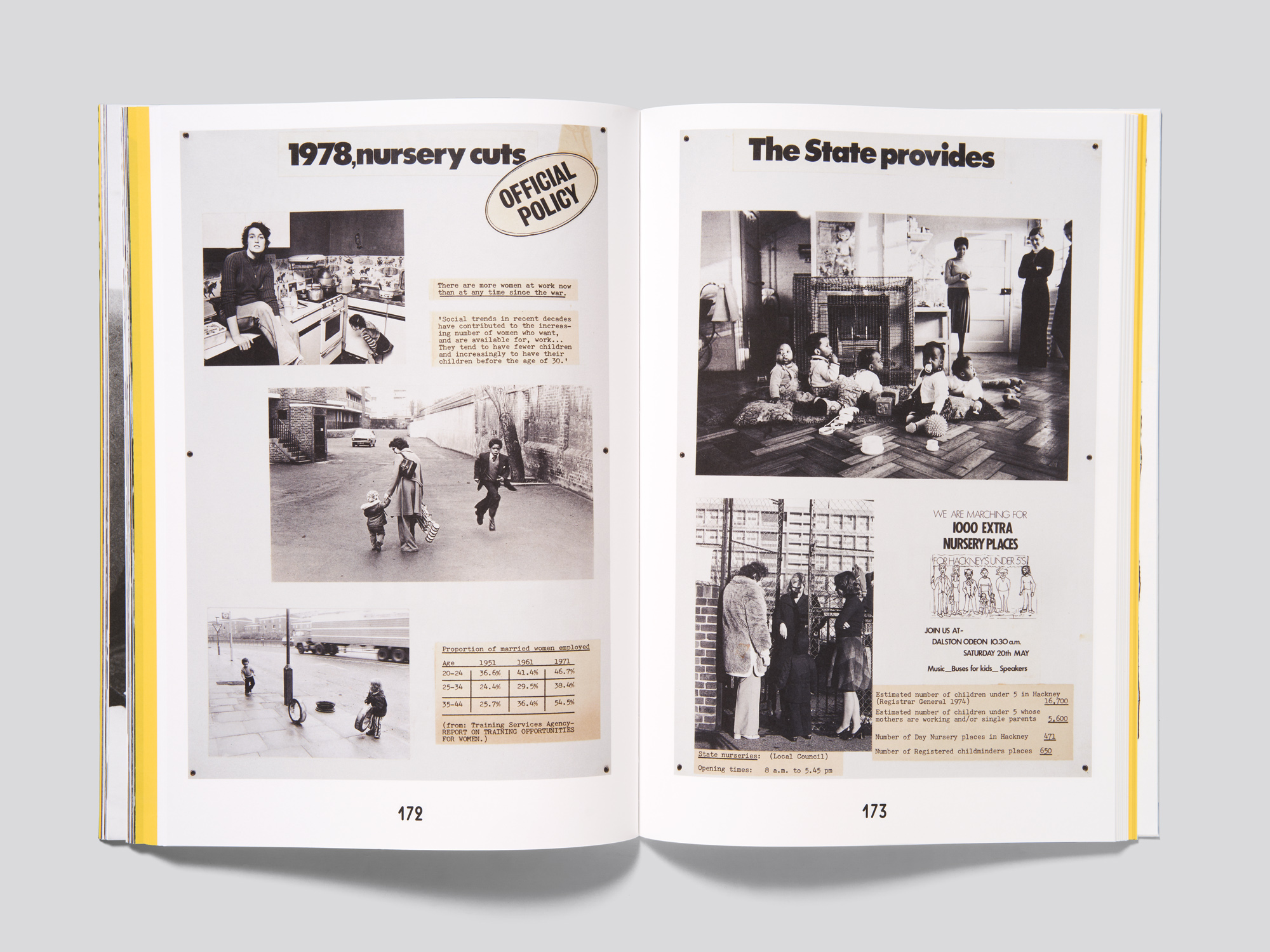 Ce livre de moyen format, à la couverture rigide noire, blanche et jaune, envoie un signal graphique fort pour rappeler l’actualité persistante des mouvements féministes des années 1970. Il a pour sujet le collectif de militantes londoniennes Hackney Flashers qui dénoncèrent au moyen d’une association virtuose d’images et de textes, mise en œuvre à l’occasion de deux expositions itinérantes (1975, 1978) et d’un diaporama (1980), l’exploitation des femmes employées, sous-payées et obligées d’assumer seules l’éducation des enfants. En parallèle de ses interventions artistiques, le collectif organisait des manifestations et mettait sur pied des moyens de garde pour les enfants. Pour souligner à quel point ces exigences n’ont rien perdu de leur urgence, la mise en page radicale évite toute démarche nostalgique et transpose tel quel le matériau historique au présent. Ainsi, une photographie d’une manifestation de l’époque reproduite en pleine page sert d’image de titre. On y voit un garçon porter une pancarte sur laquelle est écrit « PARENTS MUST UNITE + FIGHT » et qui fait office de titre. Dans la même veine, un prélude très cinématographique de 64 pages réarrange et met en regard images et textes produits pour les expositions des Hackney Flashers comme si ces créations dataient d’aujourd’hui. Le bruit de la rue est visualisé et capte directement l’œil du public. Ce n’est que dans la seconde partie qu’un essai imprimé sur papier jaune met en lumière le contexte historique. L’ouvrage est complété par des reproductions des panneaux d’exposition de l’époque, des biographies sommaires et une photo de groupe actuelle. Ce court-circuit stratégique entre passé et présent se retrouve également dans la typographie puisque la police dessinée pour l’occasion, monoligne et arrondie, qui est utilisée pour l’ensemble des textes est dérivée de l’« écriture scripte » normée employée à partir de 1945 dans les écoles françaises. L’ensemble est très cohérent et aucun des partis pris du duo de graphistes n’a été remis en question par le jury.