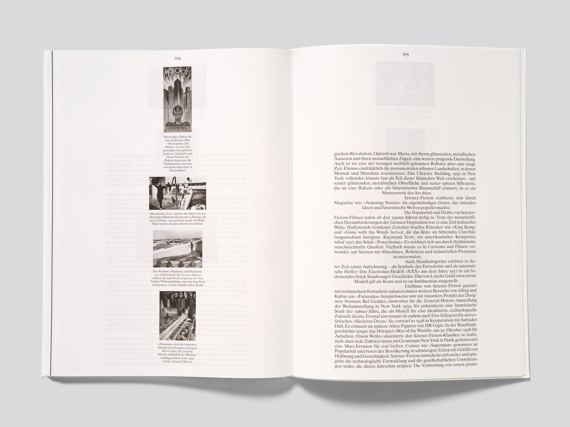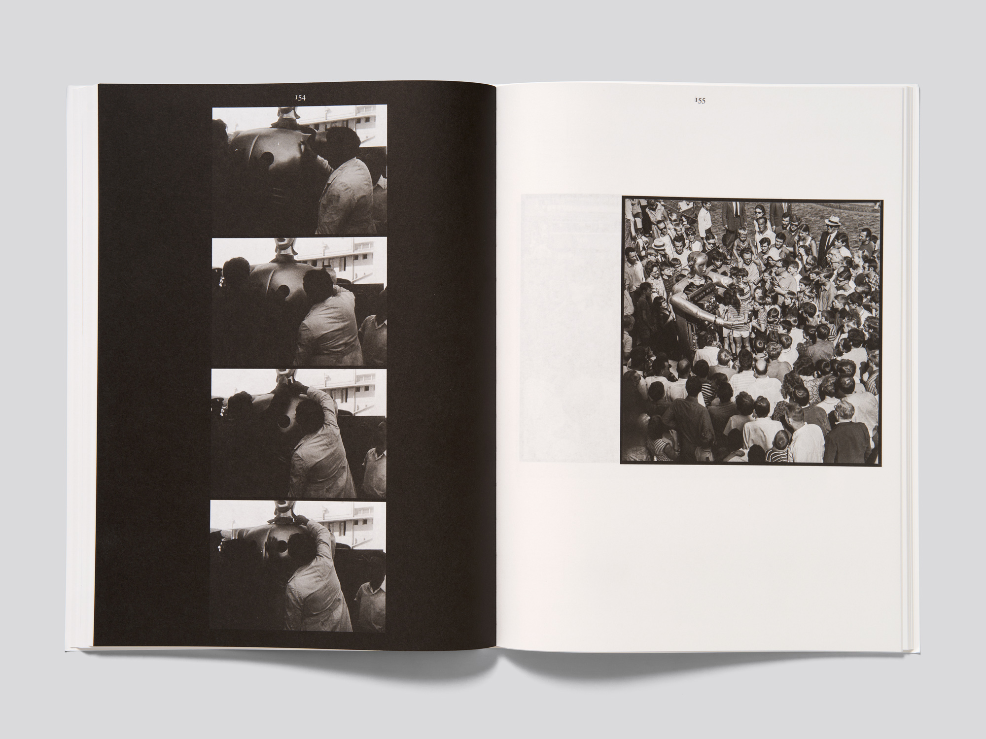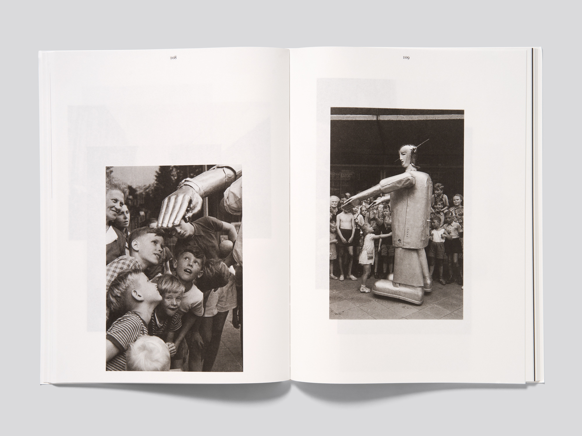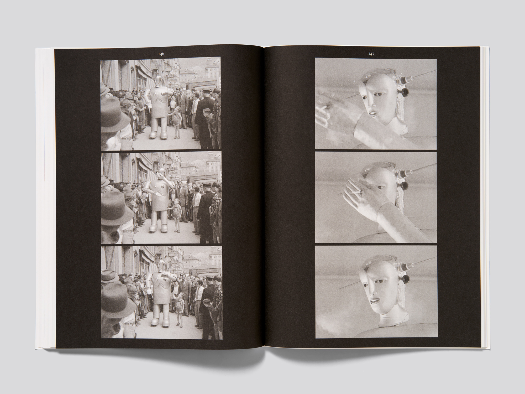 Ce catalogue d’exposition en noir et blanc consacré à un robot suisse des années 1930 propose une fascinante séquence d’images cinématographiques réalisée avec des moyens graphiques d’une grande simplicité. Près de 200 photographies de tailles et de formats variés, reproduites à raison d’une par page, présentent cet automate qui a fait sensation dans le monde entier jusque dans l’après-guerre. Elles le montrent dans différentes situations, de sa fabrication à ses présentations publiques, entouré de foules de curieux. La séquence est interrompue à quelques rares endroits par des pages noires sur lesquelles sont reproduites des séries de photogrammes. En fin de volume, un essai ainsi que les légendes des images et les sources complètent l’ouvrage. L’omniprésence de l’automate suscite une sensation de mouvement robotique lorsqu’on feuillette l’ouvrage et les variations dans le placement des images sur les pages ainsi que le papier translucide viennent encore renforcer la dynamique ludique. Plusieurs ouvrages soumis cette année au concours ont adopté le concept de la couverture énigmatique avec une image en pleine page à l’avant et les éléments textuels en quatrième de couverture. Le format de la couverture souple dépassant légèrement celui du corps d’ouvrage, de fortes traces d’usure ne manqueront pas d’apparaître. Mais cette approximation volontaire peut aussi s’interpréter comme un clin d’œil ironique à la carapace métallique du robot, dont les éléments sont eux aussi parfois assemblés de manière approximative. Le robot sur la couverture personnifie en quelque sorte l’ouvrage.