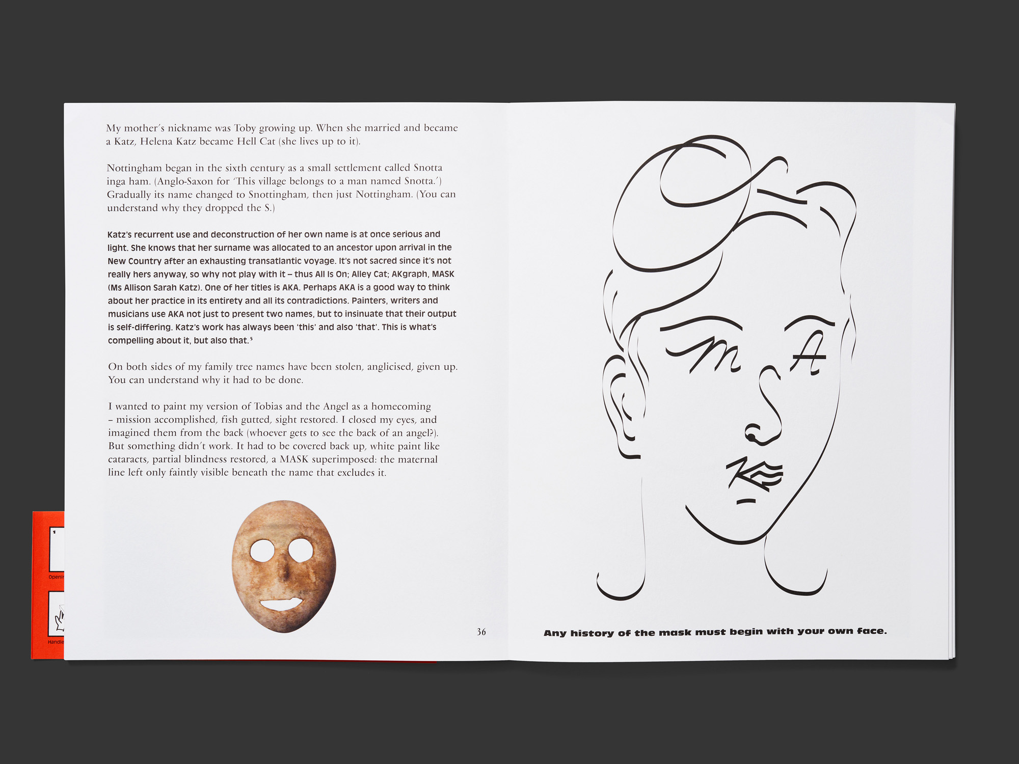con annotazioni che ricordano un diario, riflessioni concettuali e richiami alla storia dell’arte. Il mix virtuoso offre numerose combinazioni sorprendenti di tipografia e immagini. Inoltre, una doppia pagina ogni due si può aprire verso l’alto per rivelare un grande dipinto o un poster dell’artista. Sui poster si ritrovano molti dei tipi di carattere utilizzati nel testo. Nonostante la struttura sbalorditiva e i contenuti complessi, il libro non appare artefatto o complicato ma con la sua generosità spaziale offre tutta una serie di modalità d’accesso, semplificate anche dalla fascetta rossa avvolta intorno alla copertina morbida, su cui sono riportate una breve presentazione e le istruzioni per aprire le doppie pagine. L’interazione simbiotica tra arte e design fa intuire la stretta collaborazione avvenuta tra le parti coinvolte.