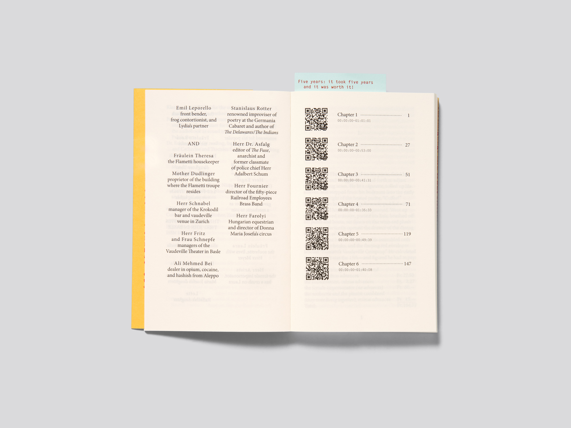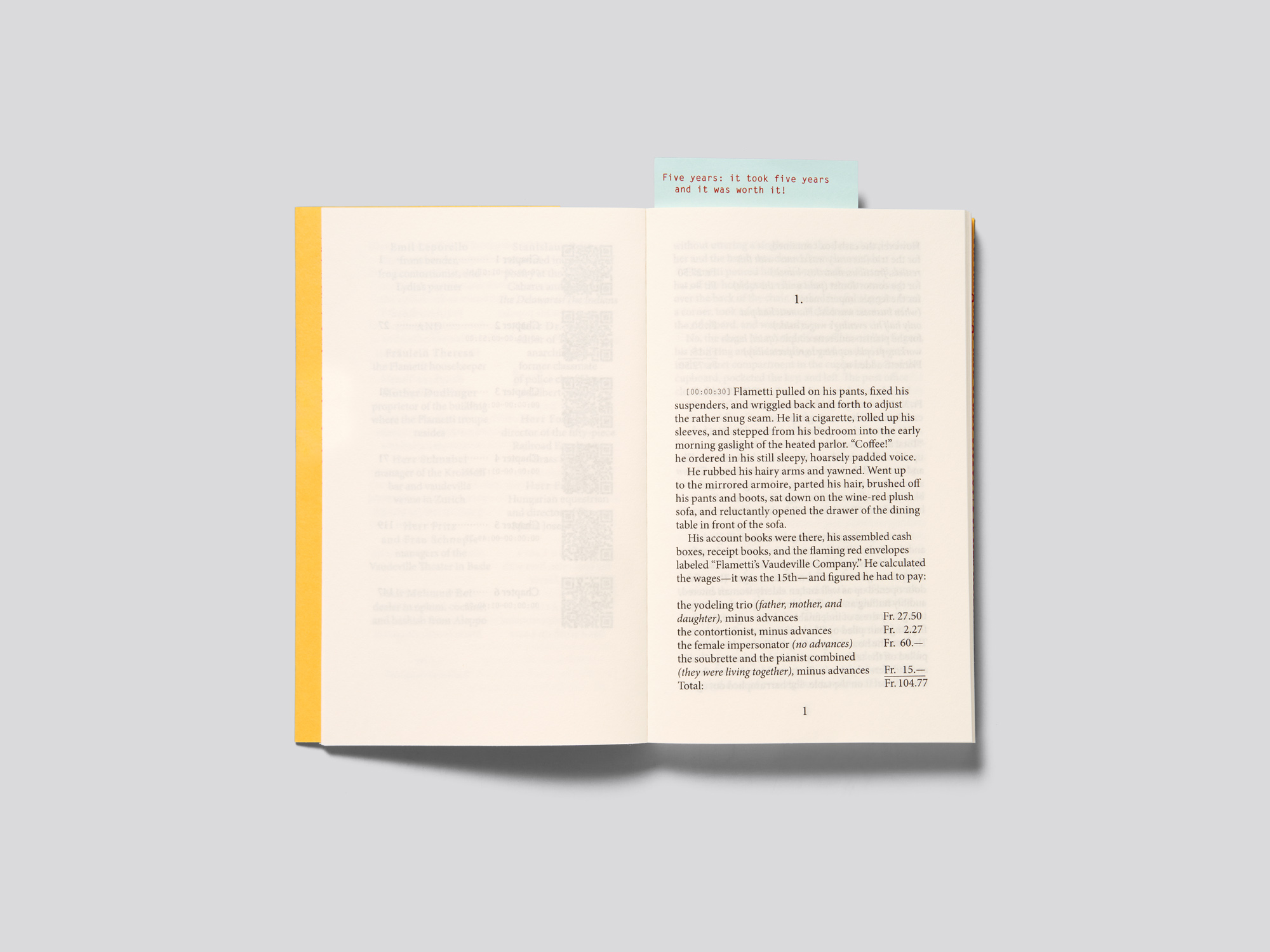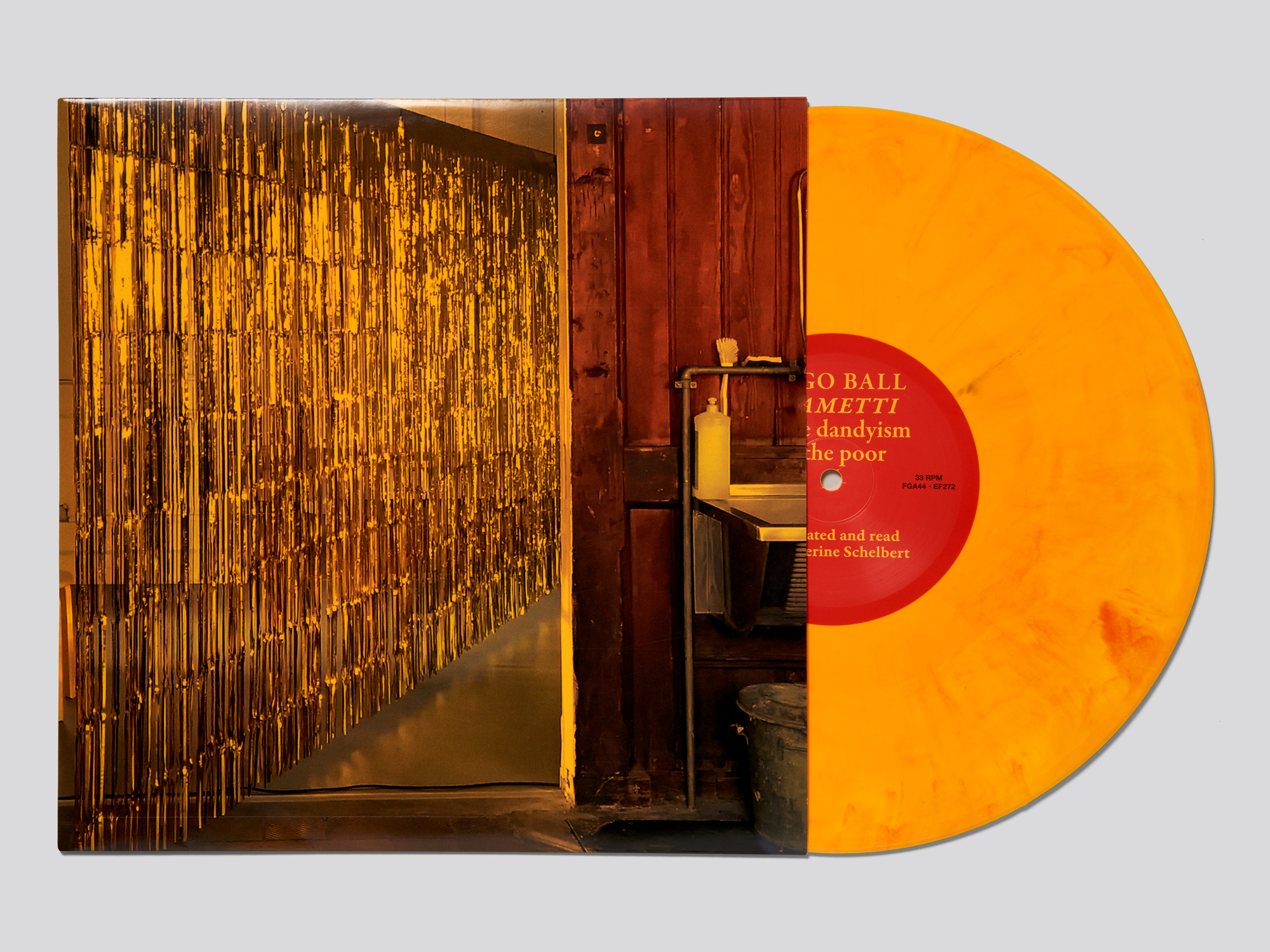 Un piccolo tascabile, un vinile e un audiolibro disponibile online formano un insieme eclettico che, con fascino e disinvoltura, mette in scena l’universo multimediale. Il libro contiene la traduzione in inglese di una novella di Hugo Ball (1886 – 1927) già pubblicata una decina di anni fa, che ora appare in una nuova veste grafica. La designer del libro è anche co-editrice di un audiolibro online che propone una lettura da parte della traduttrice con accompagnamento musicale. Estratti dell’audiolibro ritornano poi nel vinile, che è contenuto in una comunissima custodia quadrata e viene fornito in coppia con il libro in una busta di plastica trasparente. È evidente la disarmonia tra i due formati, che presentano dissonanze anche dal punto di vista dei colori: nonostante la sovraccoperta del libro, la custodia del disco, il vinile stesso e il foglio quadrato che lo accompagna siano tutti contraddistinti dall’alternanza di giallo e rosso per lo sfondo e le scritte in serif, si incontrano ben quattro diverse tonalità di giallo. Si potrebbe interpretare come un’allusione ironica all’incompatibilità di questi formati, oppure come un riferimento ai quattro diversi materiali utilizzati – in ogni caso, i contrasti tra i diversi oggetti sono volutamente accentuati, a scapito della presunta unità che di solito si ricerca quando per esempio un CD accompagna un libro. Anche l’importanza del libro cartaceo viene messa in discussione in modo consapevole e un po’ beffardo, poiché il codice QR che rimanda all’audiolibro è stampato in modo ben visibile sulla copertina. Pur rimanendo alla portata di chiunque, questo mostro a tre teste è un pezzo unico da collezione.