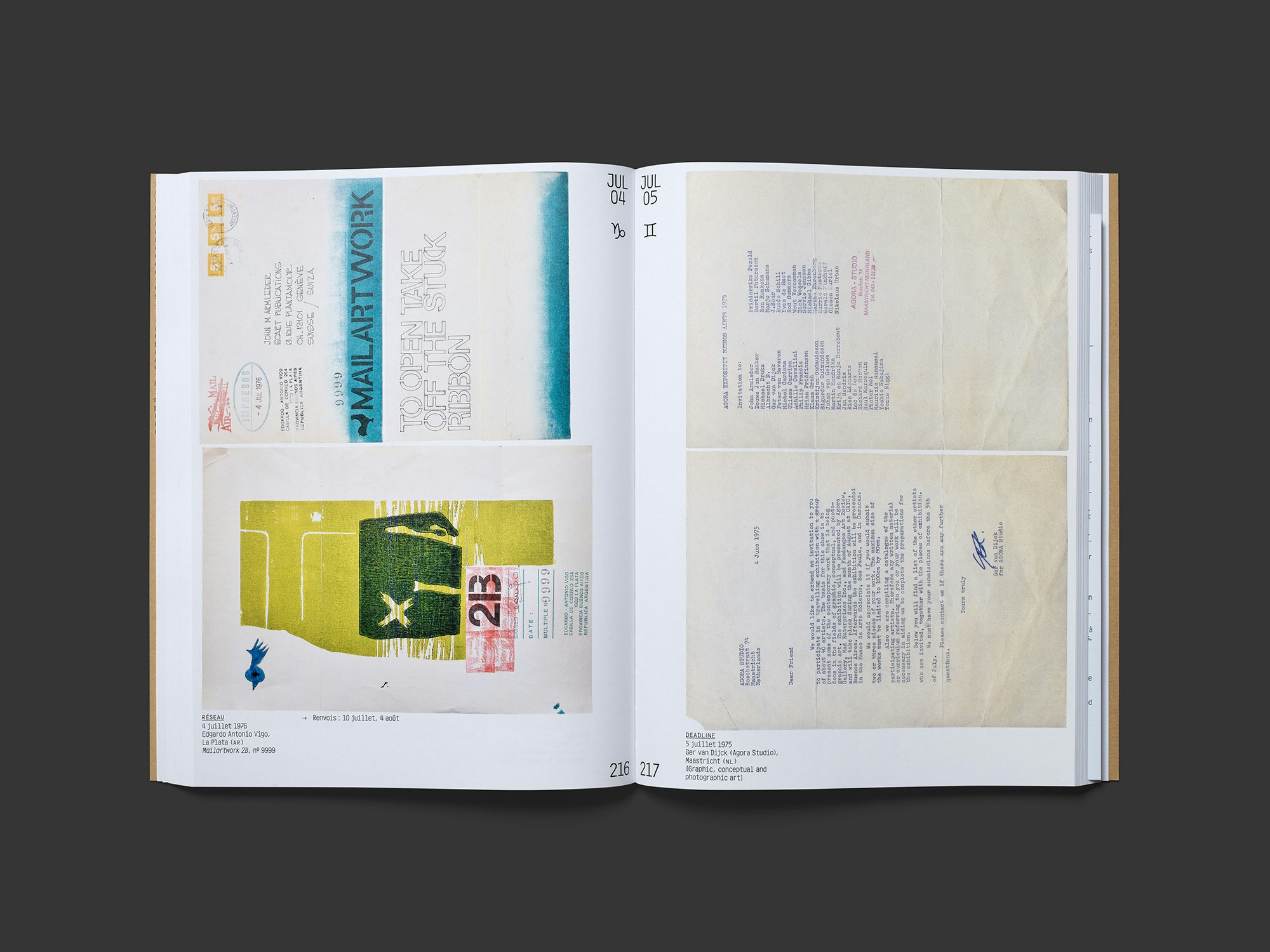 Eine Forschungspublikation zum Archiv des 1969 gegründeten Genfer Künsterkollektivs Ecart präsentiert das sehr schöne Material in streng konzeptioneller Anordnung. Auf jeder Seite wird jeweils ein datierbares Dokument als Faksimiles reproduziert und kurz kommentiert: Briefe, Postkarten, Rechnungen, Einladungen, etc. Die Auswahl erfolgte so, dass jedem der 365 Kalendertage ein Dokument zugewiesen werden kann. Der chronologische Durchgang durch das Buch ergibt ein virtuelles Jahr – tatsächlich stammen die Dokumente aus einem Zeitraum von gut zehn Jahren. Die Seitenlayouts setzen einige Elemente wie Daten und Seitenzahlen fix, während die Platzierung der unterschiedlich grossen Faksimiles nach einer gewissen Systematik variiert. Die ästhetische Erscheinung aller Stücke erinnert daran, dass im Zeitalter von Situationismus und Fluxus gerade auch administrative Dokumente als Kunstwerke eingesetzt wurden. In der grosszügigen Präsentation ergibt sich eine attraktive Mischung und ein aufschlussreiches Zeitdokument. Der braune Schutzumschlag aus Packpapier und der graue Kartoneinband unterstreichen den Archivcharakter, und die Schrift basiert auf einer Schreibmaschinenschrift, die in den Rundbriefen von Ecart Verwendung fand.