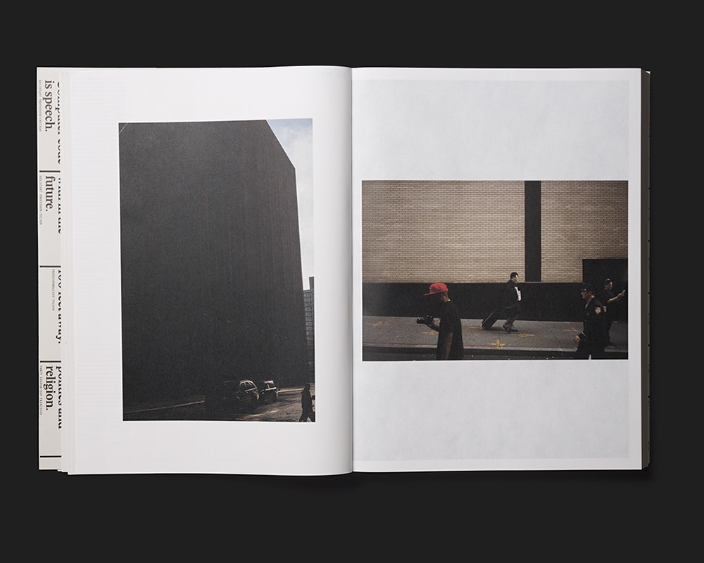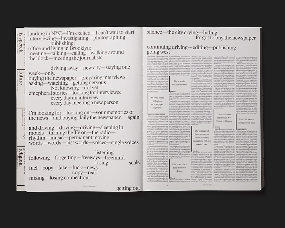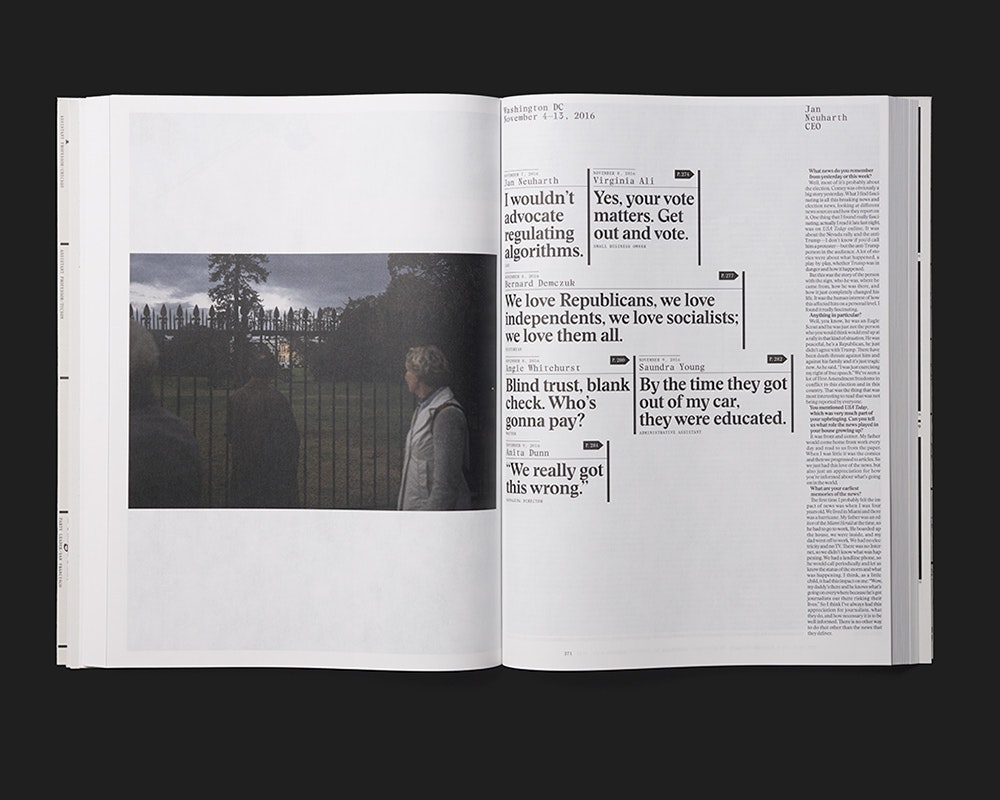 Ein grosser Reportage-Band, der Fotos einer Amerikareise neben Interviews mit Zeitungslesern präsentiert, vertritt ein stark ausgeweitetes Verständnis von grafischer Gestaltung als Informationsvermittlung. Von den Interviews über die Fotografien bis zur Schrift und den Layouts verantwortet der Gestalter sämtliche Informationsebenen des Buchs. Das Material wurde auf einer Reise während des Präsidentschaftswahlkampfs im Herbst 2016 gesammelt, und das Buch ist in gegen 20 Kapitel zu einzelnen Grossstädten gegliedert. Jedes enthält grosse Farbfotos aus der Stadt sowie Interviews mit Einwohnern über ihre Zeitungslektüre und Wahrnehmung der Medienlandschaft. Der fünfspaltige Text wird von grossen schwarz-weissen Porträtfotos der Interviewten unterbrochen, die in mehrfacher Spaltenbreite und variablen Höhen so eingeschaltet sind, dass Weissräume frei bleiben. Teile des Materials waren zuvor online zugänglich, und im Vergleich dazu betont die Buchgestaltung die Linearität und den vorgegebenen Blickpunkt des Druckmediums. Der gefaltete Schutzumschlag im Zeitungsformat, das sehr dünne Papier und die kleine Serifenschrift übertragen Eigenheiten des Zeitungsmediums ins Buch.