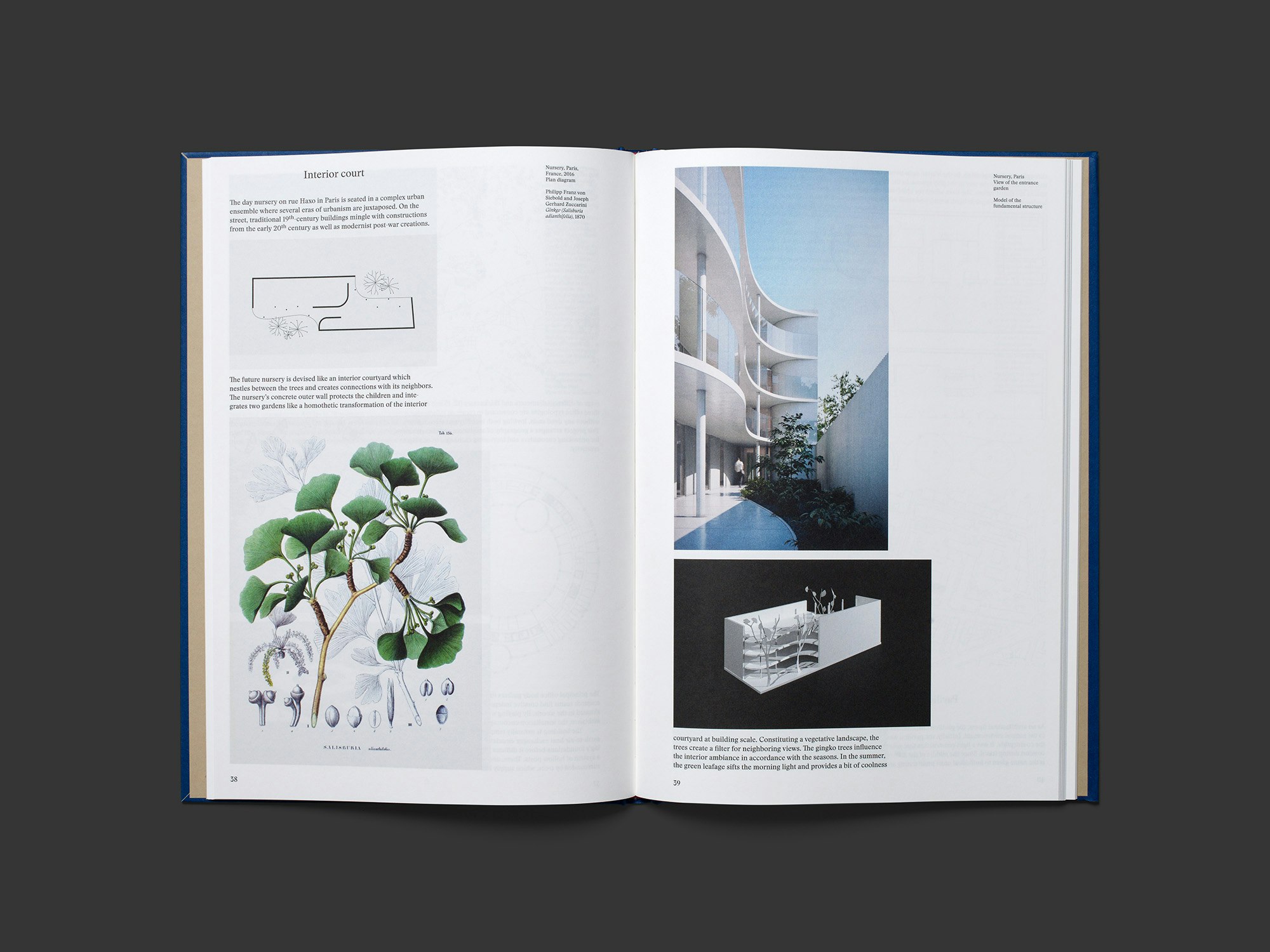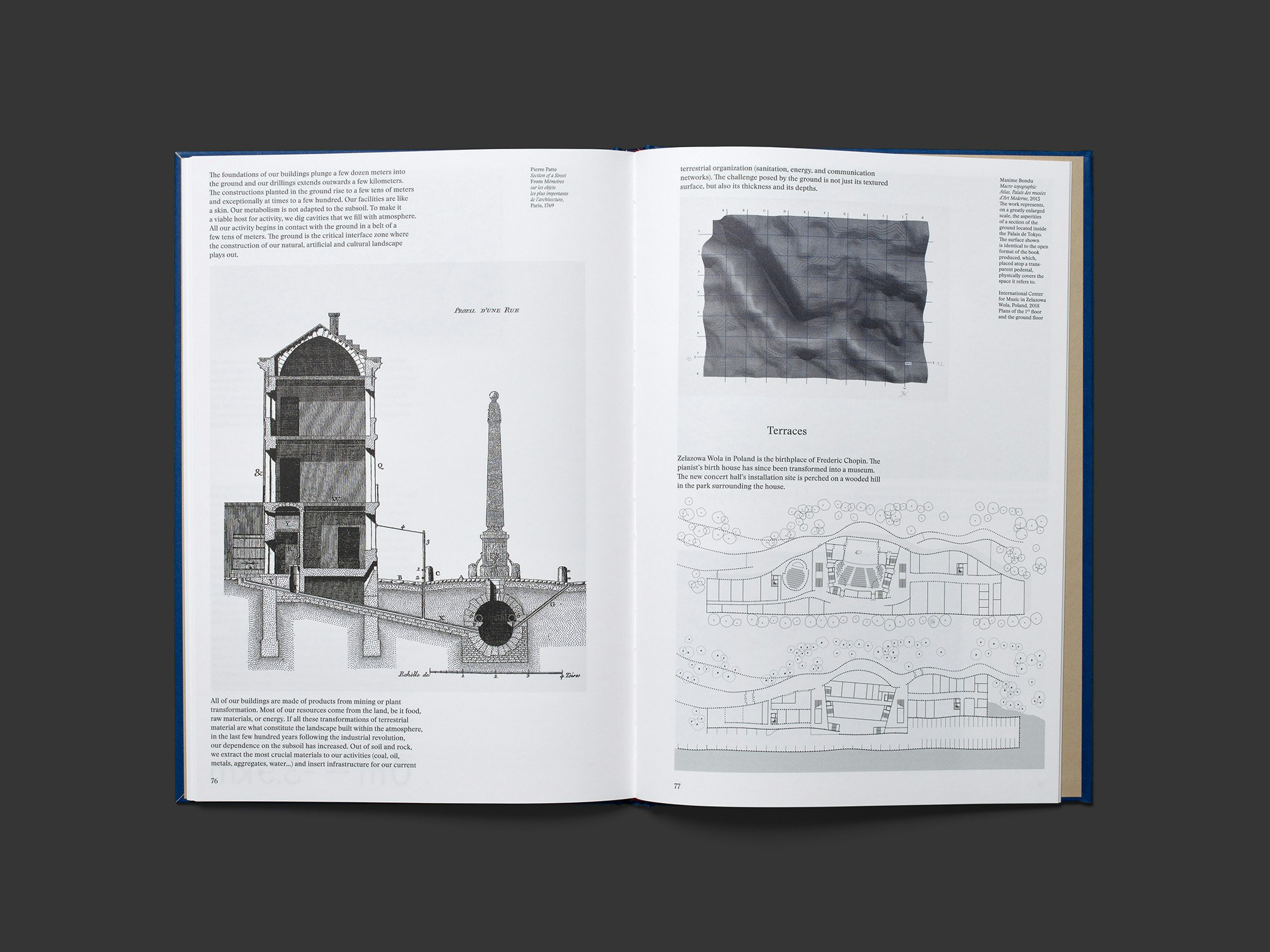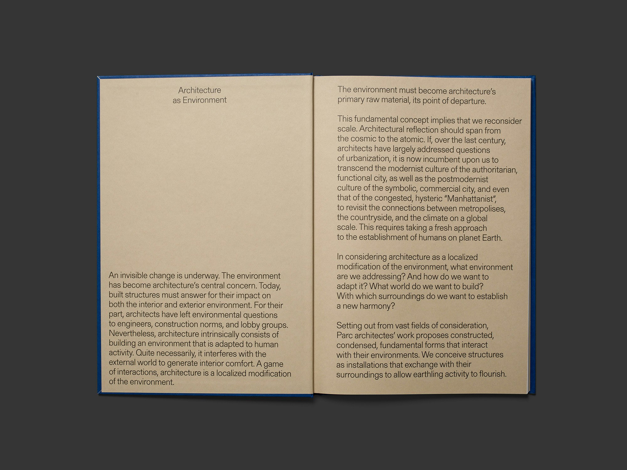 Das grossformatige, dünne Buch mit blauem Hardcover von Parc architectes (Paris) zieht die Betrachtenden in einen attraktiven Bild-Text-Fluss hinein, der die Bauten und Projekte des Büros in erweiterten Zusammenhängen von Kosmologie und Umwelt präsentiert. Es beginnt auf dem beigen Vorsatzpapier mit einem gross gesetzten Einleitungstext, der wie für ein Taschenbuch gestaltet erscheint. Die folgenden 80 Seiten sind übersichtlich in Kapitel strukturiert, die thematisch vom Kosmos über die Atmosphäre bis auf die Erdenbewohner und den Boden hinunteführen. Innerhalb der Kapitel geht die Übersicht allerdings leicht verloren, denn auf jeder Doppelseite werden verschiedenartige Bilder und Textblöcke in unterschiedlichen Grössen innerhalb eines Rasters frei kombiniert. Es wirkt weniger wie ein linear lesbares Buch als wie eine Website, auf der man sich hier und da etwas zum Betrachten und Lesen herauspicken kann. Alles ist energiegeladen, doch in vielen Details subtil. Man spürt das Engagement und die Freude aller Beteiligten. Eine der ungewöhnlichen Architektur-Publikationen im diesjährigen Wettbewerb und ein Zeugnis für die neue Aufbruchstimmung im französischen Grafikdesign.