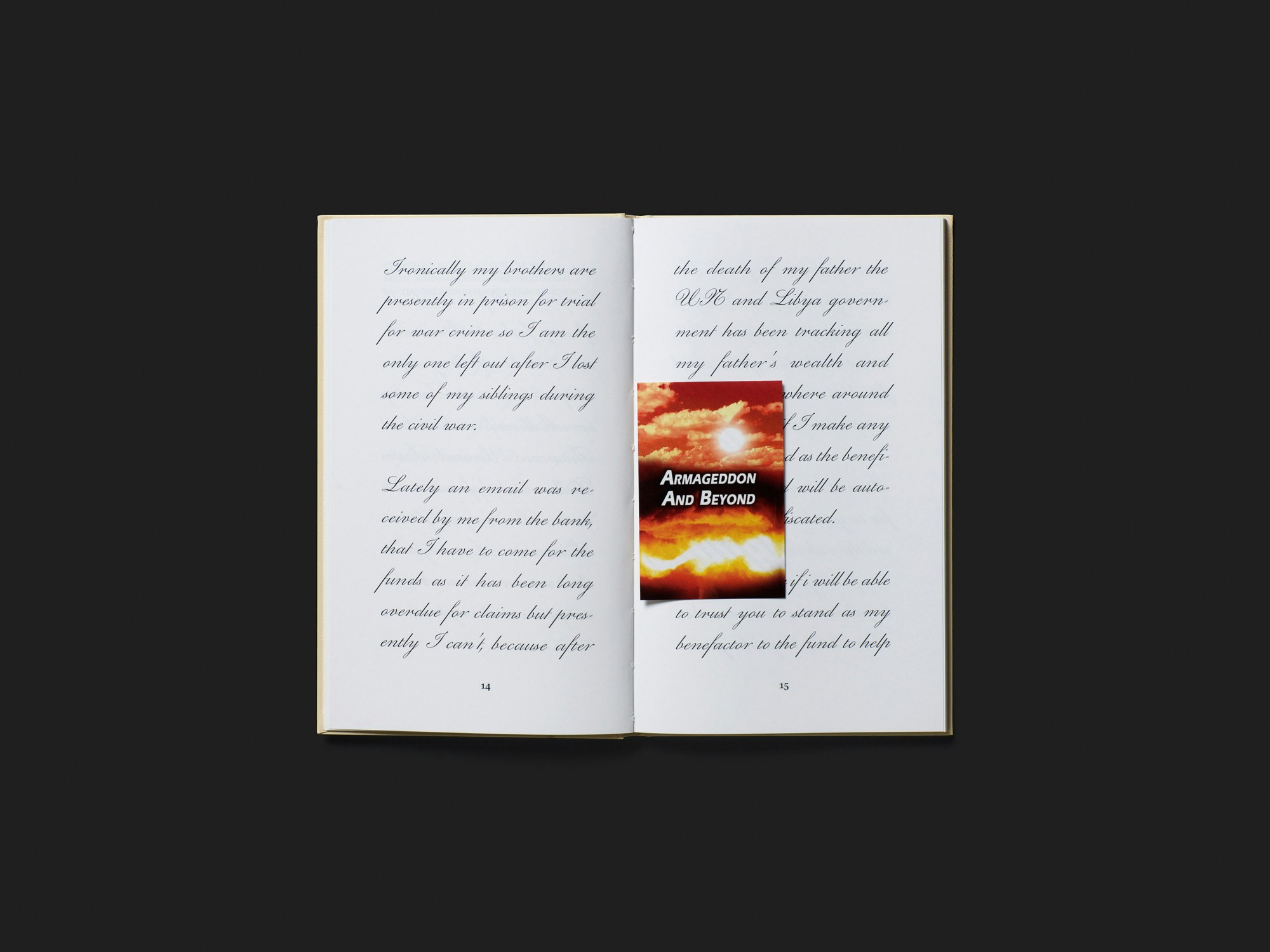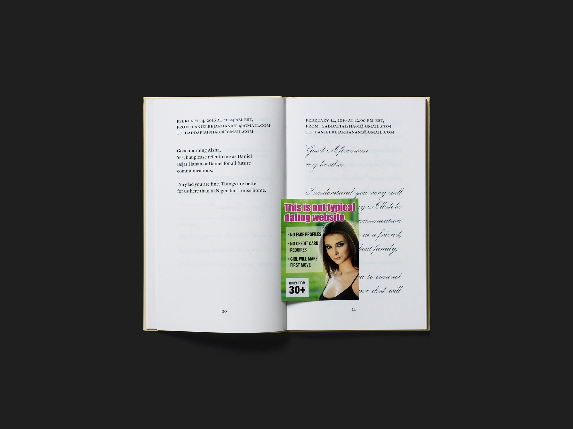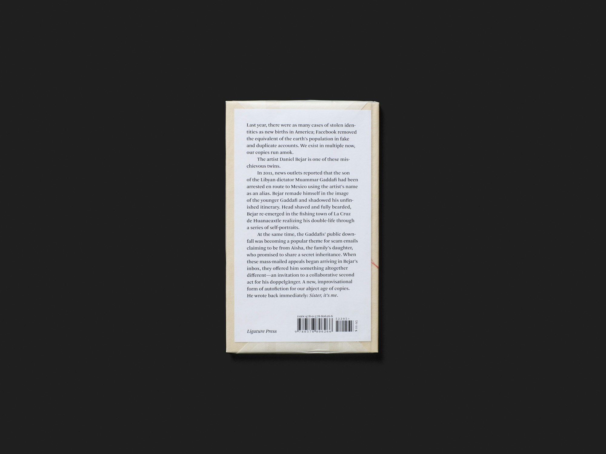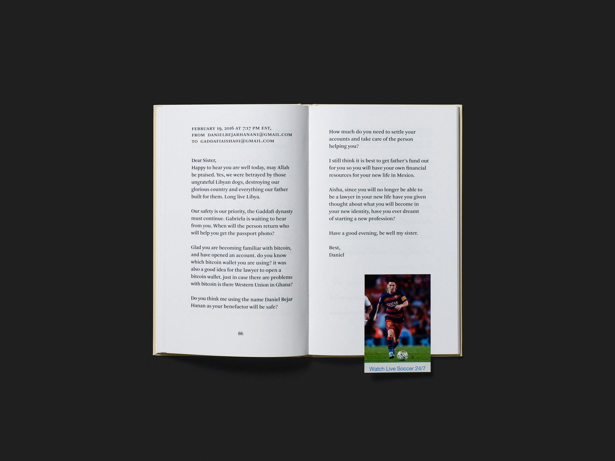 Ein kleines, dünnes Textbuch mit beigem Hardcover des US-amerikanischen Künstlers Daniel Bejar, das von Identitätsdiebstahl und Phishing Emails handelt, inszeniert ein gestalterisches Spiel mit diversen Fallen. Auf den ersten Blick ist es schwer zu kategorisieren und wirkt am ehesten wie ein Briefroman; eine kalligrafische Schrift evoziert sogar Liebesbriefe. Der Text erweist sich aber als Email-Austausch des Künstlers mit unbekannten Betrügern, die im Namen von Aisha Gaddafi – Tochter des 2011 getöteten lybischen Staatschefs – Hilfe beim Zugang zu einem verwaisten Millionen-Konto suchen. In Reaktion darauf posiert der Künstler als Saadi Gaddafi, ein Bruder Aishas, welcher seinerseits 2011 in einem durch mexikanische Behörden aufgedeckten Identitätsdiebstahl angeblich unter dem Namen von Daniel Bejar einreisen wollte. Der absurde Email-Verkehr verläuft über 150 Seiten mit viel Weissraum und wird nur durch kleine, zwischen die Seiten eingelegte Zettel unterbrochen, die bunte Online-Fake-Werbungen zeigen. Wie unerwünschte Pop-ups erfordern sie eine direkte Interaktion: