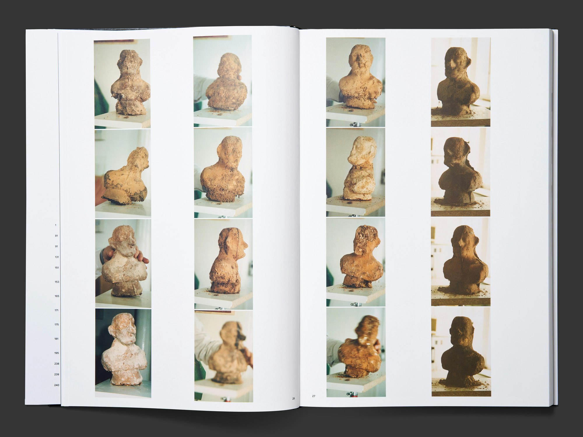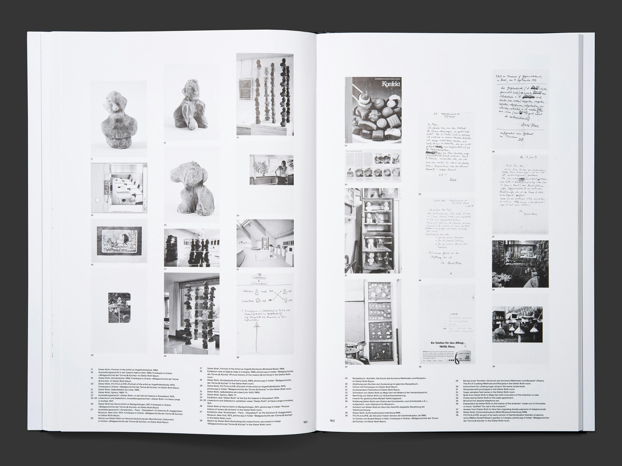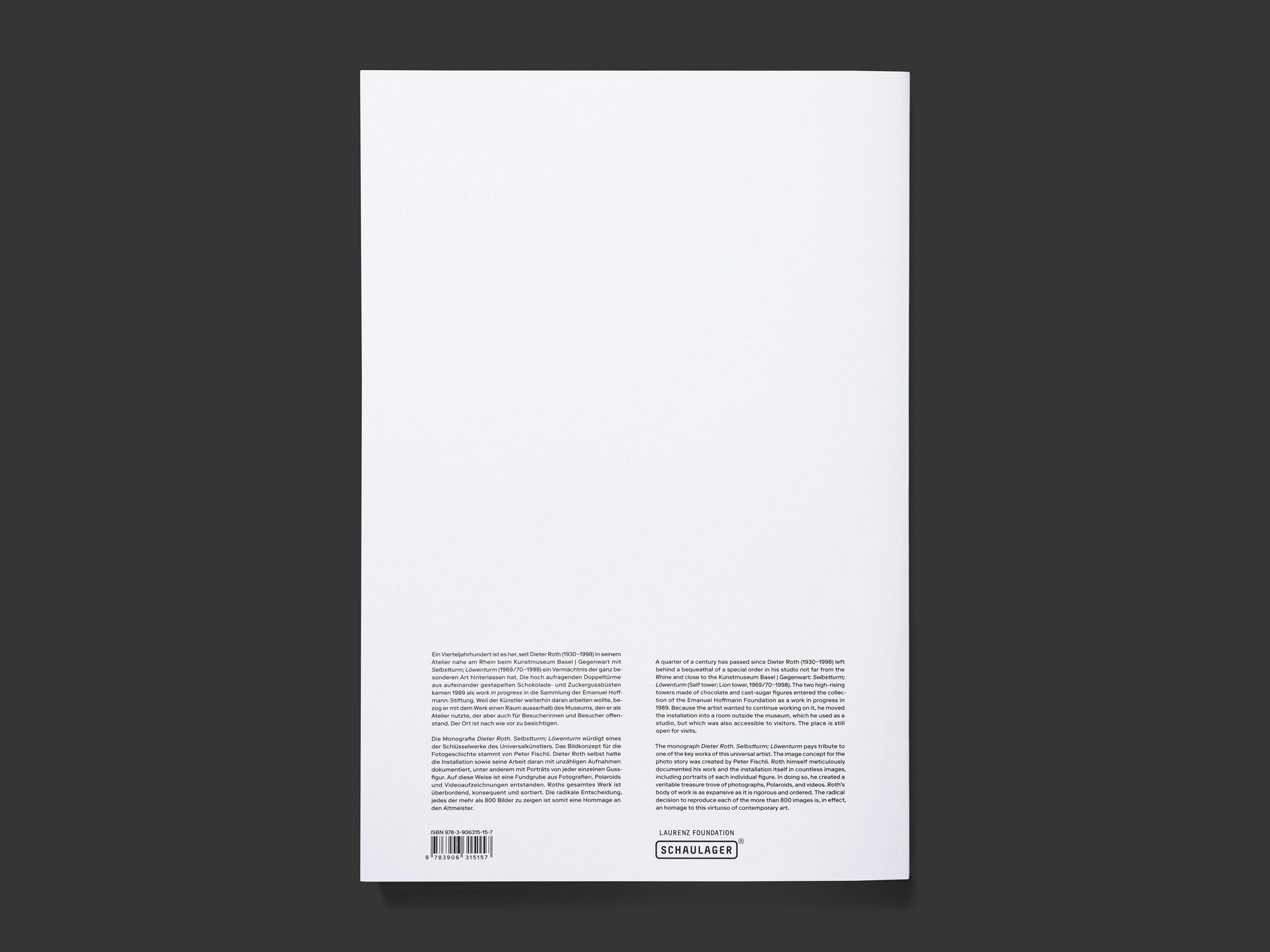 Weit über tausend kleine Fotos und Videostills zeigen in einem übergrossen, schmalen Hochformat die obsessive Arbeitsweise und ungeschönte Ästhetik Dieter Roths, ohne dass es wie ein Buch von Roth aussieht. Dokumentiert wird ein einst in toto verkaufter Basler Arbeitsraum Roths, in dem über viele Jahre hinweg sporadisch zwei Serien von Kleinskulpturen – die «Selbst» und die «Löwen» – aus Schokolade und Zucker gegossen und auf turmartigen Gestellen gelagert wurden. Seit Roths Tod 1998 blieben die langsam zerfallenden Skulpturen zugänglich, bis eine technische Panne mit dem Raumklima 2007 eine (an sich paradoxe) Restauration notwendig machte. In dem monumentalen Buch sind Roths repetitive Fotos der Skulpturen in zwei Kolonnen pro Seite in Originalgrösse ausgelegt, die kleineren Videostills in drei Kolonnen. Die Wiedergabe des Materials ist sehr direkt; im Essayteil kommen Faksimiles der von Roth schriftlich fixierten Kauf- und Nutzungsbedingungen dazu. Trotz der rigiden Struktur ergeben sich in den Seitenlayouts vereinzelte Unregelmässigkeiten und Pausen, und die kinematografische Darstellungsweise bringt geschickt den für das Werk elementaren Faktor Zeit ins Spiel.