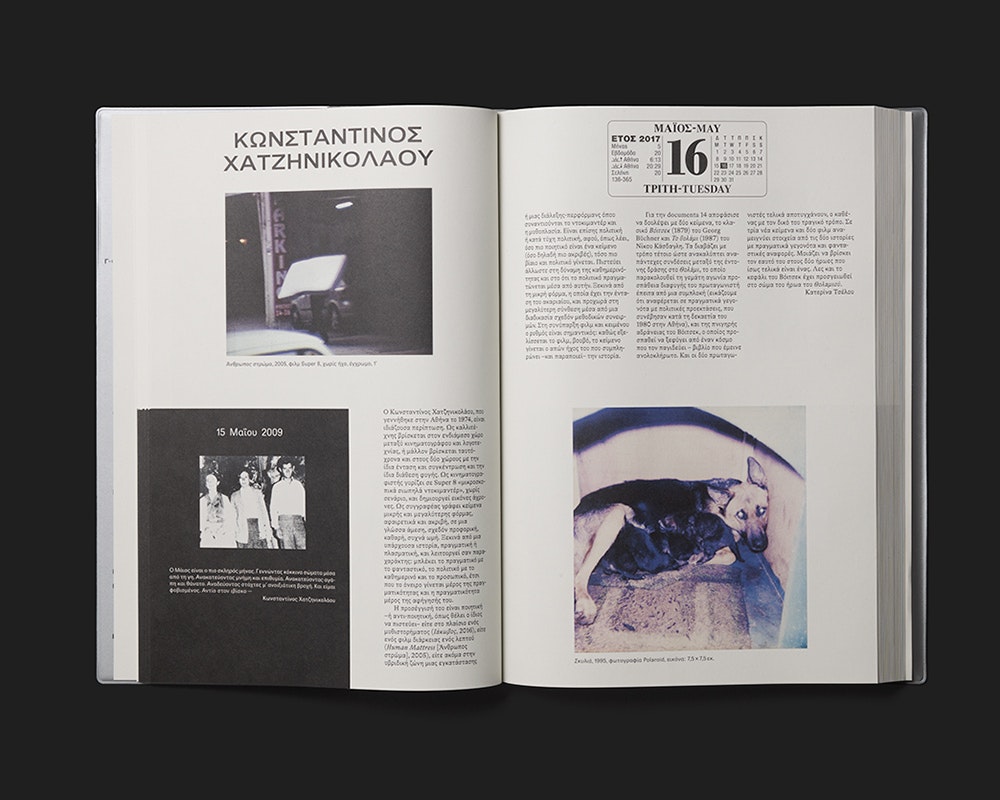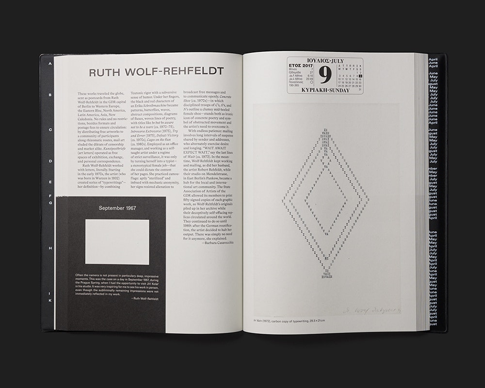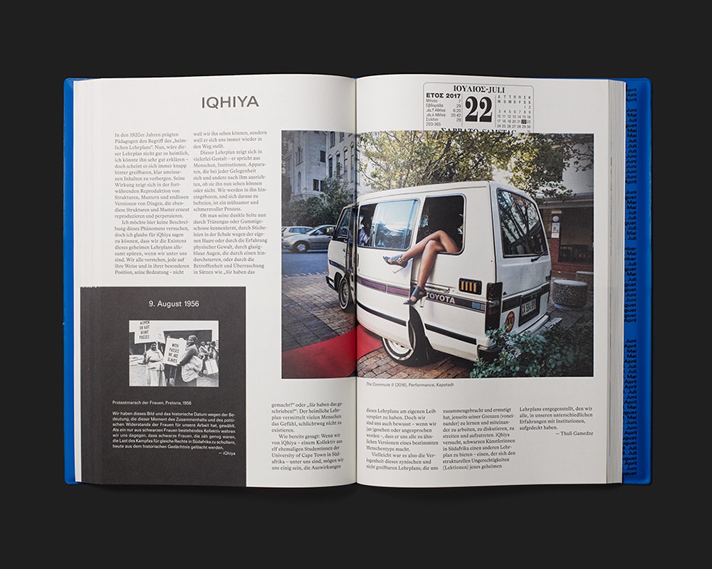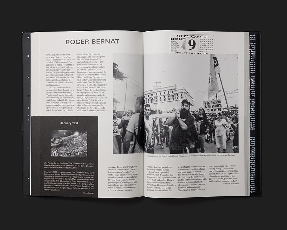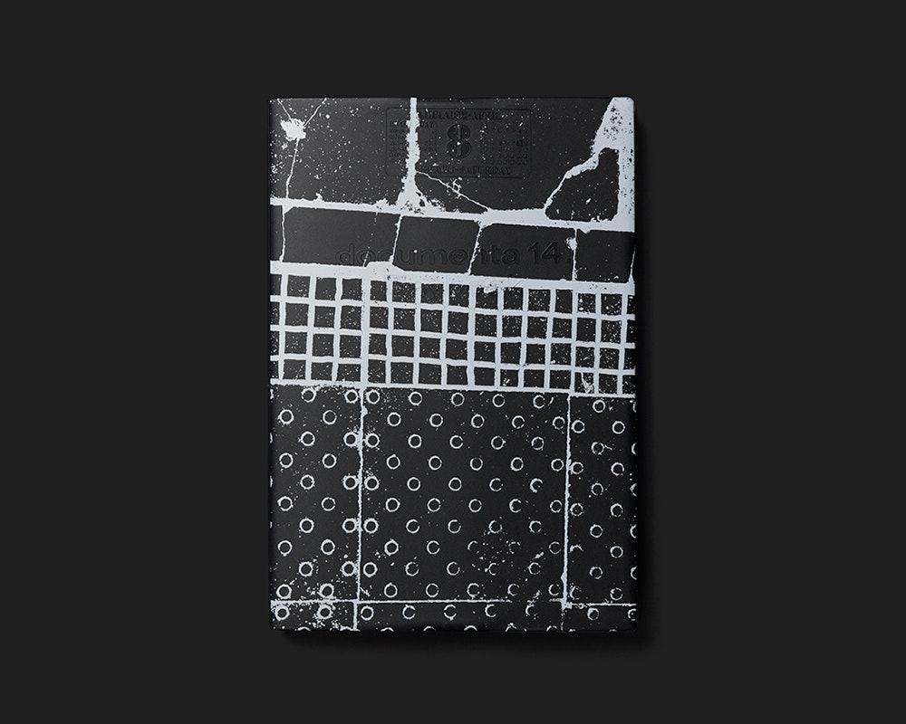 Der Ausstellungsführer zur documenta 14 operiert mit einer doppelten Chronologie, welche das «hier und jetzt» der Kunst-Betrachtung in komplexer Weise auflädt: Zum einen wird die Ausstellungsdauer in die Dauer der Buchlektüre übertragen, indem anstelle von Seitenzahlen die Tage der documenta 14 fungieren. Sie stehen in einem Kalenderlayout jeweils am oberen Rand einer rechten Seite, sodass die Zahl der Doppelseiten im Buch der Anzahl Ausstellungstage entspricht. Zum anderen wurden alle beteiligten Künstlerinnen und Künstler – die jeweils auf einer Doppelseite in Bild und Text vorgestellt werden – nach einem für ihre Arbeit bedeutenden historischen Referenzdatum gefragt. Diese Daten erscheinen in einem immer gleichen schwarzen Rechteck links unten auf der Doppelseite und sind mit einem kleinen Bild und kurzem Text erläutert. Sie sind nach einer rückwärts laufenden Chronologie angeordnet und bestimmen so die Reihenfolge, in der die Künstlerinnen und Künstler im Buch erscheinen. Die höchst konzeptionelle Gestaltung fügt der Ausstellung einen Mehrwert hinzu und erzeugt gleichzeitig eine ganze eigene Stimmung. Eine mit «Dear Reader» überschriebene Einleitung erläutert die Konzeption und erleichtert den Einstieg.