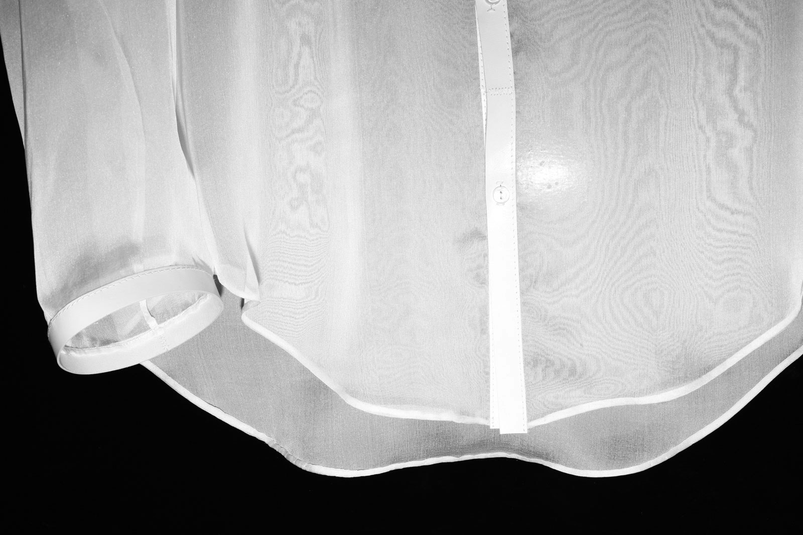 Für den Designer liegt das Hauptinteresse in der Durchsicht auf die nackte Haut. Welche Körperpartien sind sichtbar, wie verändert sich die Transparenz in der Bewegung der Trägerin oder des Betrachtenden? Gewisse Teile ändern den Grad der Transparenz je nach Distanz von kleinen Schlitzen bis hin zu kompletter Nacktheit. Andere Stoffe enthüllen die Haut je nach Blickwinkel auf das Kleidungsstück. Manche Stoffstreifen legen sich auf Wölbungen nieder, sodass Einblicke verhindert werden. Dominic Knecht schafft es, mit raffinierten Schnitten und eine interessanten Technik eine Kollektion für eine verführerische Frau zu machen, die trotz Einblicken, die sie bietet, niemals aufdringlich wirkt.