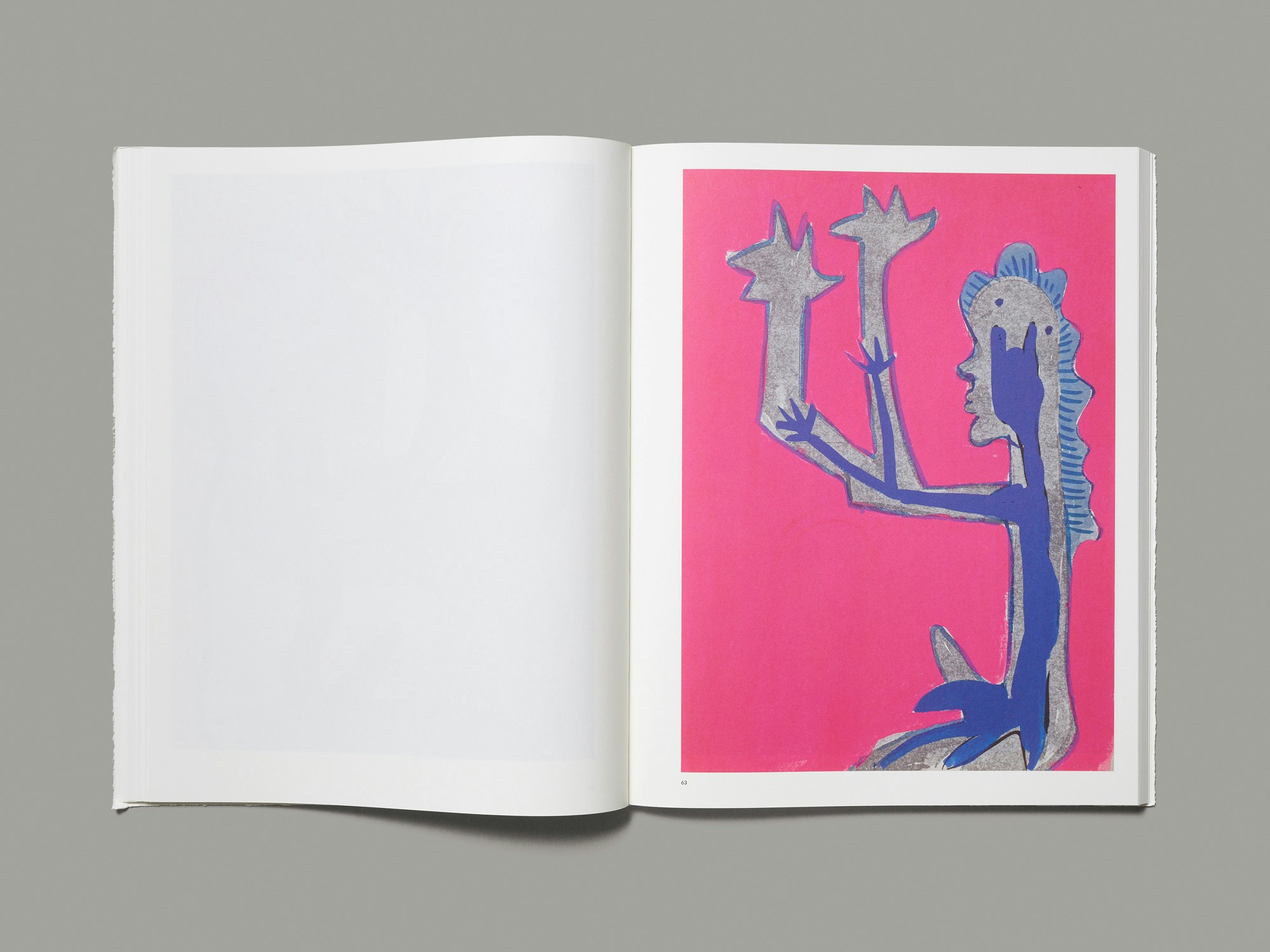 Das grosse, schwere, aber sehr weiche Buch von General Idea erzeugt mit dem unregelmässig abgerissenen Rand des schwarz auf weiss bedruckten Softcovers sofort eine starke haptische Wirkung. Es liegt sehr gut in den Händen und lädt dazu ein, die Seiten umzuschlagen. Auf jeder rechten Seite (und gelegentlich auch auf einer linken) ist in identischem Grossformat eine bunte Zeichnung von karikaturhaften Gesichtern und Gestalten zu sehen, die aus abstrakten Formen, Genitalien, Tierkörpern, Alltagsobjekten oder buddhistischen Mustern zusammengesetzt sind. Die Zeichnungen entstanden als Nebenprodukt der Konzeptkunst von General Idea während zahlreicher Arbeitssitzungen Anfang der 1990er-Jahre. Trotz der Kollektiv-Signatur G.I. stammen alle von Jorge Zontal, der ebenso wie Felix Partz 1994 an AIDS starb. Das dritte Mitglied von General Idea, AA Bronson, fungiert als Herausgeber des Bandes, der somit auch dem Gedenken an die Freunde und an die von AIDS zerrüttete New Yorker Schwulenszene jener Jahre dient. Auf letztere wird der kunsthistorische Genre-Titel Ecce Homo hier für einmal bezogen. Körperlichkeit und Verletzlichkeit kommen auch in einem schmalen, pinken Faltblatt zum Ausdruck, das zwei erläuternde Begleittexte enthält und ins Buch eingelegt ist. Die Reproduktion der Zeichnungen ist trotz des ungestrichenen Papiers ausgezeichnet.