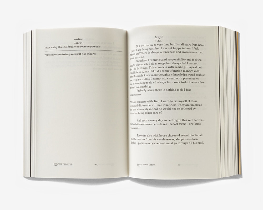 Cet ouvrage de 900 pages à couverture souple en carton contrecollé de toile couleur bordeau est constitué d'une douzaine de cahiers reproduisant les notes manuscrites du journal qu'Eva Hesse a tenu depuis l'âge de 19 ans jusqu'à sa mort précoce à 34 ans (1970). La transcription typographique des manuscrits est particulièrement convaincante. Comme le montre l'exemple figurant en toute fin d'ouvrage, les pages ont été divisées en huit colonnes sur la base desquelles le livre est structuré. La taille de police a été unifiée tandis que les majuscules, les soulignés et les biffures ont été conservés. L'originalité du volume tient à une toute série de détails : le papier jaune des pages de garde, une photo d'Eva Hesse en début d'ouvrage, ou encore la séparation des cahiers par deux feuilles noires visibles sur la tranche. Grâce à sa couverture souple et à son dos libre, le livre, pour volumineux qu'il soit, est agréable en mains. Le design calme et soigné contribue au plaisir de la lecture.