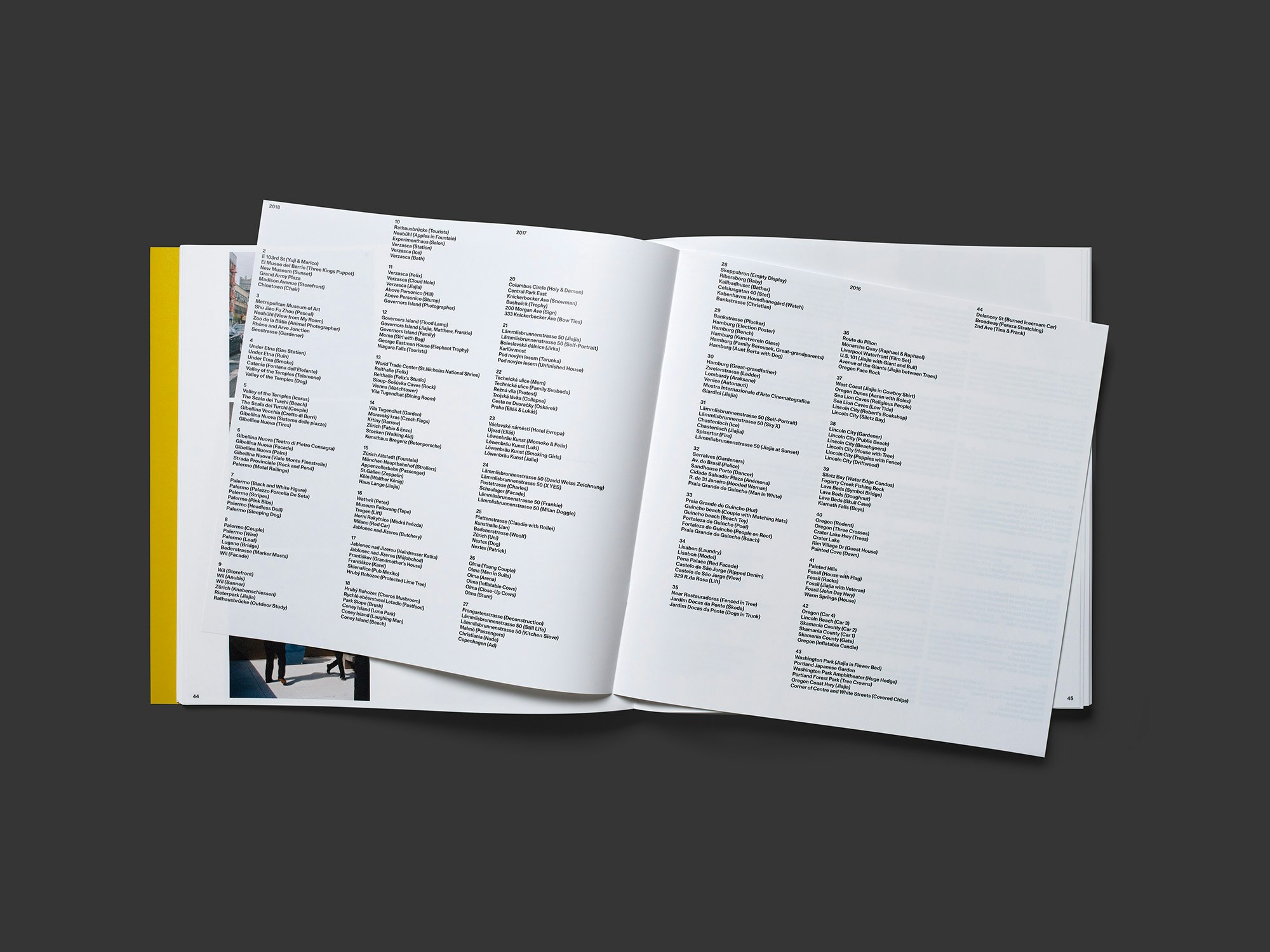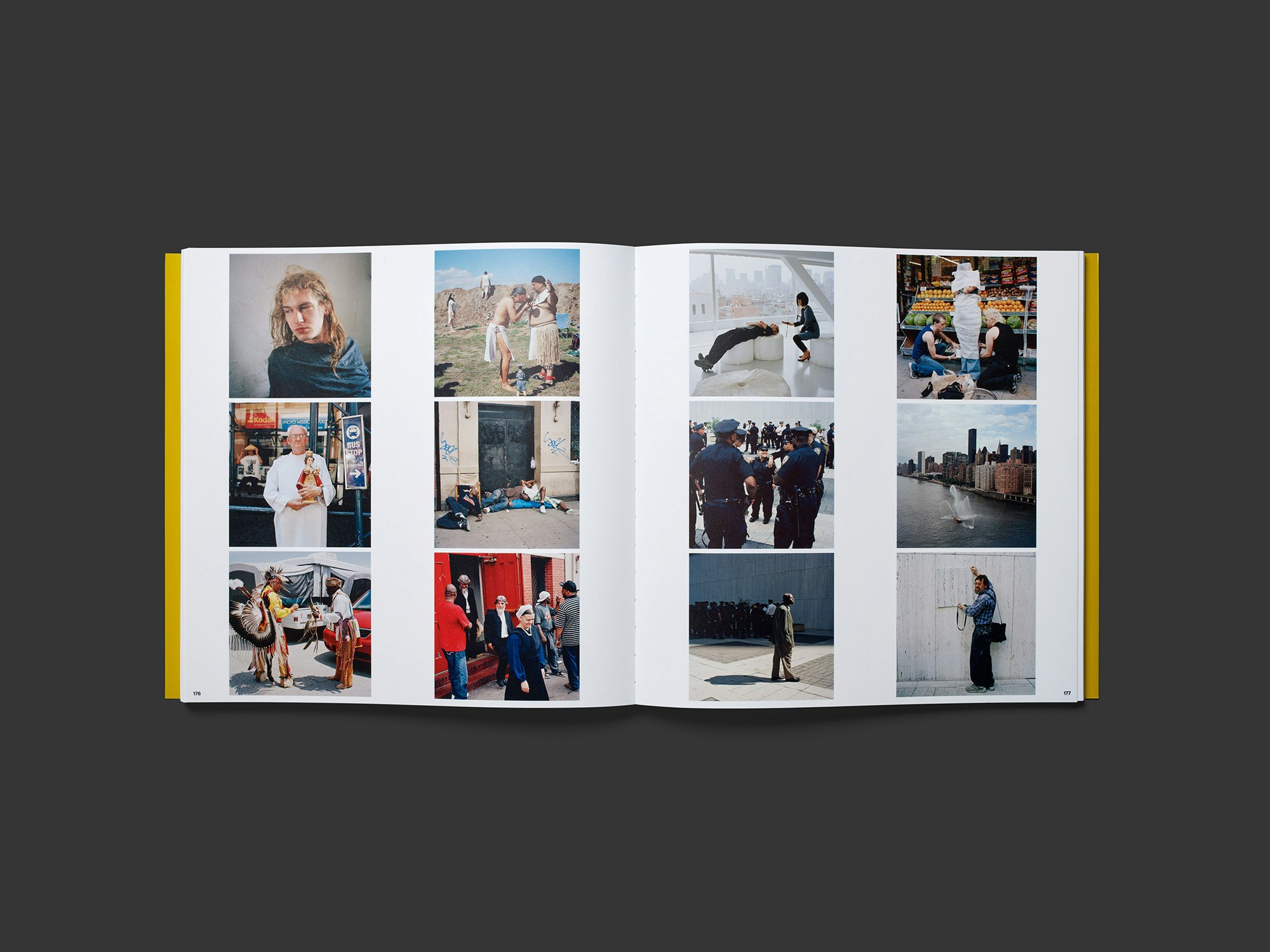 Das grosse, quadratische Fotobuch mit Softcover und gelbem Schutzumschlag aus einem ungewohnten Papier kombiniert extrem reduzierte Gestaltung mit aufwändiger manueller Bildredaktion. Über 1500 quadratische Fotos von Jiří Makovec sind auf der Doppelseite in vier Spalten zu drei Bildern angeordnet. Einziges typografisches Element sind die Seitenzahlen in den unteren äusseren Ecken. Das Bildverzeichnis liegt als Insert in etwas kleinerem Format bei und macht deutlich, dass die Fotos in rückläufiger Chronologie von 2018 bis 2002 gruppiert sind, doch innerhalb jedes Jahres frei arrangiert wurden. Die Zusammenstellung auf den Doppelseiten ist denn auch höchst subtil auf Formen und Inhalte abgestimmt. Die ungewohnten Szenen in der Öffentlichkeit, die Makovec oftmals festhält, verbinden sich zu rätselhaften und anspielungsreichen Narrativen, sodass die archivarische Präsentationsweise mit der eines Reisejournals gepaart wird. Aufgrund des grossen Gewichts und Formats – identisch mit einer Schallplattenhülle – sowie aufgrund des Softcovers ist das Objekt nicht ganz einfach in den Händen zu halten. Der Inhalt erscheint derart gewichtig, dass er die Buchform infrage stellt.