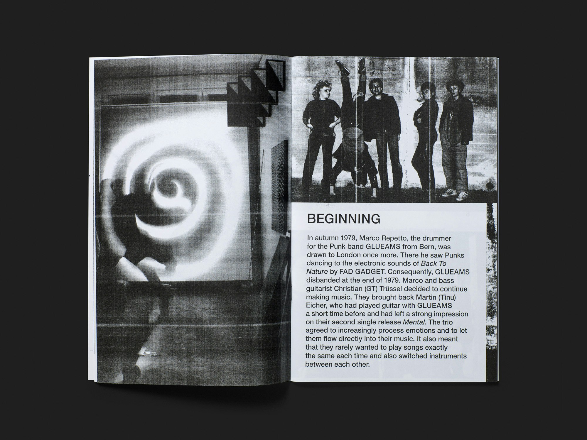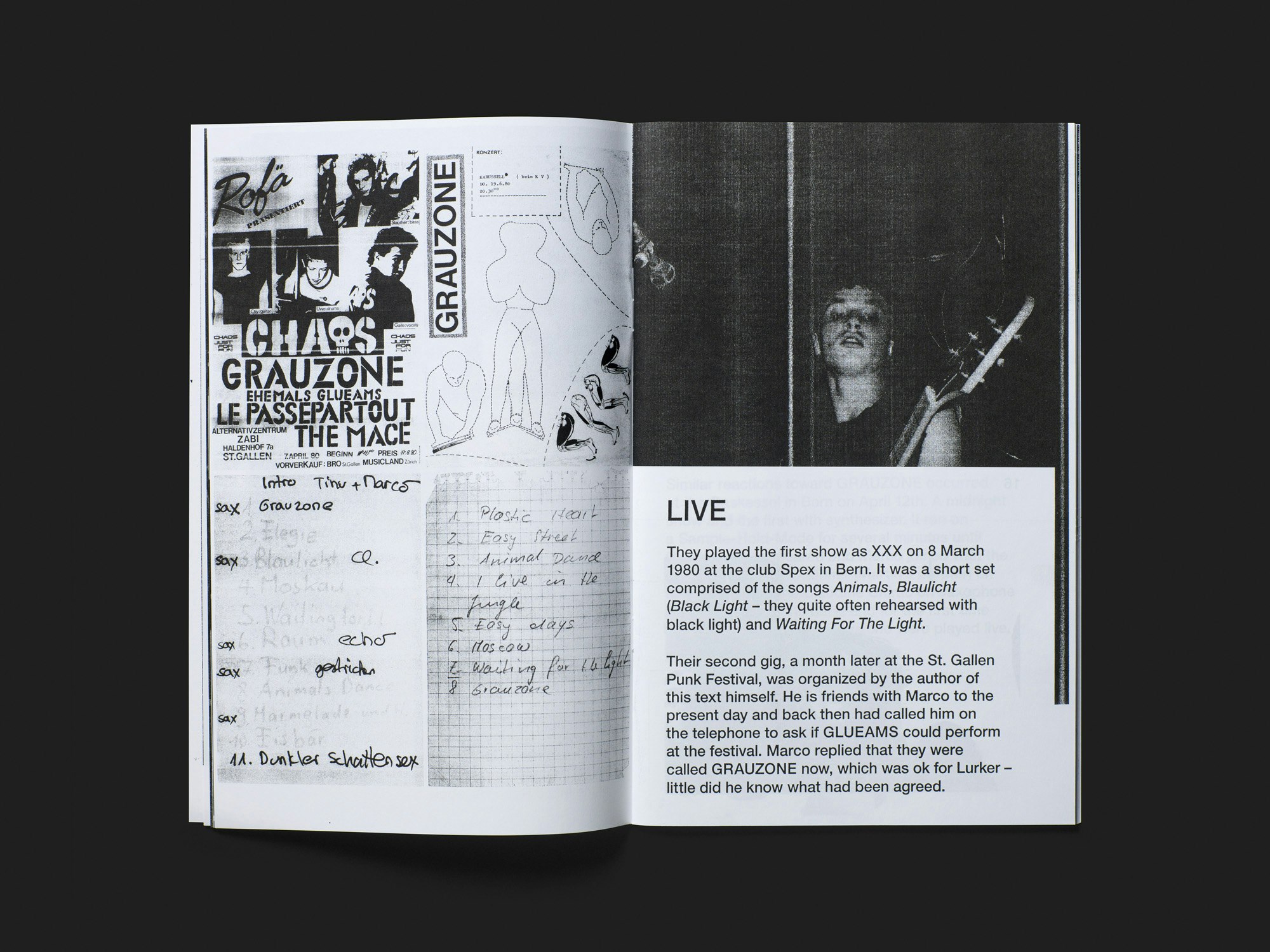 Ein gänzlich schwarz-weisses Heft in schmalem Hochformat erweist sich als unprätentiöse Autobiografie der Schweizer 1980er-Jahre-Band Grauzone, die reichhaltiges Material in verdichteter Form präsentiert. Von aussen wirkt es wie ein schnell produziertes Fanzine, doch im Inneren wird in beeindruckend schlichter Weise eine gründlich recherchierte und geradezu autoritative Geschichte erzählt. Ein mehrteiliger Essay, der die ebenso kurzlebigen wie legendären Aktivitäten der Band detailreich rekonstruiert, zieht sich in relativ grosser Schrift durch das Heft. Auf jeder Doppelseite kommen ein bis fünf historische Quellen dazu: Konzertfotos, Zeichnungen für Album-Covers, Plakate, Rezensionen, Briefe, etc. Alle sind kontrastreich in Fotokopie-Manier wiedergegeben, und dazwischen sind in gleicher Weise ein Dutzend Werke von visuellen Künstlerinnen und Künstlern aus dem Umfeld der Band abgebildet. Der offenkundige Rekurs auf publizistische Praxis und Ästhetik des Punk ist nicht blosse Mimikry, sondern als Appropriation in der Sache begründet: Die Publikation erzählt von den 1980er-Jahren und sieht auch danach aus.