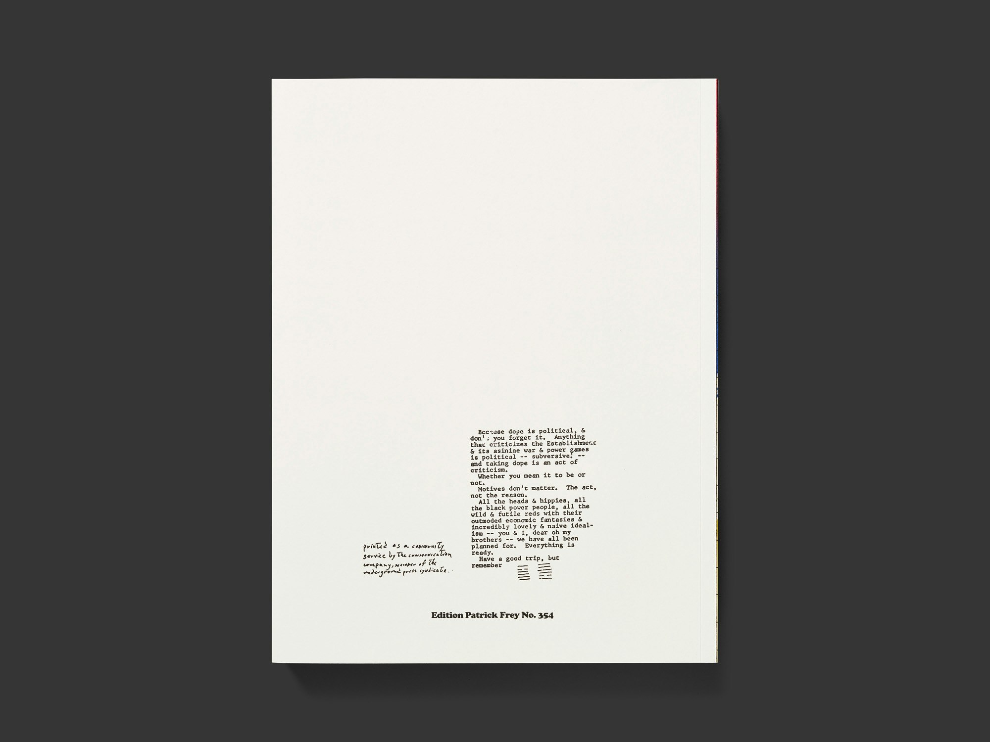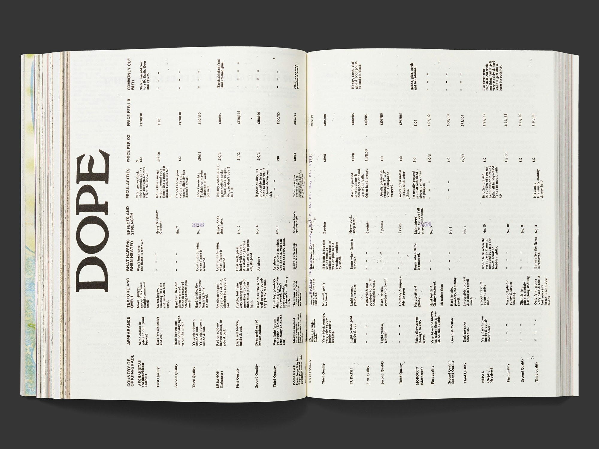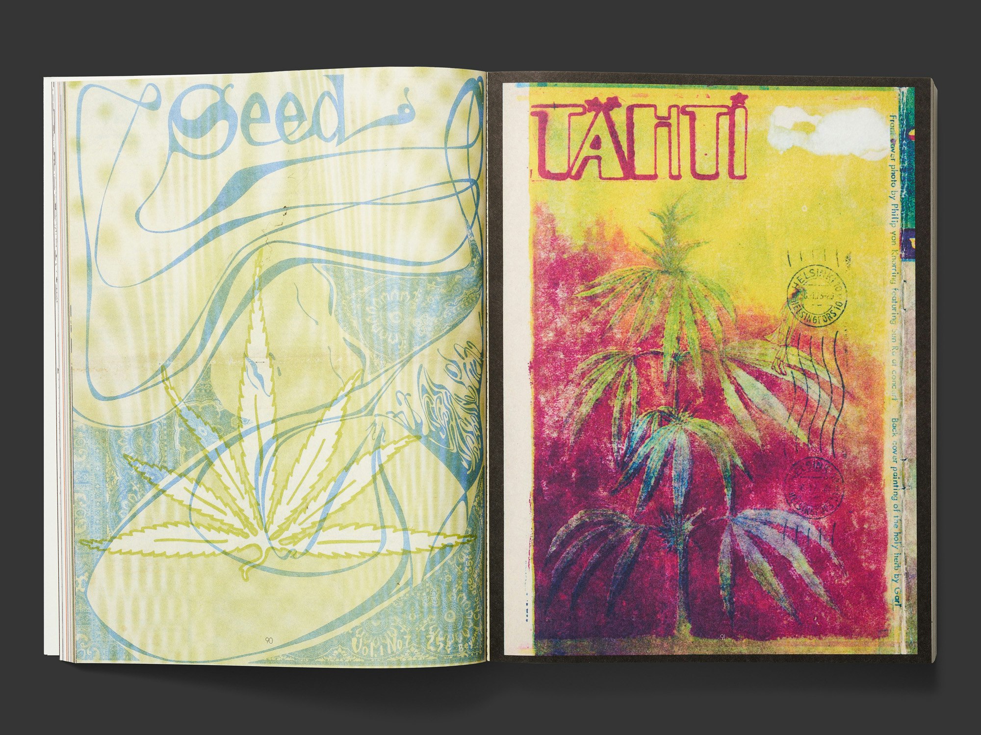 Die umfangreiche Sammlung von Zeitschriftenausschnitten der 1960er und 70er Jahre zum Thema Marihuana bietet eine energiegeladene Hommage an Illustrationen, Schriften und Designstile der damaligen Zeit. Die reproduzierten Seiten stehen meist einzeln auf einer Buchseite, sind oft angeschnitten und fast immer randabfallend gedruckt. Sie sind thematisch