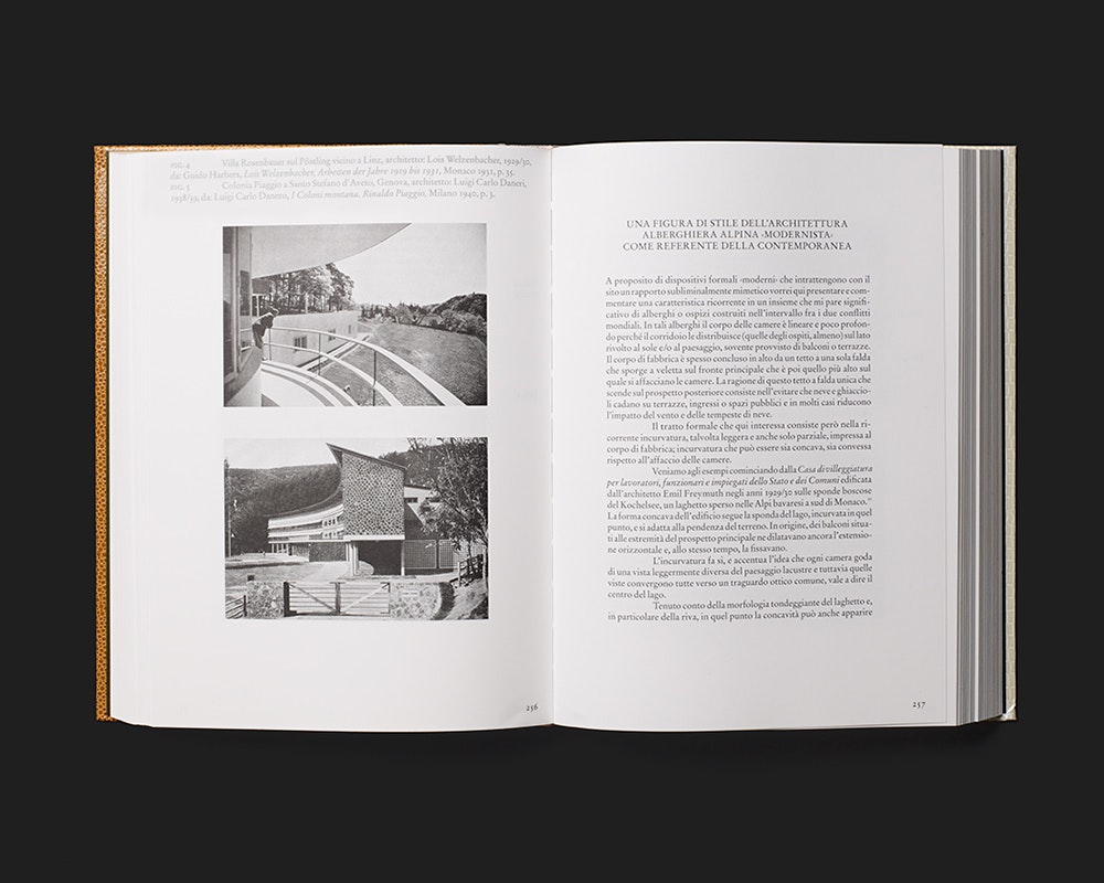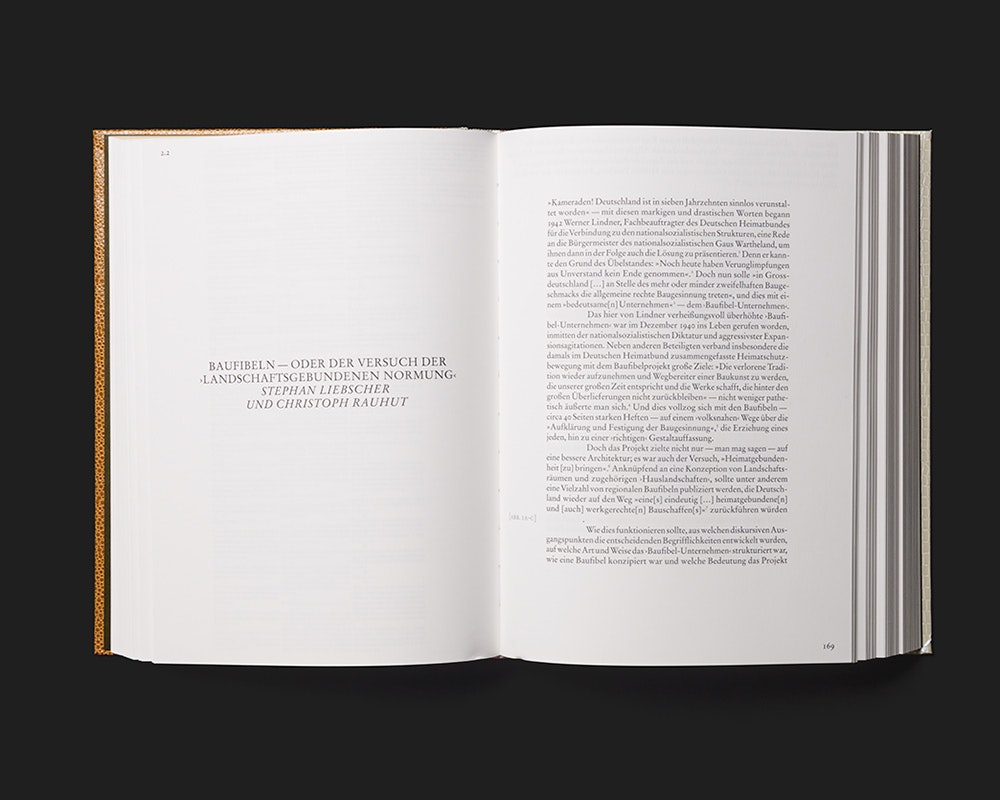 Ein mittelgrosser, sehr umfangreicher Band mit Hardcover in Kunstleder-Einband enthält reich illustrierte, wissenschaftliche Aufsätze zu «Heimat»-Vorstellungen im 20. Jahrhundert. Das historische Bildmaterial ist im Schwarz-Weiss- und Vierfarbendruck durch Silber ergänzt, und sämtlicher Text ist in der 1920 lancierten Stempelversion der Garamond gesetzt. Dies ergibt eine bekannt anmutende Bild-Text-Typologie, die aber durch zeitgenössische Details unterlaufen wird. Die Aufsatztitel stehen jeweils in kleinen Versalien zentriert auf einer linken Seite, rechts oben setzt der einspaltige Text ein, und zuletzt folgen sehr klein gesetzte Endnoten in dicht gefüllten schmalen Spalten. Referenzabbildungen sind nummeriert und vergleichsweise gross meist allein oder zu zweit auf einzelnen Blättern eingefügt. Die gross gesetzten Bildlegenden in Silber stehen jeweils am oberen Seitenrand. Mit foliengeprägtem Umschlag, leicht durscheinendem Papier (das den Raster hervortreten lässt) und einseitigem Goldschnitt ist der Band absichtsvoll pompös. Das schöne Buch erscheint als eine Konstruktion, die nicht anders als «Heimat»-Vorstellungen dem historischen Wandel unterliegt.