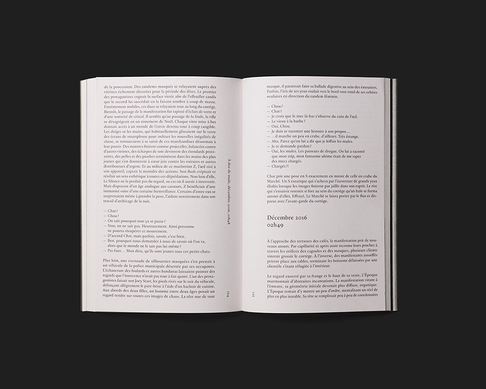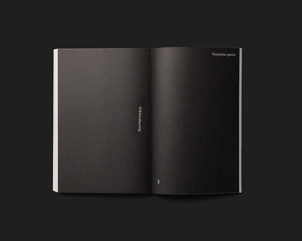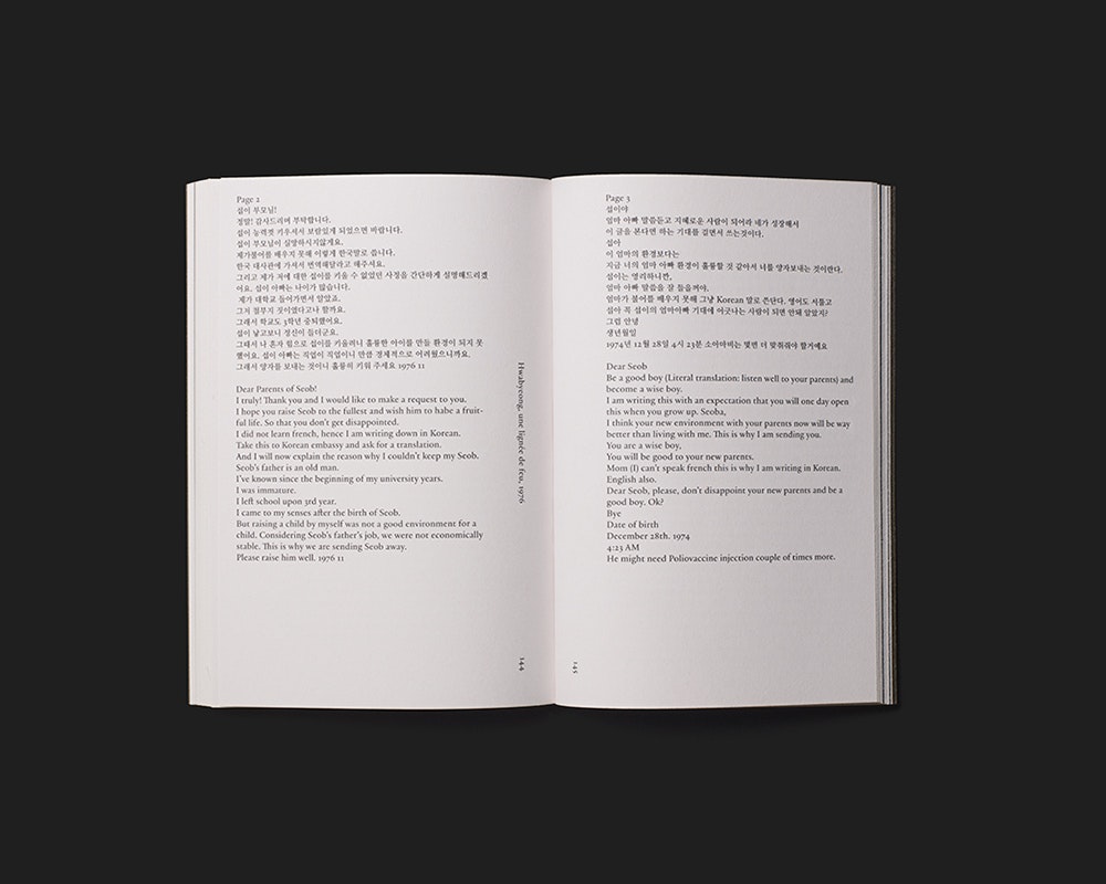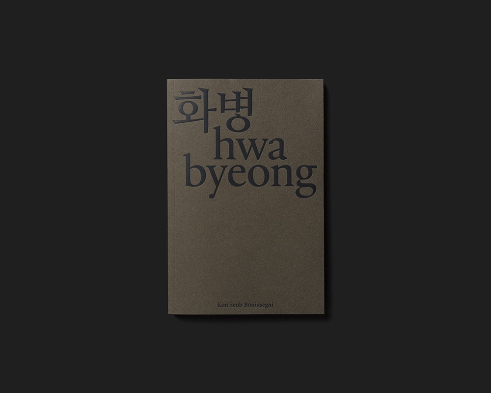 Der in Korea geborene, schweizerisch-französische Künstler Kim Seob Boninsegni publiziert ein sehr leichtes, schwarz-weisses Textbuch, das aus kleinem Budget und einfachen gestalterischen Mitteln das Maximum herausholt. Zahlreiche Kurztexte von einer halben bis sechs Seiten Länge – darunter auch acht Gastbeiträge – sind inhaltlich zu drei übergeordneten Narrativen verbunden. Die eigentümliche Textkomposition wird gestalterisch durch schlichte Entscheidungen unterstrichen: Die einzelnen Texte beginnen jeweils auf einer rechten Seite, sodass die Lektüre an jedem Punkt einsteigen kann. Gelegentlich linksstehende, einzelne Sätze fungieren als Zwischenglieder, die den narrativen Zusammenhang herstellen. Und die drei Narrative sind durch schwarze Doppelseiten voneinander abgegrenzt. Der symmetrische Satzspiegel führt nahe an den Buchrand und lässt im Bund Platz für die um 90 Grad gedrehten Seitenzahlen und Seitentitel. Das graue Softcover zeigt den grossen koreanischen Buchtitel einmal in koreanischer und einmal in lateinischer Schrift. Er ist in schwarzer Folienprägung ausgeführt und wirkt sehr einnehmend und elegant.