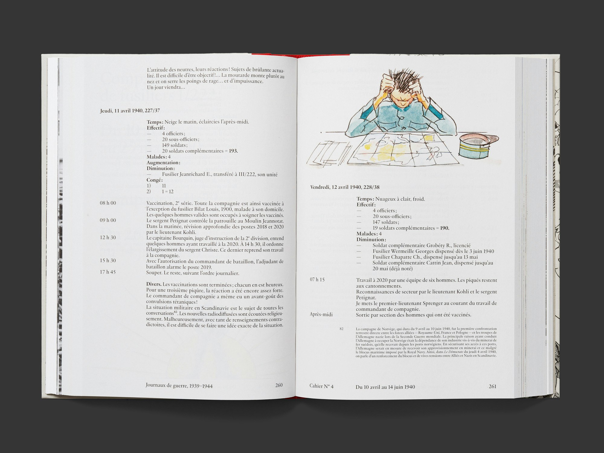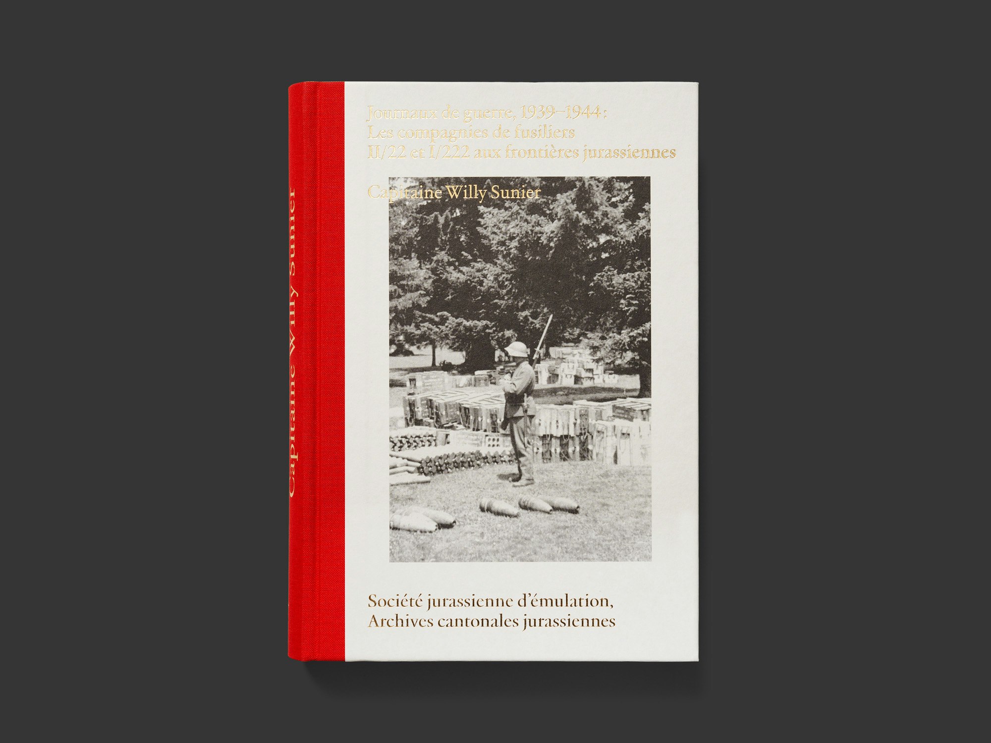 Die militärischen Tagebuchaufzeichnungen eines Hauptmanns der Schweizer Armee aus den 1940er Jahren sind in einem klassisch aussehenden Buch mit grauem Hardcover und rotem Halbleinen versammelt, das im Innern detailreich und intelligent organisiert ist. Zwischen einem wissenschaftlichen Einleitungs- und einem abschliessenden Kommentarteil, die beide auf weissem Papier gedruckt sind, liegen über 600 Seiten Tagebuch aus einem sehr dünnen, grauen Papier. Die regelmässige Gestaltung mit einer Serifenschrift in einheitlicher Grösse, zwei Gewichten und verschiedenen Tabulatoren unterstreicht den bürokratischen Charakter der Aufzeichnungen, welche die oft repetitiven Aktivitäten zu verschiedenen Tageszeiten festhalten. Zahlreiche karikaturhafte Zeichnungen eines Soldaten, der in derselben Kompanie diente, sorgen in unregelmässiger Platzierung für Auflockerung in jeder Hinsicht. Die foliengeprägte Gold-Beschriftung auf Buchrücken und Umschlag verläuft an einer Stelle scheinbar unkontrolliert über das Titelbild, was sich als programmatischer Hinweis auf das gestalterische Vorgehen im Innern des Buchs lesen lässt: Obwohl die Gestaltung das Material nicht umdeutet, ist sie doch auf subtile Weise unkonventionell.