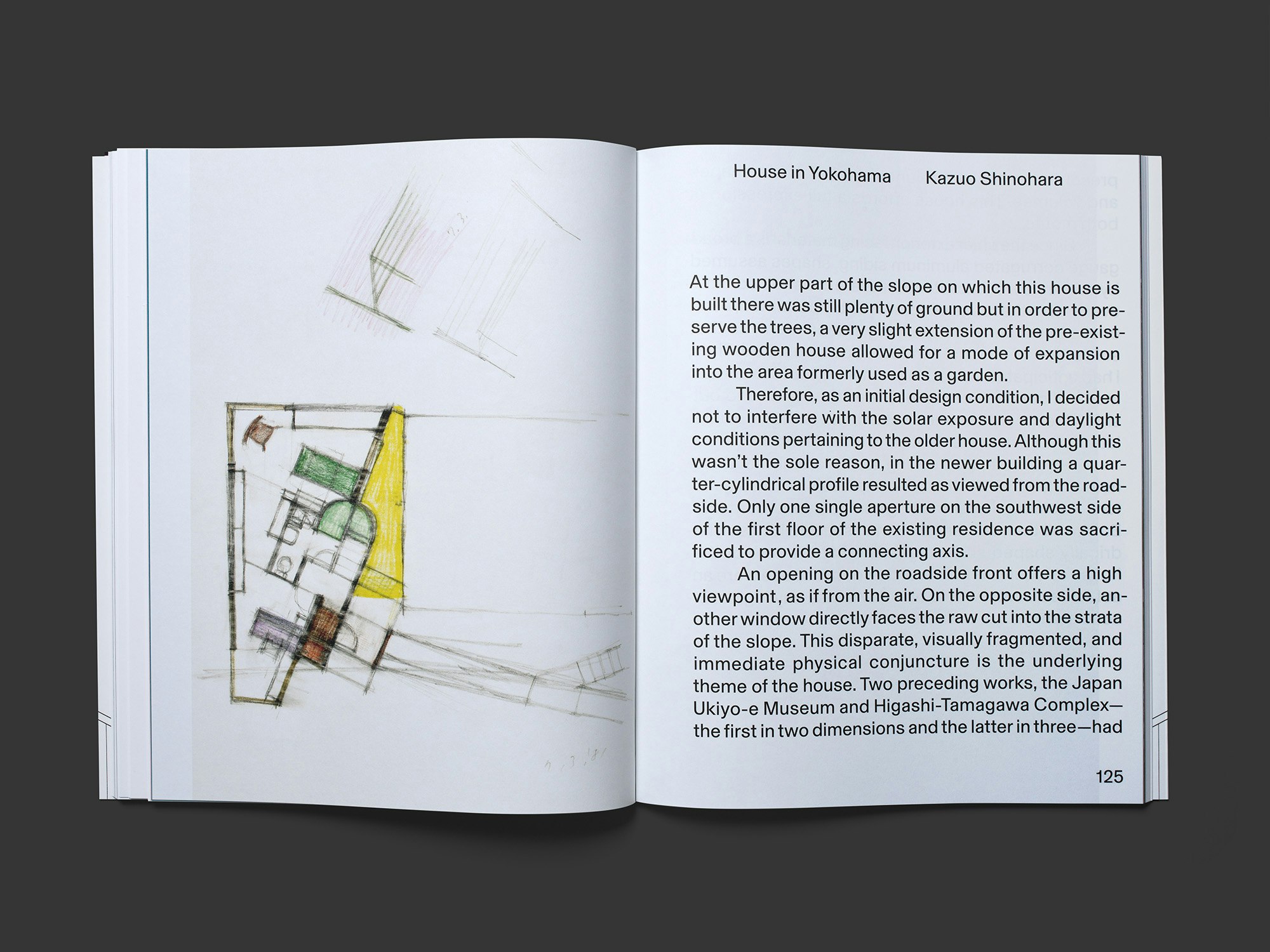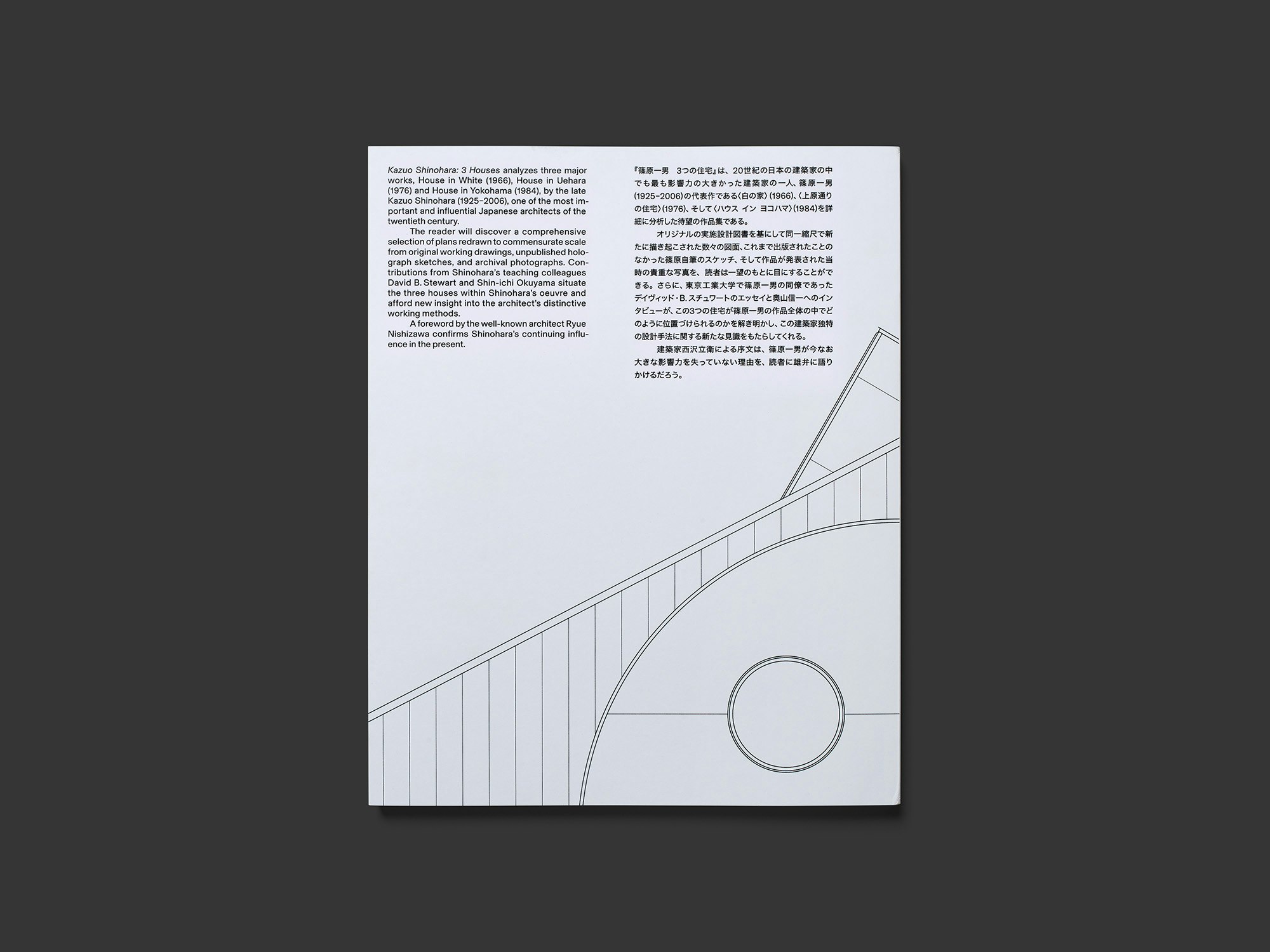 Die überwiegend schwarzweisse Broschur in einem extremen Grossformat präsentiert drei Werke aus verschiedenen Schaffensphasen des japanischen Architekten Kazuo Shinohara (1925–2006) in reichhaltiger, sehr eleganter Gestaltung. Der grafisch wirkende Schutzumschlag; äusserst detailreiche, neu gezeichnete Pläne; hervorragend reproduzierte Schwarzweissfotografien; vereinzelte blassfarbene Skizzen; farbige Blätter zur Trennung der Buchteile; in grosser Schrift deutsch und japanisch gesetzte Kurztexte: Alle Bestandteile sind unabhängig behandelt, ergeben in der Summe aber eine harmonische Einheit. Ein abschliessender längerer Essayteil mit zweispaltigen Texten im Blocksatz wird durch ungewohnte, aber sehr schöne Platzierung der Referenzabbildungen lebendig. Aus allen Perspektiven wird die Architektur grosszügig und wohlwollend gezeigt, sodass sie attraktiv und bisweilen gar sinnlich erscheint. Damit spricht das Buch eine weit über das Fachpublikum hinausreichende Leserschaft an. Dass insgesamt fünf Gestalterinnen und Gestalter verantwortlich zeichnen, verdeutlicht den hohen Aufwand und die Detailversessenheit, mit der hier gearbeitet wurde.