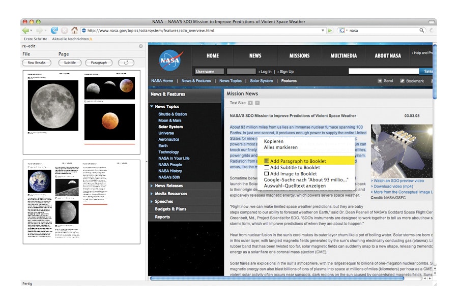 Wer hat nicht genug von den reisserischen Artikeln der Gratiszeitungen, die in 20 Minuten die Welt rekonstruieren? Mit der Internetanwendung von Lukas Zimmer kann der Leser seine Lesegewohnheiten aktiv verändern. Damit entscheidet er selber, was als allmorgendliche Lektüre schwarz auf weiss auf den Tisch kommt. Der junge Grafiker aus Zürich erforscht die Möglichkeiten des neuen Lesens im Internet. Ihn interessiert die Frage, wie sich die Rolle des Autors und des Lesers in einer Zeit verändern, in der sich anstelle des linearen Lesens zunehmend ein fragmentiertes Lesen manifestiert. Zusammen mit einem Programmierer entwickelt er eine frei zugängliche Firefox Browser Extension, die es jedem Internetbenutzer erlaubt, mit wenigen Mausklicken die eigenen Recherchen zu einer handlichen Broschüre zusammenzustellen und auf Papier auszudrucken. Die gefundenen Text- und Bildbausteine werden einfach auf eine übersichtlich gestaltete Arbeitsoberfläche gezogen, in ein bis drei Spalten eingesetzt, mit eigenen Worten ergänzt und in einem persönlichen Layout editiert. Durch die handliche Internetanwendung werden die kaum nachvollziehbaren und meist flüchtigen Kopfreisen von einem Link zum nächsten ohne grossen Aufwand greifbar. Noch vor dem ersten Kaffee, kann so ein beliebiges Thema unkompliziert dokumentiert, in der eigenen Formensprache ergänzt und für eine gebündelte Re-Lektüre verfügbar gemacht werden. 'Re-edit' (Arbeitstitel) ist ein handliches Hilfsmittel für die effiziente Informationssuche im Netz, welches im Moment zwar noch nicht online verfügbar ist, aber hoffentlich in naher Zukunft auf die Struktur des Internets mit ihren Besonderheiten eingeht und in Bezug auf die veränderten Lesegewohnheiten ein brauchbares Mittel darstellt. Mit 'Re-edit' wird loses Wissen visualisiert und handhabbar gemacht: Nicht nur für Leute, die von 'Cut, Copy and Paste' keine Ahnung haben.
