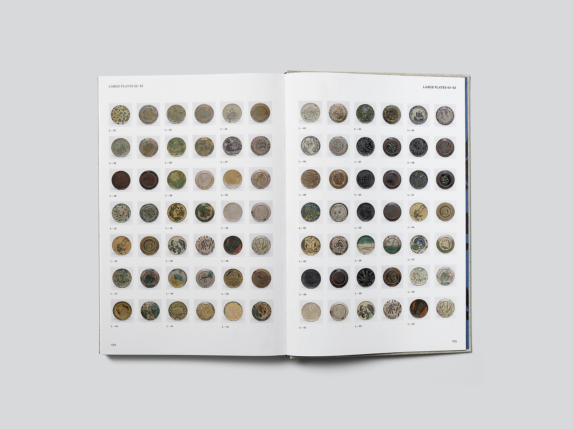 Ein grossformatiger, vergleichsweise dünner Katalog mit schwarz geprägtem Leineneinband präsentiert eine Serie von zeitgenössischen Keramik-Arbeiten in ebenso unkonventioneller wie attraktiver Weise. Rund 300 handbemalte Teller und Gefässe, die der US- Amerikaner Matthew Lutz-Kinoy und die Japanerin Natsuko Uchino in einer andalusischen Töpferei fertigten, erscheinen in einheitlich frontalen Fotografien und freigestellt meist allein, zu zweit oder dritt auf einer Seite. Die Platzierung folgt keinem erkennbaren Raster, lässt viel Weissraum und erzeugt einen ganz eigenen Rhythmus – es wirkt fast wie musikalische Noten in einer Partitur. Gelegentlich werden die Abbildungen durch kurze, klein gesetzte Texte in einer zeitgenössischen Serifenschrift ergänzt, die manchmal um 90 Grad gedreht sind. Dies sind keine Bildlegenden, sondern freie, aber immer gut nachvollziehbare Assoziationen und Zitate, welche z.B. einzelne Muster auf den Keramiken oder die Kunstgeschichte der Töpferei kommentieren. Am Ende folgt auf dünnerem, grauen Papier ein kurzer Textteil mit einem Künstlergespräch und einem Index aller Keramiken sowie Hinweisen auf die im Buch angewandten Abbildungsmassstäbe. Der Leineneinband und das blau-schwarz gemusterte Vorsatzpapier evozieren historische Kunsthandwerkbücher der 1950er- und 1960er Jahre, was trotz der zeitgenössischen Arbeit stimmig wirkt.