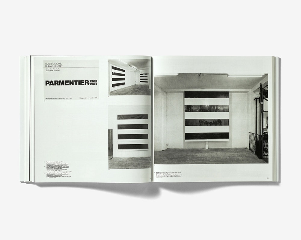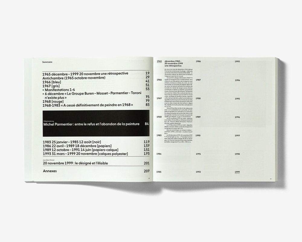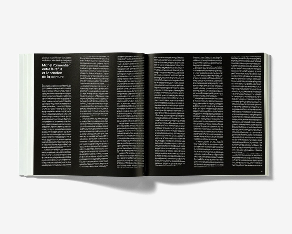 Eine Monografie über den französischen Maler Michel Palmentier (1938-2000) kombiniert geschickt die Genres Werkkatalog und Archivbuch. Die abstrakten, oft schwach farbigen Gemälde werden in grosszügigen Formaten und mit viel Weissraum in chronologischer Anordnung präsentiert. Dazwischenliegende Doppelseiten zeigen überwiegend schwarz-weisses Hintergrundmaterial wie Fotografien des Künstlers, Ausstellungsplakate, Einladungskarten, Rezensionen, Notizen sowie Online-Quellen (letztere auf schwarzen Flächen neu gesetzt). Dadurch werden die Gemälde in ihren Entstehungskontext zurückversetzt, der - zumal in den 1960er- und 1970er-Jahren - von kollektiven Arbeitsformen und performativen Ausstellungsformaten geprägt war. Das ungewohnte, fast quadratische Buchformat und die schmalen, kompakten Textblöcke, die viel Weissraum lassen, nehmen formale Aspekte des Werks auf, ohne die Lektüre zu erschweren. Die spezielle Schrift konkurriert dank sorgfältigem Einsatz das Werk nicht. Ein rohes und direktes Buch mit einer starken Präsenz.