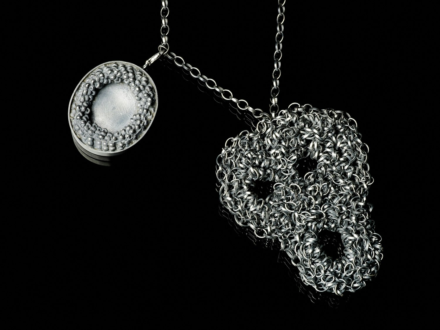 Wie thematisiert man mit Schmuckarbeiten 'ewige' Themen wie Vergänglichkeit, Paarbeziehungen und Familienbande? Monika Strasser, in Zürich zur Goldschmiedin ausgebildet, weilte 2008 in New York. Im 'Garment District', dem Zentrum der New Yorker Modebranche, ging sie auf die Suche nach Modeapplikationen. Sie fand Glasperlen, Pailletten und Strass, wie sie häufig für Brautkleider Verwendung finden. Diese Applikationen hat sie, ganz ohne herkömmliche Goldschmiedewerkzeuge zu benutzen, zerschnitten und neu zusammengesetzt. Schliesslich hat sie Wachsnegative abgenommen und die Formen in Silber gegossen. Das billige Ausgangsmaterial wurde durch diesen Prozess in etwas Dauerhaftes und Werthaltiges verwandelt. Es entstanden acht so genannte 'Bridal Flowers', geheimnisvolle, schwarze Objekte. Wieder zu Hause in der Schweiz fertigte Monika Strasser mit traditionellen Goldschmiedetechniken Schmuckarbeiten, die Gegen- bzw. Partnerstücke zu den in New York entstandenen Objekten sind. Die Broschen und Halsketten nehmen die zum Teil archaisch anmutenden Formen auf und übersetzen sie in eine elegante Sprache. Gefertigt sind sie aus Weissgold oder Silber und sind zum Teil geschwärzt. Sie bilden nun Paare mit den ursprünglichen Objekten und tragen so sprechende Namen wie 'Garten Eden', 'Dark Side of the Honeymoon' oder 'Bis dass der Tod uns scheidet'. Was auf den ersten Blick leicht und verspielt wirkt und verführerische Oberflächen bietet, erscheint beim näheren Hinschauen oft als gebrochen. So etwa, wenn man auf einem ihrer Schmuckobjekte die Augen- und Mundhöhle eines Totenkopfs entdeckt. Vergänglichkeit ist für Monika Strasser ein zentrales Thema.