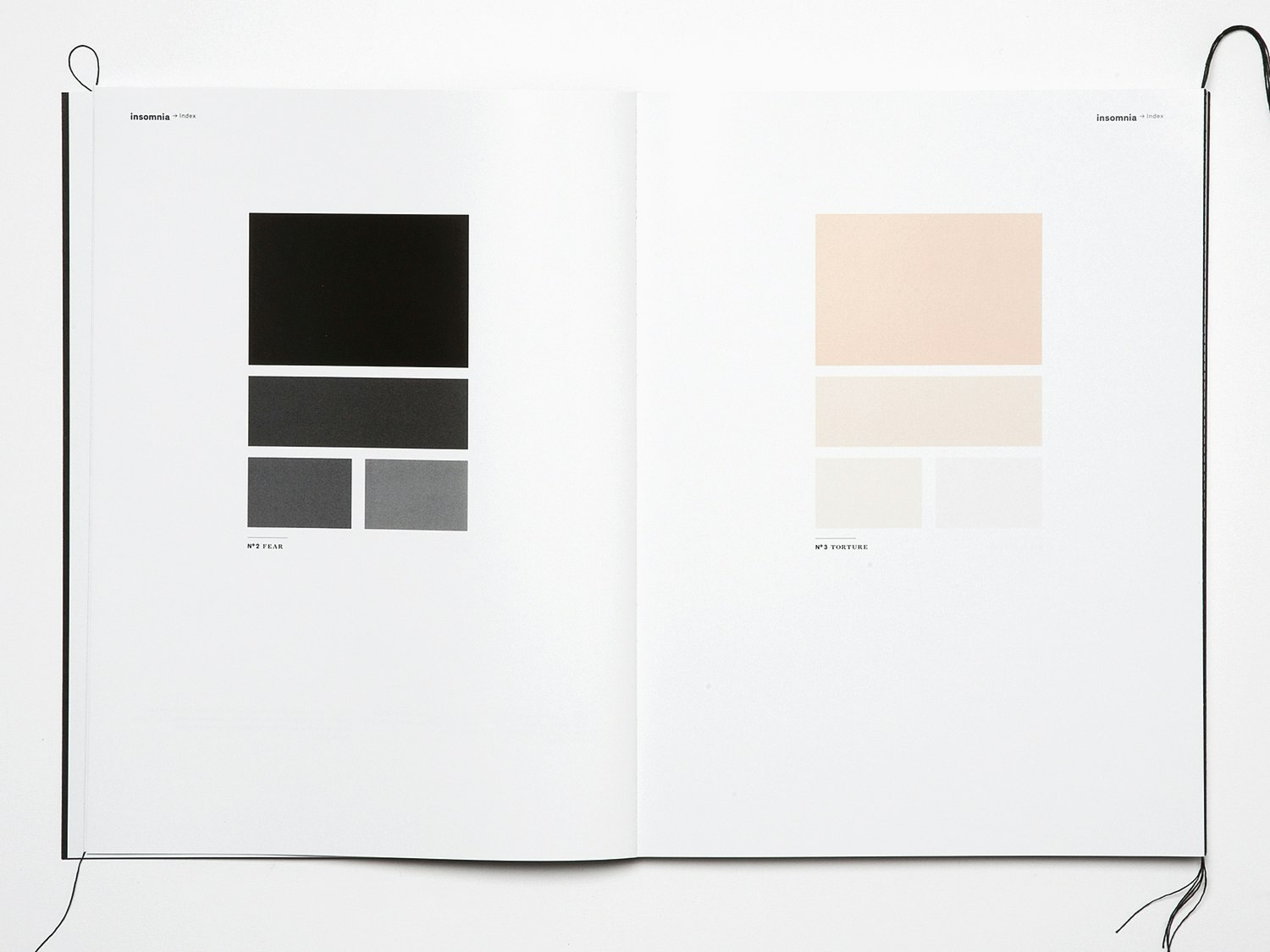 Der Fundus von Albträumen alimentiert sich aus persönlichen Erinnerungen, mit denen im Hauptteil des Magazins gekonnt gespielt wird. Zusammen mit der Modedesignerin haben die Grafikerinnen neun Begriffe geprägt, welche für '...insomnia...' grundlegend sind und diese dann in verschiedene Sequenzen unterteilt, grafisch wie bildlich frei interpretiert und umgesetzt. Die fotografischen Arbeiten fangen Begriffe wie Zwang, Enge, Traum und Realität gekonnt ein. Dem Betrachter schnürt sich die Kehle zusammen beim Anblick der in Gläsern eingezwängten skurrilen Gegenstände. Gleichzeitig verunsichert die grafische Gestaltung mancherorts mit einem Spiel zwischen Tromp-l'Oeil und Realität. Sind die gepressten Blumen echt oder gedruckt?