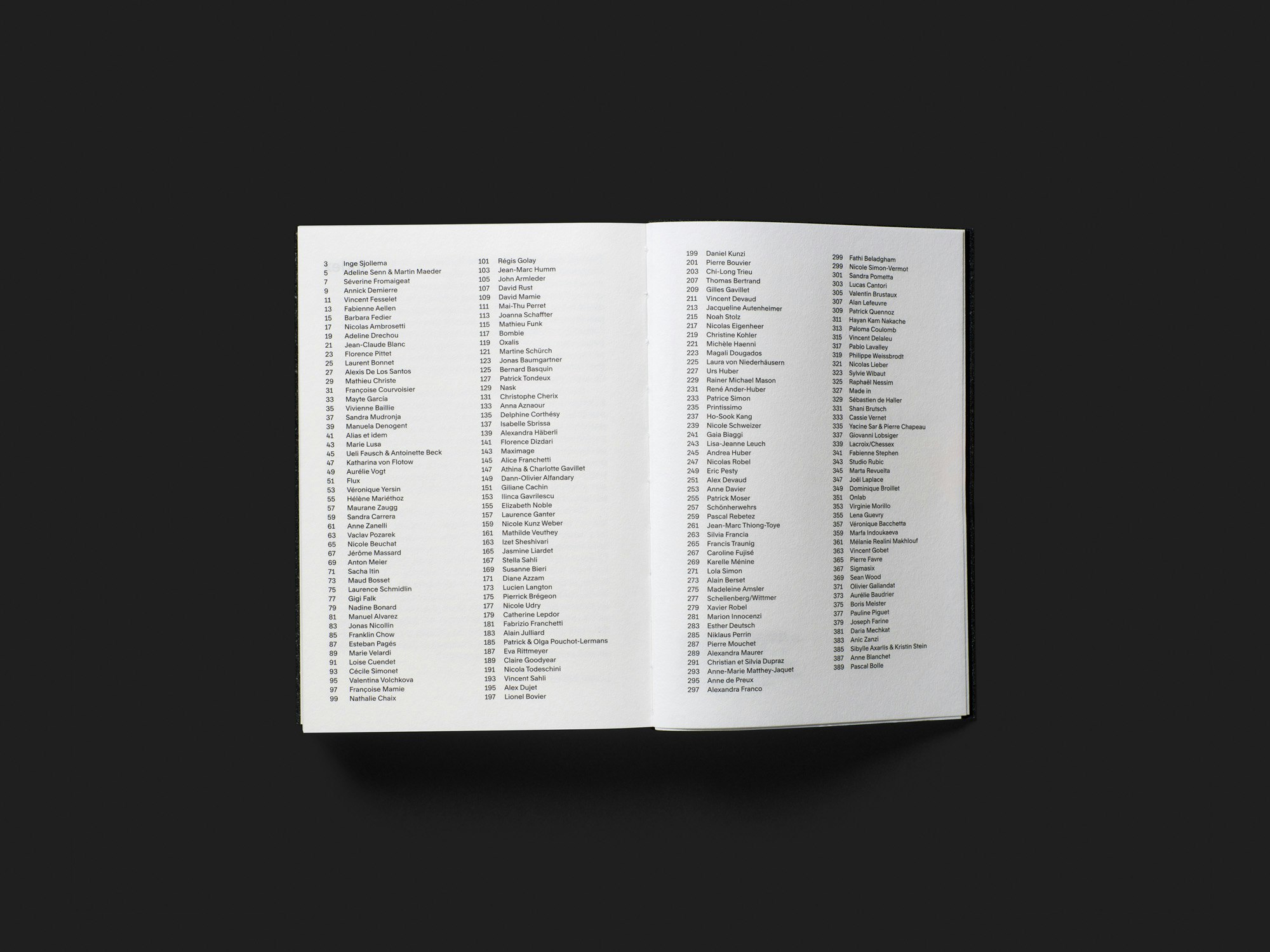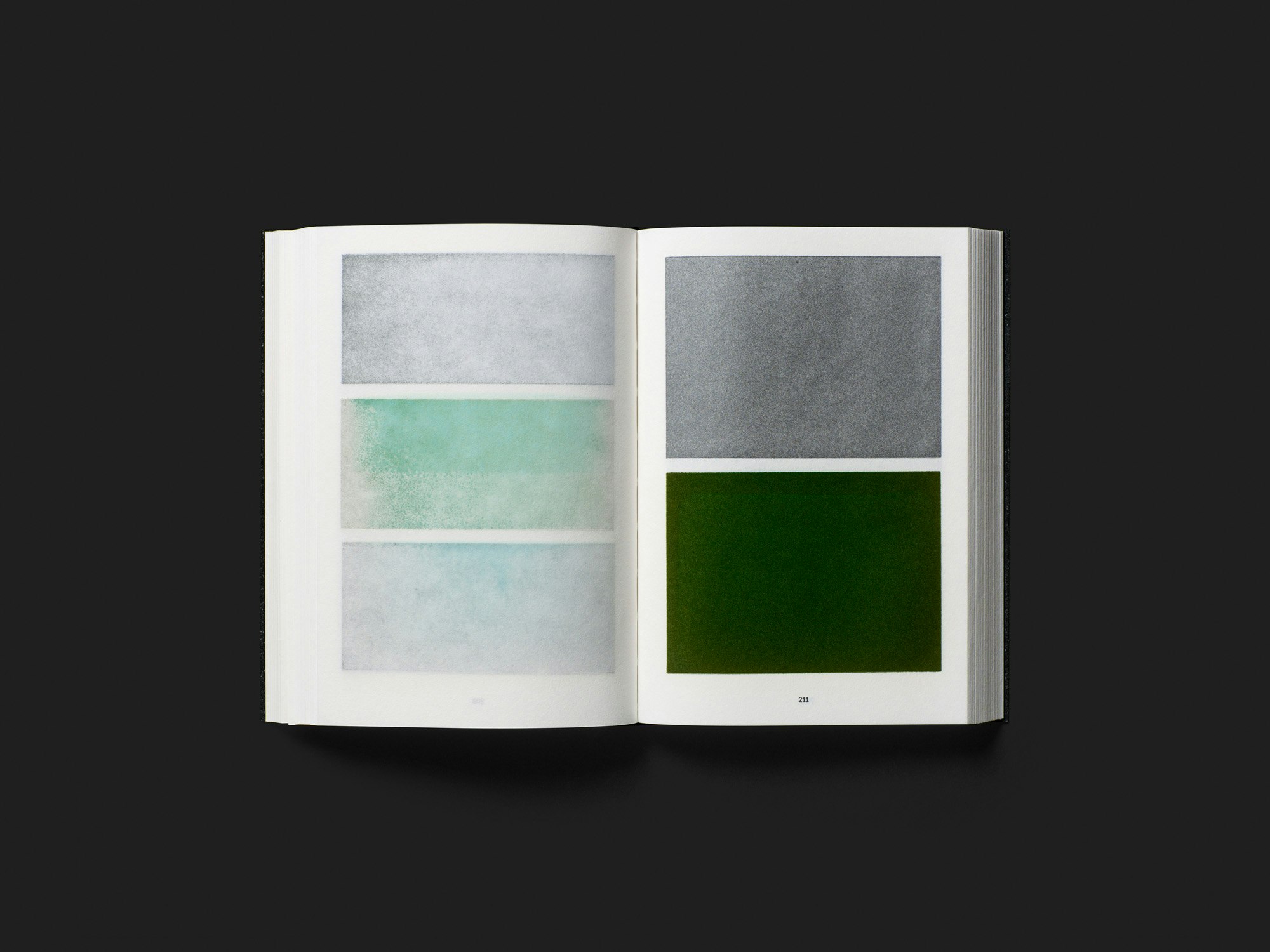In einer kleinformatigen Selbstpublikation mit schwarz auf schwarz geprägtem Umschlag setzt der Drucker Che Huber über 200 Farbtöne als künstlerisches Ausdrucks- und Erinnerungsmittel ein und liefert damit ein eindrückliches Beispiel für sprachlose Kommunikation. Jede rechte Seite trägt zwischen einem und drei immer gleich angeordnete Rechtecke in verschiedensten Farben, und dies verweist jeweils auf eine Person, mit der Huber im Lauf der Jahre zusammenarbeitete. Erst ein Index am Ende listet die Namen auf – es ist das Gegenteil einer pompösen Liste von berühmten «Kunden», vielmehr eine persönliche Liebeserklärung an die Kollaboration. Dass die Farben auf dem dünnen Papier durchdrücken, lässt sich als gestalterisches Statement gegen oberflächliche Arbeitsbeziehungen verstehen. Je nach Vorwissen und Interpretationsstandpunkt können die einzelnen Farben sicherlich ganze Geschichten erzählen. Die beschränkte Grösse und das leichte Papier verhindern, dass das Objekt einen monumentalen Charakter erhält; es liegt perfekt in der Hand und ist in einem guten Mass flexibel. Der ungewöhnlich weiche, mit schwarzen Rechtecken bedruckte Kartonschuber wirkt wie eine aufwendige Geschenkverpackung.