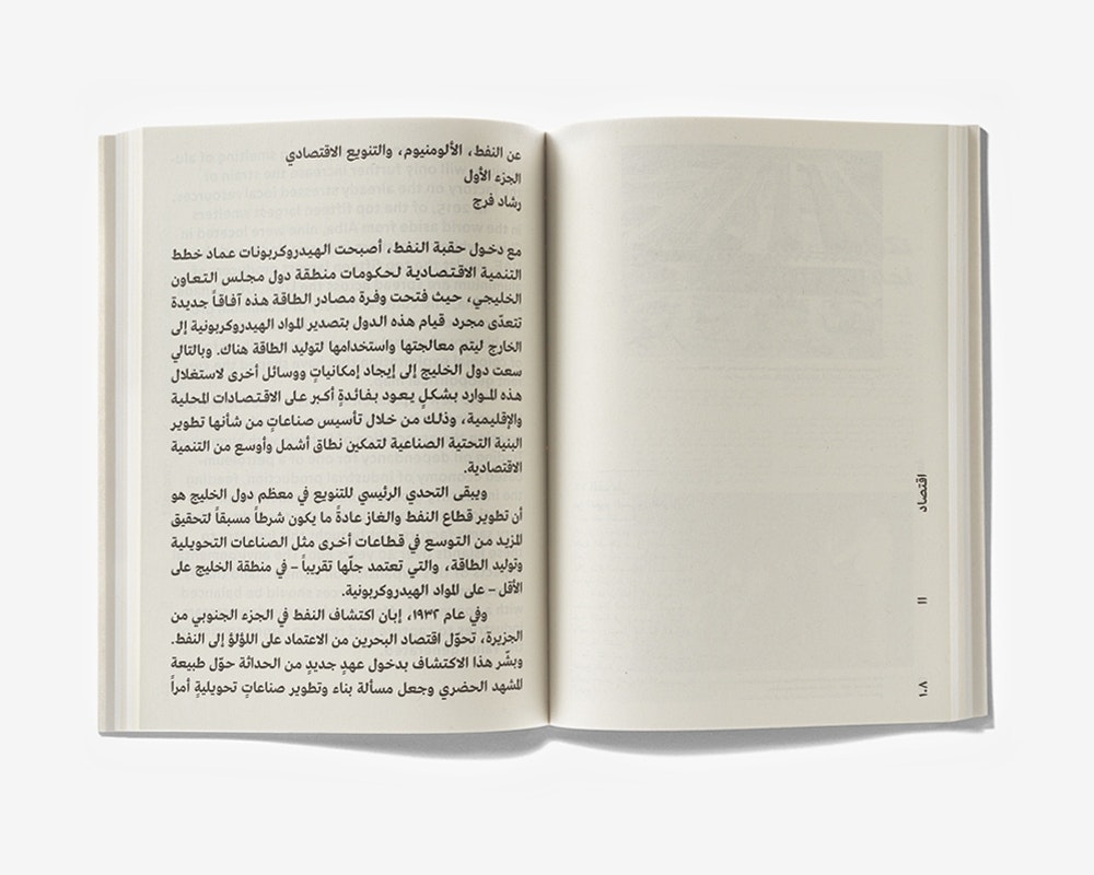 Der Katalog des Königreichs Bahrain für die Architekturbiennale Venedig, vor Ort in Grossauflage gratis abgegeben, dokumentiert die staatliche Aluminiumproduktion. Mit zwei grauen Papieren, zahlreichen hellfarbigen, grob gerasterten Bildern eines Fotografen-Duos sowie mit diversen leeren Seiten wird eine Leichtigkeit evoziert, die gut zum Aluminium passt. Sehr durchdacht sind auch Struktur und Aufbau. Auf dem Vorder- und Rückumschlag findet sich zweimal dasselbe blau-schwarz gedruckte Szenenfoto aus einer Fabrik, doch das eine Mal sind die Arbeiter blau und die Räumlichkeiten schwarz, das andere Mal umgekehrt. Dies verweist zum einen auf die wechselhafte Interaktion von Mensch und Maschine als einem Leitthema des Bandes, zum anderen darauf, dass das Buch von beiden Seiten her gelesen werden kann: auf Englisch von links nach rechts und auf Arabisch von rechts nach links. Die beiden Sprachen erscheinen meist einzeln (und wahlweise bebildert) auf alternierenden Doppelseiten, doch in der Mitte treffen sie sich in zweisprachigen Infografiken.
